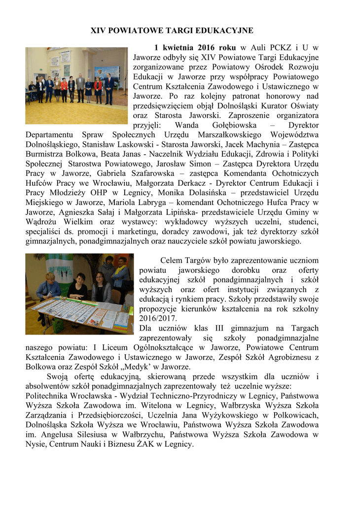 XIV POWIATOWE TARGI EDUKACYJNE 1 kwietnia 2016 roku w Auli PCKZ i U w Jaworze odbyły się XIV Powiatowe Targi Edukacyjne zorganizowane przez Powiatowy Ośrodek Rozwoju Edukacji w Jaworze przy współpracy Powiatowego Centrum Kształcenia Zawodowego i Ustawicznego w Jaworze. Po raz kolejny patronat honorowy nad przedsięwzięciem objął Dolnośląski Kurator Oświaty oraz Starosta Jaworski. Zaproszenie organizatora przyjęli: Wanda Gołębiowska – Dyrektor Departamentu Spraw Społecznych Urzędu Marszałkowskiego Województwa Dolnośląskiego, Stanisław Laskowski - Starosta Jaworski, Jacek Machynia – Zastępca Burmistrza Bolkowa, Beata Janas - Naczelnik Wydziału Edukacji, Zdrowia i Polityki Społecznej Starostwa Powiatowego, Jarosław Simon – Zastępca Dyrektora Urzędu Pracy w Jaworze, Gabriela Szafarowska – zastępca Komendanta Ochotniczych Hufców Pracy we Wrocławiu, Małgorzata Derkacz - Dyrektor Centrum Edukacji i Pracy Młodzieży OHP w Legnicy, Monika Dolasińska – przedstawiciel Urzędu Miejskiego w Jaworze, Mariola Labryga – komendant Ochotniczego Hufca Pracy w Jaworze, Agnieszka Sałaj i Małgorzata Lipińska- przedstawiciele Urzędu Gminy w Wądrożu Wielkim oraz wystawcy: wykładowcy wyższych uczelni, studenci, specjaliści ds. promocji i marketingu, doradcy zawodowi, jak też dyrektorzy szkół gimnazjalnych, ponadgimnazjalnych oraz nauczyciele szkół powiatu jaworskiego. Celem Targów było zaprezentowanie uczniom powiatu jaworskiego dorobku oraz oferty edukacyjnej szkół ponadgimnazjalnych i szkół wyższych oraz ofert instytucji związanych z edukacją i rynkiem pracy. Szkoły przedstawiły swoje propozycje kierunków kształcenia na rok szkolny 2016/2017. Dla uczniów klas III gimnazjum na Targach zaprezentowały się szkoły ponadgimnazjalne naszego powiatu: I Liceum Ogólnokształcące w Jaworze, Powiatowe Centrum Kształcenia Zawodowego i Ustawicznego w Jaworze, Zespół Szkół Agrobiznesu z Bolkowa oraz Zespół Szkół „Medyk’ w Jaworze. Swoją ofertę edukacyjną, skierowaną przede wszystkim dla uczniów i absolwentów szkół ponadgimnazjalnych zaprezentowały też uczelnie wyższe: Politechnika Wrocławska - Wydział Techniczno-Przyrodniczy w Legnicy, Państwowa Wyższa Szkoła Zawodowa im. Witelona w Legnicy, Wałbrzyska Wyższa Szkoła Zarządzania i Przedsiębiorczości, Uczelnia Jana Wyżykowskiego w Polkowicach, Dolnośląska Szkoła Wyższa we Wrocławiu, Państwowa Wyższa Szkoła Zawodowa im. Angelusa Silesiusa w Wałbrzychu, Państwowa Wyższa Szkoła Zawodowa w Nysie, Centrum Nauki i Biznesu ŻAK w Legnicy. Propozycję dla absolwentów szkół przygotował także: Dolnośląski Wojewódzki Urząd Pracy Centrum Informacji i Planowania Kariery Zawodowej w Legnicy, Centrum Edukacji i Pracy Młodzieży OHP w Legnicy oraz Powiatowy Urząd Pracy w Jaworze. W trakcie trwania spotkania w auli PCKZ w Jaworze przy ul. Dworcowej, młodzież gimnazjalna mogła (zgodnie z wcześniej ustalonym harmonogramem) odwiedzić w ramach „dnia otwartego” Powiatowe Centrum Kształcenia Zawodowego i Ustawicznego przy ul. Wrocławskiej oraz I Liceum Ogólnokształcące w Jaworze przy ul. Kościuszki. Gimnazjaliści mogli zwiedzić szkołę i w czasie bezpośrednich spotkań z uczniami, nauczycielami, jak i dyrekcją każdej z tych szkół, zapoznać się z kierunkami kształcenia i ofertą zajęć pozalekcyjnych danej placówki. Targi cieszyły się dużym zainteresowaniem przede wszystkim wśród młodzieży, a także nauczycieli powiatu jaworskiego. Dzięki nim, oprócz gimnazjalistów, również młodzież szkół ponadgimnazjalnych mogła zapoznać się z proponowaną ofertą edukacyjną. Targi odwiedziło około 600 osób. W czasie trwania Targów można było posilić się przygotowanym przez organizatorów poczęstunkiem, którzy wsparli hojnie sponsorzy: właściciele cukierni i piekarni: Martex - p. Stanisław Furtak, p. Jerzy Frydrych, p. Żołnierczyk Sabina, Żołnierczyk Jarosław, Michalska Małgorzata, p. Grażyna Maciejowska, p. Ryszard Tabor Balinka. Program spotkania uświetniły występy artystyczne przygotowane przez uzdolnioną młodzież PCKZ i U w Jaworze oraz I LO w Jaworze: taniec w wykonaniu Marcina Szajnowskiego ucznia PCKZ i U, program artystyczny kl. I c I Liceum Ogólnokształcącego pt. „Taniec z chirurgami”, utwór muzyczny Wiktoria Lesiak uczennicę PCKZ i U, skecz kabaretu Paranienormalni pt: „Papieros” w wykonaniu Oliwii Radzimskiej i Jakuba Jaskórzyńskiego z kl. II c I Liceum Ogólnokształcącego, skecz kabaretu Ani Mru Mru pt: „Supermarket” w wykonaniu Agaty Wojtasik i Hanny Kosińskiej, uczennic I Liceum Ogólnokształcącego, taniec współczesny w wykonaniu Agaty Puchały, uczennicy kl. II b I Liceum Ogólnokształcącego, utwór muzyczy uczennice z kl. II e PCKZ i U, uczeń Ochotniczego Hufca Pracy i PCKZ i U Norbert Papiacki - utwór muzyczny, taniec zespołu cheerlederek z PCKZ i U. Dyrektor Powiatowego Ośrodka Rozwoju Edukacji w Jaworze dziękuje dyrektorom szkół, nauczycielom, uczniom i wszystkim zaproszonym gościom oraz wystawcom za udział w tegorocznej imprezie. Szczególne podziękowanie za pomoc, gościnność i wyrozumiałość przy pracach związanych z przygotowaniem i przeprowadzeniem Targów skład pani Lucynie Buczkowskiej – dyrektorowi i zaangażowanym nauczycielom PCKZ i U w Jaworze.