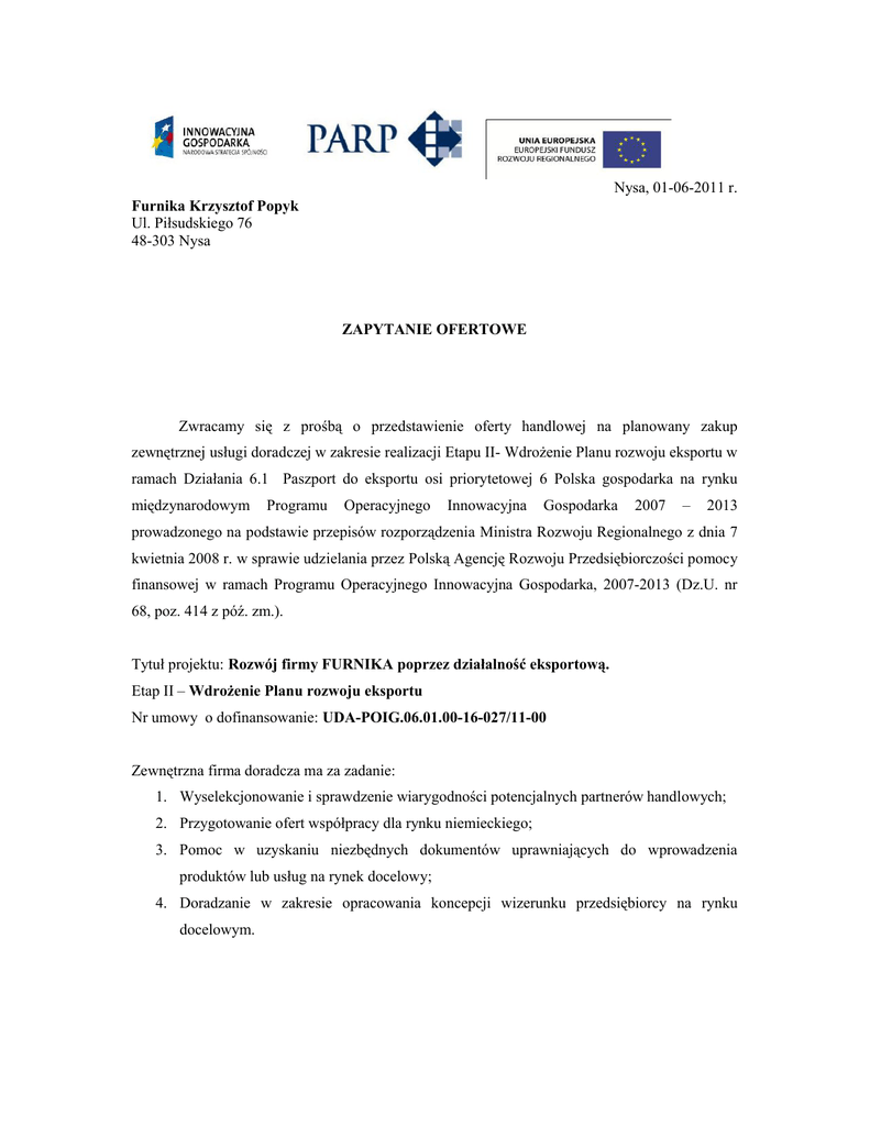 Nysa, 01-06-2011 r. Furnika Krzysztof Popyk Ul. Piłsudskiego 76 48-303 Nysa ZAPYTANIE OFERTOWE Zwracamy się z prośbą o przedstawienie oferty handlowej na planowany zakup zewnętrznej usługi doradczej w zakresie realizacji Etapu II- Wdrożenie Planu rozwoju eksportu w ramach Działania 6.1 Paszport do eksportu osi priorytetowej 6 Polska gospodarka na rynku międzynarodowym Programu Operacyjnego Innowacyjna Gospodarka 2007 – 2013 prowadzonego na podstawie przepisów rozporządzenia Ministra Rozwoju Regionalnego z dnia 7 kwietnia 2008 r. w sprawie udzielania przez Polską Agencję Rozwoju Przedsiębiorczości pomocy finansowej w ramach Programu Operacyjnego Innowacyjna Gospodarka, 2007-2013 (Dz.U. nr 68, poz. 414 z póź. zm.). Tytuł projektu: Rozwój firmy FURNIKA poprzez działalność eksportową. Etap II – Wdrożenie Planu rozwoju eksportu Nr umowy o dofinansowanie: UDA-POIG.06.01.00-16-027/11-00 Zewnętrzna firma doradcza ma za zadanie: 1. Wyselekcjonowanie i sprawdzenie wiarygodności potencjalnych partnerów handlowych; 2. Przygotowanie ofert współpracy dla rynku niemieckiego; 3. Pomoc w uzyskaniu niezbędnych dokumentów uprawniających do wprowadzenia produktów lub usług na rynek docelowy; 4. Doradzanie w zakresie opracowania koncepcji wizerunku przedsiębiorcy na rynku docelowym. Złożona oferta powinna zawierać: 1. nazwę i adres oferenta, 2. datę sporządzenia, 3. termin ważności oferty, 4. informację na temat zakresu przedmiotowego opracowania, 5. cenę całkowitą netto i brutto wykonania usługi, 6. informację na temat maksymalnego terminu płatności, 7. informację na temat warunków płatności (przelew, gotówka) 8. informację na temat doświadczenia w handlu w branży oświetlenia do mebli 9. informacje na temat znajomości biegle języka niemieckiego w mowie i piśmie, Oferta powinna być sporządzona na papierze firmowym oferenta i/lub być opatrzona pieczątką firmową, posiadać datę sporządzenia oraz powinna być podpisana przez oferenta, według zasad reprezentacji. Oferta powinna być ważna minimum do: 31-07-2013 r. Oferta powinna być przesłana pocztą, kurierem lub doręczona osobiście za potwierdzeniem odbioru na adres siedziby firmy wskazanej na pierwszej stronie. Zapytanie ofertowe zamieszczono również na stronie internetowej i w siedzibie zamawiającego w miejscu publicznie dostępnym. Termin składania ofert upływa w dniu: 21-06-2011. o godz. 15.00 Oferty dostarczone po określonym wyżej terminie nie będą rozpatrywane. W trakcie trwania konkursu ofert nie będą udzielane żadne informacje, które mogłyby mieć wpływ na treść składanych ofert. Wybór najkorzystniejszej oferty nastąpi w oparciu o następujące kryteria: Lp. Nazwa 1. Cena całkowita za usługę Sposób oceny Maksymalna ilość punktów 10 do 120 000 pln netto – 10 pkt. pow. 120 000 pln netto – 0 pkt. 2 10 Maksymalny termin płatności za usługę pow. 91 dni od dnia wystawienia – 10 pkt. 61-90 dni od dnia wystawienia– 5 pkt. do 60 dni od dnia wystawienia – 0 pkt. 3 Warunki płatności 10 przelew – 10 pkt. gotówka– 0 pkt. 4 Znajomość języka niemieckiego 10 biegle w mowie i piśmie- 10 pkt tylko w mowie- 5 pkt w stopniu podstawowym – 0 pkt 5 Doświadczenie handlowe w branży oświetlenia do mebli. 10 posiada stałych odbiorców – 10 pkt. nie posiada stałych odbiorców – 5 pkt. nie posiada doświadczenia – 0 pkt Razem 50 Zamawiający wybierze najkorzystniejszą ofertę, która uzyska najwyższą ilość punktów w oparciu o ustalone kryteria i podpisze umowę z wybranym wykonawcą. W przypadku uzyskania takiej samej ilości punktów przez dwóch oferentów, o miejscu na liście rankingowej zadecyduje termin złożenia oferty (oferta złożona wcześniej będzie wyżej na liście). Krzysztof Popyk
