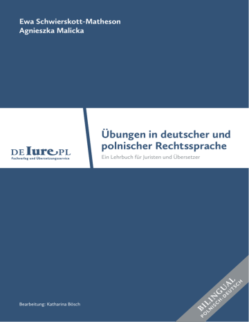 Ewa Schwierskott-Matheson Agnieszka Malicka Übungen in deutscher und polnischer Rechtssprache G -D N H C LI IS BI LN 1 PO Bearbeitung: Katharina Bösch TS EU U H C AL Ein Lehrbuch für Juristen und Übersetzer Inhalt KAPITEL I WICHTIGE GRUNDLEGENDE BEGRIFFE ......................................................................................................................... 9 Lektion 1 – Juristische Berufe ...................................................................................................................................................... 10 Lektion 2 – Rechtsgebiete ................................................................................................................................................................ 11 Lektion 3 – Struktur der Rechtsakte im polnischen und deutschen Rechtssystem............ 12 Lektion 4 – Ordnung – Verfahren – Prozessrecht.................................................................................................. 14 Lektion 5 – Klage ....................................................................................................................................................................................... 15 Lektion 6 – Gerichte .............................................................................................................................................................................. 17 Lektion 7 – Grundlegende Rechtsbegriffe – Struktur der Rechtsnormen................................... 22 Lektion 8 – Grundlegende Rechtsbegriffe in Sätzen, Teil 1 ......................................................................... 25 Lektion 9 – Grundlegende Rechtsbegriffe in Sätzen, Teil 2 ......................................................................... 27 Lektion 10 – Grundlegende Rechtsbegriffe in Sätzen, Teil 3...................................................................... 29 Lektion 11 – Wichtige Verben..................................................................................................................................................... 30 Lektion 12 – Wiederholung ........................................................................................................................................................... 32 KAPITEL II VERFASSUNGSRECHT ...................................................................................................................................................................... 35 Lektion 13 – Grundlegende Begriffe aus dem Verfassungsrecht, Teil I ........................................... 38 Lektion 14 – Grundrechte I............................................................................................................................................................ 40 Lektion 15 – Grundrechte II.......................................................................................................................................................... 41 Lektion 16 – Grundlegende Begriffe aus dem Verfassungsrecht, Teil II......................................... 42 Lektion 17 – Grundlegende Begriffe aus dem Verfassungsrecht, Teil III ...................................... 44 Lektion 18 – Wichtige Verben aus dem Verfassungsrecht, Teil I ......................................................... 47 Lektion 19 – Wichtige Verben aus dem Verfassungsrecht, Teil II......................................................... 49 Lektion 20 – Wichtige Verben aus dem Verfassungsrecht, Teil III ..................................................... 51 Lektion 21 – Wiederholung ........................................................................................................................................................... 53 Lektion 22 – Wiederholung ........................................................................................................................................................... 55 KAPITEL III VERWALTUNGSRECHT .................................................................................................................................................................. 57 Lektion 23 – Grundlegende Begriffe aus dem Verwaltungsrecht, Teil I ......................................... 59 Lektion 24 – Grundlegende Begriffe aus dem Verwaltungsrecht, Teil II ....................................... 62 Lektion 25 – Grundlegende Begriffe aus dem Verwaltungsrecht, Teil III ..................................... 67 5 KAPITEL IV BÜRGERLICHES RECHT UND HANDELSRECHT .............................................................................................. 73 Lektion 26 – Verträge, Teil I .......................................................................................................................................................... 78 Lektion 27 – Grundlegende Begriffe im Zivilrecht, Teil I .............................................................................. 81 Lektion 28 – Grundlegende Begriffe im bürgerlichen Recht, Teil II................................................... 83 Lektion 29 – Grundlegende Begriffe im bürgerlichen Recht, Teil III ................................................ 85 Lektion 30 – Grundlegende Begriffe im bürgerlichen Recht, Teil IV ............................................... 87 Lektion 31 – Grundlegende Begriffe im bürgerlichen Recht, Teil V ................................................. 89 Lektion 32 – Verträge im Zivilgesetzbuch ..................................................................................................................... 91 Lektion 33 – Handelsrecht – grundlegende Begriffe........................................................................................... 93 Lektion 34 – Wiederholung – Zivil– und Handelsrecht .................................................................................. 96 KAPITEL V STRAFRECHT.............................................