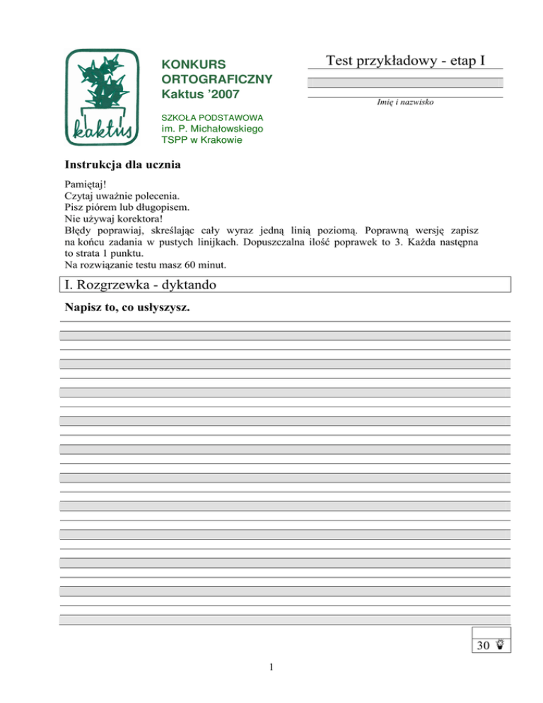 KONKURS ORTOGRAFICZNY Kaktus ’2007 Test przykładowy - etap I Imię i nazwisko SZKOŁA PODSTAWOWA im. P. Michałowskiego TSPP w Krakowie Instrukcja dla ucznia Pamiętaj! Czytaj uwaŜnie polecenia. Pisz piórem lub długopisem. Nie uŜywaj korektora! Błędy poprawiaj, skreślając cały wyraz jedną linią poziomą. Poprawną wersję zapisz na końcu zadania w pustych linijkach. Dopuszczalna ilość poprawek to 3. KaŜda następna to strata 1 punktu. Na rozwiązanie testu masz 60 minut. I. Rozgrzewka - dyktando Napisz to, co usłyszysz. 30 1 II. Królestwo kaktusów, czyli wyrazy z u i ó RozwiąŜ krzyŜówkę, odczytaj i wpisz hasło. 1. 2. 3. 4. 5. 6. 7. 8. Kaktus to inaczej 1. Jabłko ma rumianą, Ŝaba ma zieloną, a człowiek moŜe mieć białą, czarną, Ŝółtą lub czerwoną. 2. DuŜy deszcz. 3. Córka króla. 4. Skwar, gorąco. 5. Pan Hilary zerknął do niego i znalazł swoje okulary. 6. Kontynent, na którym mieszkamy. 7. UŜywasz go, gdy chcesz coś pokroić. 8. Nazwa figury o trzech bokach. ____________________________. Wpisz hasło 9 III. śarty kaktusa, czyli wyrazy z rz i Ŝ wzbuona aba na góe waka na łyce księyc na olbymim dewie skydlaty baga 10 2 IV. Zabawa w „chowanego”, czyli wyrazy z „h” i „ch” Kaktus zasłonił literę „h” lub „ch”. Przepisz obok wyrazy, uzupełniając je. usarska orągiew aft krzyŜykowy odowla rabina zu i ipopotamów elena arcerz 10 Miejsce na poprawę błędów: 59 3