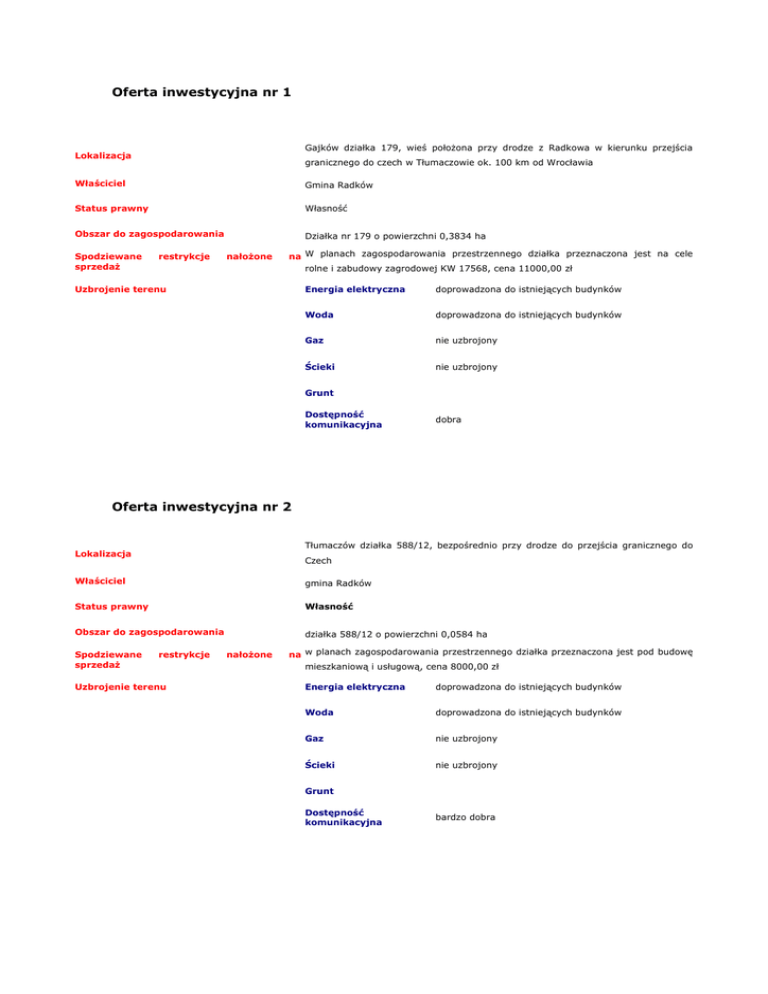 Oferta inwestycyjna nr 1 Gajków działka 179, wieś położona przy drodze z Radkowa w kierunku przejścia Lokalizacja granicznego do czech w Tłumaczowie ok. 100 km od Wrocławia Właściciel Gmina Radków Status prawny Własność Obszar do zagospodarowania Działka nr 179 o powierzchni 0,3834 ha Spodziewane sprzedaż restrykcje nałożone na W planach zagospodarowania przestrzennego działka przeznaczona jest na cele rolne i zabudowy zagrodowej KW 17568, cena 11000,00 zł Uzbrojenie terenu Energia elektryczna doprowadzona do istniejących budynków Woda doprowadzona do istniejących budynków Gaz nie uzbrojony Ścieki nie uzbrojony Grunt Dostępność komunikacyjna dobra Oferta inwestycyjna nr 2 Tłumaczów działka 588/12, bezpośrednio przy drodze do przejścia granicznego do Lokalizacja Czech Właściciel gmina Radków Status prawny Własność Obszar do zagospodarowania działka 588/12 o powierzchni 0,0584 ha Spodziewane sprzedaż restrykcje Uzbrojenie terenu nałożone na w planach zagospodarowania przestrzennego działka przeznaczona jest pod budowę mieszkaniową i usługową, cena 8000,00 zł Energia elektryczna doprowadzona do istniejących budynków Woda doprowadzona do istniejących budynków Gaz nie uzbrojony Ścieki nie uzbrojony Grunt Dostępność komunikacyjna bardzo dobra Oferta inwestycyjna nr 3 Raszków działka 20/5, wieś położona na obszarach gminy Radków z dala od Lokalizacja głównych szlaków komunikacyjnych Właściciel gmina Radków Status prawny Własność Obszar do zagospodarowania działka nr 20/5 o powierzchni 0,1833 ha Spodziewane sprzedaż restrykcje nałożone na w planach zagospodarowania przestrzennego działka przeznaczona jest na cele rolne i zabudowy zagrodowe, cena 4500,00 zł Uzbrojenie terenu Energia elektryczna doprowadzona do istniejących budynków Woda doprowadzona do istniejących budynków Gaz nie uzbrojony Ścieki nie uzbrojony Grunt Dostępność komunikacyjna dobra Oferta inwestycyjna nr 4 Raszków działka 16/2, wieś położona na obszarach gminy Radków z dala od Lokalizacja głównych szlaków komunikacyjnych Właściciel gmina Radków Status prawny Własność Obszar do zagospodarowania działka nr 16/2 o powierzchni 0,1184 ha Spodziewane sprzedaż restrykcje Uzbrojenie terenu nałożone na w planach zagospodarowania przestrzennego działka przeznaczona jest na cele rolne i zabudowy zagrodowe, cena 4000,00 zł Energia elektryczna doprowadzona do istniejących budynków Woda doprowadzona do istniejących budynków Gaz nie uzbrojony Ścieki nie uzbrojony Grunt Dostępność komunikacyjna dobra Oferta inwestycyjna nr 5 Radków ul. Grunwaldzka, działka położona w pobliżu drogi prowadzącej do przejścia Lokalizacja granicznego do Czech Radków-Bożanov Właściciel gmina Radków Status prawny Własność Obszar do zagospodarowania działka nr 157/5 o powierzchni 1,1347 ha Spodziewane sprzedaż restrykcje nałożone na w planach zagospodarowania przestrzennego działka przeznaczona jest na cele rolne KW nr 17264, cena 10000,00 zł Uzbrojenie terenu Energia elektryczna Woda Gaz Ścieki Grunt Dostępność komunikacyjna dobra Oferta inwestycyjna nr 6 Radków ul. słoneczna w pobliżu budynków komunalnych przy ul Piastowskiej ok.700 Lokalizacja m od centrum Radkowa, w pobliżu drogi wojewódzkiej z Kłodzka do Kudowy Zdrój Właściciel gmina Radków Status prawny Własność Obszar do zagospodarowania 26 działek o pow. 0,0021 ha każda, kompletna dokumentacja na budowę garaży Spodziewane sprzedaż restrykcje Uzbrojenie terenu nałożone zgodnie z miejscowym planem zagospodarowania –przestrzennego miasta i gminy na Radków działki przeznaczone pod budowę kompleksu garaży, cena 1500,00 za jedną działkę Energia elektryczna doprowadzona do istniejących budynków Woda doprowadzona do istniejących budynków Gaz doprowadzona do istniejących budynków Ścieki w budowie kolektor sanitarny Grunt Dostępność komunikacyjna dobra Oferta inwestycyjna nr 7 Lokalizacja Radków ul. Spadzista 5, budynek położony ok. 100 m od rynku Właściciel gmina Radków Status prawny Własność działka nr 969 pow.0,0139 ha zabudowana budynkiem gospodarczym o powierzchni Obszar do zagospodarowania Spodziewane sprzedaż restrykcje 69,45 m2 z możliwością adaptacji na cele prowadzenia działalności gospodarczej nałożone na Uzbrojenie terenu KW nr 17313, cena 15 000,00 zł Energia elektryczna uzbrojona Woda uzbrojona Gaz brak Ścieki w budowie kolektor sanitarny Grunt Dostępność komunikacyjna dobra Oferta inwestycyjna nr 8 Radków ul. Słoneczna 29, osiedle domków jednorodzinnych usytuowane ok. 500 m od centrum Radkowa. w pobliżu drogi wojewódzkiej z kłodzka do Kudowy zdrój od strony południowej widok na panoramę Gór Stołowych. Odległość od Wrocławia ok. Lokalizacja 100km Właściciel gmina Radków Status prawny Własność Obszar do zagospodarowania Spodziewane sprzedaż restrykcje Uzbrojenie terenu działka nr 954 pow.0,0360 ha nałożone zgodnie z miejscowym planem zagospodarowania przestrzennego miasta i gminy na Radków działka przeznaczona jest pod budownictwo mieszkaniowe typu bliźniaczego niewyposażona w urządzenia infrastruktury technicznej, cena 90000,00 Energia elektryczna doprowadzona do istniejących budynków Woda doprowadzona do istniejących budynków Gaz doprowadzona do istniejących budynków Ścieki w budowie kolektor sanitarny Grunt Dostępność komunikacyjna dobra Oferta inwestycyjna nr 9 Lokalizacja Karłów, działka położona w centrum Gór Stołowych Właściciel gmina Radków Status prawny Własność Obszar do zagospodarowania działka nr 207 pow. 0,2606 ha Spodziewane sprzedaż restrykcje nałożone zgodnie z miejscowym planem zagospodarowania przestrzennego miasta i gminy na Radków działka przeznaczona na cele rolne z możliwością zabudowy zagrodowej i mieszkaniowej, cena 20 000,00 zł Uzbrojenie terenu Energia elektryczna Woda Gaz Ścieki Grunt Dostępność komunikacyjna dobra Of