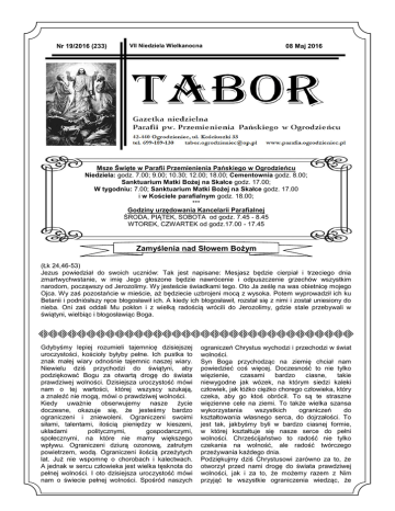 Nr 19/2016 (233) VII Niedziela Wielkanocna 08 Maj 2016 Msze więte w Parafii Przemienienia Pańskiego w Ogrodzieńcu NiedzielaŚ godz. 7.00ś 9.00ś 10.30ś 12.00ś 18.00ś Cementownia godz. 8.00ś Sanktuarium Matki Bożej na Skałce godz. 17.00ś W tygodniuŚ 7.00ś Sanktuarium Matki Bożej na Skałce godz. 17.00 i w Ko ciele parafialnym godz. 18.00ś *** Godziny urzędowania Kancelarii Parafialnej RODA, PI TźK, SOBOTA od godz. 7.45 - 8.45 WTORźK, CZWARTźK od godz.17.00 - 17.45 Zamy lenia nad Słowem Bożym (Łk 24,46-53) Jezus powiedział do swoich uczniówŚ Tak jest napisaneŚ Mesjasz będzie cierpiał i trzeciego dnia zmartwychwstanie, w imię Jego głoszone będzie nawrócenie i odpuszczenie grzechów wszystkim narodom, pocz wszy od Jerozolimy. Wy jeste cie wiadkami tego. Oto Ja ze lę na was obietnicę mojego Ojca. Wy za pozostańcie w mie cie, a będziecie uzbrojeni moc z wysoka. Potem wyprowadził ich ku Betanii i podniósłszy ręce błogosławił ich. A kiedy ich błogosławił, rozstał się z nimi i został uniesiony do nieba. Oni za oddali Mu pokłon i z wielk rado ci wrócili do Jerozolimy, gdzie stale przebywali w wi tyni, wielbi c i błogosławi c Boga. żdyby my lepiej rozumieli tajemnicę dzisiejszej uroczysto ci, ko cioły byłyby pełne. Ich pustka to znak małej wiary odno nie tajemnic naszej wiary. Niewielu dzi przychodzi do wi tyni, aby podziękować Bogu za otwart drogę do wiata prawdziwej wolno ci. Dzisiejsza uroczysto ć mówi nam o tej warto ci, której wszyscy szukaj , a znale ć nie mog , mówi o prawdziwej wolno ci. Kiedy uwa nie obserwujemy nasze ycie doczesne, okazuje się, e jeste my bardzo ograniczeni i zniewoleni. Ograniczeni swoimi siłami, talentami, ilo ci pieniędzy w kieszeni, układami politycznymi, gospodarczymi, społecznymi, na które nie mamy większego wpływu. Ograniczeni dziur ozonow , zatrutym powietrzem, wod . Ograniczeni ilo ci prze ytych lat. Ju nie wspomnę o chorobach i kalectwach. A jednak w sercu człowieka jest wielka tęsknota do pełnej wolno ci. I oto dzisiejsza uroczysto ć mówi nam o wiecie pełnej wolno ci. Spo ród naszych ograniczeń Chrystus wychodzi i przechodzi w wiat wolno ci. Syn Boga przychodz c na ziemię chciał nam powiedzieć co więcej. Doczesno ć to nie tylko więzienie, czasami bardzo ciasne, takie niewygodne jak wózek, na którym siedzi kaleki człowiek, jak łó ko cię ko chorego człowieka, który czeka, aby go kto obrócił. To s te straszne więzienne cele na ziemi. To tak e wielka szansa wykorzystania wszystkich ograniczeń do kształtowania własnego serca, do dojrzało ci. To jest tak, jakby my byli w bardzo ciasnej formie, w której kształtuje się nasze serce do pełni wolno ci. Chrze cijaństwo to rado ć nie tylko czekania na wolno ć, ale rado ć twórczego prze ywania ka dego dnia. Podziękujmy dzi Chrystusowi zarówno za to, e otworzył przed nami drogę do wiata prawdziwej wolno ci, jak i za to, e mo emy razem z Nim przyj ć te wszystkie ograniczenia wiedz c, e Str. 2 Tabor kształtuj one nasze serce. Tu jest czas na zasługę, tu jest czas na dojrzewanie. A poniewa ka dego z nas rze bi inne ograniczenia, kształtuje się w nich indywidualno ć niepowtarzalna. Nie ma na wiecie dwu identycznych ludzi. Ka dy człowiek EUCHARYSTYCZNY to niepowtarzalne arcydzieło, które wielbić będzie Boga w wiecie pełnej wolno ci przez wieki. Zanie my dzi do Boga dziękczynienie za wiat wolno ci, do którego zmierzamy, i dziękczynienie za to, e Syn Boga nauczył nas w ziemskich ograniczeniach kształtować nasze serce. SAVOIR-VIVRE KATOLIKA-POLAKA CD.... piewać (nie) każdy może Koniecznie zatem trzeba szukać rozwi zań tych próbie mów, bo ka dy z nas czuje, e piękny, wspólny piew ludu Bo ego podczas liturgii i poza ni to skarb, którego nie wolno stracić. Co mo na i co trzeba w tej sprawie zrobić? * Systematycznie wtajemniczać wiernych w sens obrzędów liturgicznych (komentarze liturgiczne, katechezy, konferencje, artykuły w prasie parafialnej itp.). * Wprowadzić kantorów, którzy będ aktywni podczas całego nabo eństwa. * Powrócić do osobistego modlitewnika, przynoszonego na nabo eństwa lub/i zabezpieczyć odpowiedni liczbę takich ksi eczek do u ytku podczas nabo eństw Na wy wietlaczu lub specjalnej tablicy podawać kolejne numery pie ni, które maj być wykonywane. (Zwyczaj ten stosowany jest nie tylko za granicą. Praktyka pokazuje, że przez długi czas książeczki trafiają na swoje miejsce (tuż przy wejściu do kościoła) i wbrew opiniom pesymistów - nie giną. Całą operację rozdawania i składania tychże książeczek na miejsce znakomicie mogliby usprawnić ministranci lub inni członkowie służby liturgicznej w danej parafii.) * Zamiast rzutnika (sposób o wiele gorszy ni in dywidualne ksi eczki) mo na wykorzystać no wocze niejsze wy wietlacze tekstów. (Choćby ze względu na trudności w znalezieniu odpowiedniego miejsca dla jego instalacji tak, by wszyscy mogli dobrze widzieć ekran i nie rozpraszali swojej uwagi. Warto też pamiętać o wielu ludziach z osłabionym wzrokiem, dla których jedynym skutecznym rozwiązaniem jest książeczka z powiększonym drukiem.) * Wykorzystać wszystkie zwrotki danej pie ni lub tak jej czę ć, by wyra ała ona pełn tre ć przekazywanej prawdy teologicznej. (W końcu takie było założenie biblia pauperum: wprowadzać wiernych w tajemnice Objawienia poprzez pieśń, w której zawarte było integralne przesłanie teologiczne i katechetyczne. Można wskazać na kilka klasycznych przykładów. Np. pieśni Archanioł Boży Gabryjel absolutnie nie można przerwać po drugiej zwrotce; pierwsza zwrotka pieśni Serce Twe, Jezu, miłością goreje również domaga się dopowiedzenia; chętnie w niektórych miejscach śpiewana przed komunią św. pieśń Tu jest miejsce utajenia po zakończeniu modlitwy na pierwszej zwrotce jest wręcz herezją o słodkiej melodii.) * Przemy leć godziny sprawowania liturgii i nabo eństw, by mak