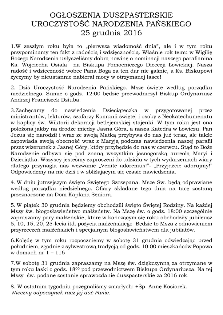 OGŁOSZENIA DUSZPASTERSKIE UROCZYSTOŚĆ NARODZENIA PAŃSKIEGO 25 grudnia 2016 1.W zeszłym roku była to „pierwsza wiadomość dnia”, ale i w tym roku przypominamy ten fakt z radością i wdzięcznością. Właśnie rok temu w Wigilię Bożego Narodzenia usłyszeliśmy dobrą nowinę o nominacji naszego parafianina Ks. Wojciecha Osiala na Biskupa Pomocniczego Diecezji Łowickiej. Nasza radość i wdzięczność wobec Pana Boga za ten dar nie gaśnie, a Ks. Biskupowi życzymy by nieustannie nabierał mocy w otrzymanej łasce! 2. Dziś Uroczystość Narodzenia Pańskiego. Msze święte według porządku niedzielnego. Sumie o godz. 12:00 będzie przewodniczył Biskup Ordynariusz Andrzej Franciszek Dziuba. 3.Zachęcamy do nawiedzenia Dzieciąteczka w przygotowanej przez ministrantów, lektorów, szafarzy Komunii świętej i osoby z Neokatechumenatu w kaplicy św. Wiktorii dekoracji betlejemskiej stajenki. W tym roku jest ona położona jakby na drodze między Jasną Górą, a naszą Katedrą w Łowiczu. Pan Jezus się narodził i wraz ze swoją Matką przybywa do nas już teraz, ale także zapowiada swoją obecność wraz z Maryją podczas nawiedzenia naszej parafii przez wizerunek z Jasnej Góry, który przybędzie do nas w czerwcu. Stąd to Boże Narodzenie odbywa się pod znaną wszystkim jasnogórską aureolą Maryi i Dzieciątka. Wszyscy jesteśmy zaproszeni do udziału w tych wydarzeniach wiary dlatego przynagla nas wezwanie „Venite adoremus!”- „Przyjdźcie adorujmy!” Odpowiedzmy na nie dziś i w zbliżającym się czasie nawiedzenia. 4. W dniu jutrzejszym święto Świętego Szczepana. Msze Św. będą odprawiane według porządku niedzielnego. Ofiary składane tego dnia na tacę zostaną przeznaczone na Dom Kapłana Seniora. 5. W piątek 30 grudnia będziemy obchodzili święto Świętej Rodziny. Na każdej Mszy św. błogosławieństwo małżeństw. Na Mszę św. o godz. 18:00 szczególnie zapraszamy pary małżeńskie, które w kończącym się roku obchodziły jubileusz 5, 10, 15, 20, 25-lecia itd. pożycia małżeńskiego Będzie to Msza z odnowieniem przyrzeczeń małżeńskich i specjalnym błogosławieństwem dla jubilatów. 6.Kolędę w tym roku rozpoczniemy w sobotę 31 grudnia odwiedzając przed południem, zgodnie z sylwestrową tradycją od godz. 10:00 mieszkańców Popowa w domach nr 1 – 116 7.W sobotę 31 grudnia zapraszamy na Mszę św. dziękczynną za otrzymane w tym roku łaski o godz. 1800 pod przewodnictwem Biskupa Ordynariusza. Na tej Mszy św. podane zostanie sprawozdanie duszpasterskie za 2016 rok. 8. W ostatnim tygodniu pożegnaliśmy zmarłych: +Śp. Annę Kosiorek. Wieczny odpoczynek racz jej dać Panie.