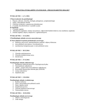 TEMATYKA WYKŁADÓW Z PATOLOGII – PIELĘGNIARSTWO 2016-2017 WYKŁAD NR 1 – 6. X. 2016 I Wprowadzenie do patofizjologii 1. Pojęcia: zdrowie, choroba, etiologia, patogeneza, symptomatologia 2. Etapy i klasyfikacja chorób 3. Choroba wrodzona, a genetyczna (dziedziczna) 4. Czynniki chorobotwórcze i czynniki ryzyka II Zapalenie 1. Czynniki zapalne 2. Mechanizm zapalenia: zmiany naczyniowe, odpowiedź białokrwinkowa oraz mediatory zapalenia 3. Podział zapaleń, objawy miejscowe i ogólnoustrojowe WYKŁAD NR 2 – 13.X.2016 I Patofizjologia układu sercowo-naczyniowego II Niewydolność krążenia pochodzenia sercowego: definicja, przyczyny, patomechanizm, podział i objawy kliniczne niewydolność serca prawo i lewokomorowa mechanizmy kompensacyjne w niewydolności serca WYKŁAD NR 3 – 20.X.2016 1. Choroba nadciśnieniowa 2. Choroba niedokrwienna serca 3. Zawał serca WYKŁAD NR 4 – 27.X.2016 Patofizjologia układu oddechowego 1. Patogeneza zaburzeń procesów fizjologicznych płuc 2. Niewydolność oddechowa 3. ARDS - zespół ostrej niewydolności oddechowej 4. Przewlekła obturacyjna choroba płuc (POChP) 5. Astma oskrzelowa 6. Zapalenie płuc WYKŁAD NR 5 – 3.XI.2016 Patofizjologia układu wydalniczego 1. Kamica nerkowa 2. Ostra i przewlekła niewydolność nerek 3. Stany zapalne nerek 4. Zespół nerczycowy 5. Choroby pęcherza moczowego 6. Nietrzymanie moczu WYKŁAD NR 6 - 10.XI.2016 Patofizjologia układu nerwowego 1. Objawy neurologiczne 2. Udar mózgu 3. Choroba Parkinsona 4. Choroba Alzheimera WYKŁD (1/2) – 17.XI.2016 KOLOKWIUM NR 1 WYKŁAD NR 7 – 24.XI.2016 Patofizjologia układu pokarmowego 1. Zaburzenia połykania 2. Choroby przełyku, GERD 3. Choroba wrzodowa żołądka i dwunastnicy 4. Rak żołądka 5. Choroby wątroby: WZW, przewlekłe zapalenie wątroby, marskość wątroby WYKŁAD NR 8 – 1.XII.2016 Patofizjologia układu pokarmowego c.d. 1. Ostre i przewlekłe zapalenie trzustki, rak trzustki 2. Nieswoiste stany zapalne jelit, rak jelita grubego WYKŁAD NR 9 – 8.XII.2016 Patofizjologia układu dokrewnego 1. Choroby przysadki mózgowej 2. Choroby tarczycy i przytarczyc 3. Choroby nadnerczy WYKŁAD NR 11 (1/2) – TERMIN do ustalenia – KOLOKWIUM NR 2 TEMATYKA SEMINARIUM – PATOLOGIA PIELĘGNIARSTWO 2016-2017 SEMINARIUM NR 1 – 10, 11, 12, 14. X. 2016 I. Odporność 1. Pojęcia: antygen, przeciwciało 2. Odporność swoista i nieswoista, nabyta i wrodzona, wrodzone i nabyte niedobory odporności 3. Komórki układu immunologicznego: limfocyty, monocyty i makrofagi, komórki prezentujące antygen (APC) 4. Odpowiedź immunologiczna humoralna i komórkowa 5. Odpowiedź immunologiczna pierwotna i wtórna, komórki pamięci immunologicznej II. Nadwrażliwość 1. Typy reakcji nadwrażliwości (I – IV) i ich przykłady 2. Rodzaje chorób alergicznych, wstrząs anafilaktyczny III Autoimmunizacja 1. Autotolerancja immunologiczna i autoimmunizacja 2. Rodzaje chorób autoimmunizacyjnych SEMINARIUM NR 2 – 17, 18, 19, 21. X. 2016 I Zaburzenia przemian aminokwasów: fenyloketonuria, alkaptonuria, albinizm II Zaburzenia przemian tłuszczów: 1. Metabolizm cholesterolu, lipoproteiny LDL i HDL 2. Pierwotne i wtórne dyslipidemie 3. Miażdżyca: przyczyny, czynniki ryzyka, mechanizm, etapy powstawania blaszki miażdżycowej, rodzaje blaszek miażdżycowych, objawy i następstwa miażdżycy III Zaburzenia przemian węglowodanów – cukrzyca 1. Kryteria diagnostyczne cukrzycy 2. Pojęcie, przyczyny, rodzaje cukrzycy (typ I, typ II, LADA, MODY, ciążowa) i objawy 3. Ostre powikłania cukrzycy – kwasica ketonowa 4. Przewlekłe powikłania cukrzycy: mikro i makroangiopatie, neuropatie cukrzycowe i stopa cukrzycowa SEMINARIUM NR 3 - 24, 25, 26, 28. X. 2016 Choroby układu krążenia 1. Zaburzenia rytmu serca 2. Wady serca 3. Kardiomiopatie 4. Zapalenie mięśnia sercowego SEMINARIUM NR 4 – 4, 7, 8, 9. XI. 2016 Choroby układu oddechowego 1. Choroby restrykcyjne płuc 2. Rak płuc 3. Nadciśnienie płucne 4. Zatorowość płucna 5. Serce płucne 6. Choroby zawodowe płuc 7. Gruźlica 8. Choroby opłucnej 9. Mukowiscydoza SEMINARIUM NR 5 – 14, 15, 16, 18. XI. 2016 Ból 1. Nocycepcja, przewodzenie, percepcja i modulacja czucia bólu 2. Ból - etiopatogeneza, podział, cechy bólu, skale badania bólu 3. Ból przewlekły: definicja, patomechanizm, rodzaje, objawy i skutki 4. Przyczyny i charakterystyka bólu nowotworowego, zwyrodnieniowego, neuropatycznego, fantomowego, ośrodkowego 5. Bóle głowy: migrena, ból napięciowy, klasterowy 6. Reakcje ustroju na ból Choroby układu nerwowego 1. Padaczka 2. SM 3. Choroby zapalne układu nerwowego: zapalenie opon mózgowo-rdzeniowych, zapalenie mózgu 4. Miastenia SEMINARIUM NR 6 – 21, 22, 23, 25. XI. 2016 Patologia nowotworów 1. Etapy karcinogenezy i rodzaje karcinogenów (chemiczne, fizyczne, biologiczne) 2. Rola genów w karcinogenezie 3. Cechy komórek nowotworowych 4. Symptomatologia nowotworów 5. Zespoły paraneoplastyczne 6. Markery nowotworowe SEMINARIUM NR 7 – 28, 29, 30. XI.2016, 2. XII. 2016 Choroby układu pokarmowego 1. Biegunki i zaparcia 2. Żółtaczki 3. WZW 4. Krwawienia z przewodu pokarmowego SEMINARIUM NR 8 – 5, 6, 7, 9. XII. 2016 I Patologia układu czerwonokrwinkowego: 1. Niedokrwistości: mikrocytowe (z niedoboru żelaza), normocytowe (z utraty krwi, hemolityczna), makrocytowe (megaloblastyczna) 2. Nadkrwistości: czerwienica prawdziwa, nadkrwistość wtórna II Patologia układu białokrwinkowego: 1. Ostre białaczki 2. Przewlekłe zespoły mieloproliferacyjne: przewlekła białaczka szpikowa 3. Przewlekłe zespoły limfoproliferacyjne: przewlekła białaczka limfocytowa, chłoniaki 4. Szpiczak mnogi III Zaburzenia krzepnięcia: 1. Skazy krwotoczne: osoczowe, płytkowe, naczyniowe 2. Zakrzepica 3. DIC SEMINARIUM NR 9 – 12, 13, 14, 16. XII.2016, 1. Wstrząs 2. Oparzenie i choroba oparzeniowa SEMINARIUM NR 10 – 19, 20, 21.XII.2016, 13. I. 2017 Zaburzenia wodno-elektrolitowe 1. Odwodnien