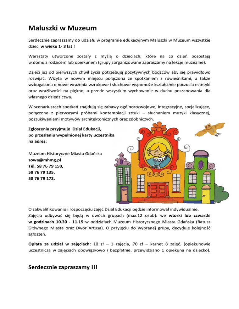 Maluszki w Muzeum Serdecznie zapraszamy do udziału w programie edukacyjnym Maluszki w Muzeum wszystkie dzieci w wieku 1- 3 lat ! Warsztaty utworzone zostały z myślą o dzieciach, które na co dzień pozostają w domu z rodzicem lub opiekunem (grupy zorganizowane zapraszamy na lekcje muzealne). Dzieci już od pierwszych chwil życia potrzebują pozytywnych bodźców aby się prawidłowo rozwijać. Wizyta w nowym miejscu połączona ze spotkaniem z rówieśnikami, a także wzbogacona o nowe wrażenia wzrokowe i słuchowe wspomoże kształcenie poczucia estetyki oraz wrażliwości na piękno, a przede wszystkim wychowanie w duchu poszanowania dla własnego dziedzictwa. W scenariuszach spotkań znajdują się zabawy ogólnorozwojowe, integracyjne, socjalizujące, połączone z pierwszymi próbami kontemplacji sztuki – słuchaniem muzyki klasycznej, poszukiwaniami motywów architektonicznych oraz zdobniczych. Zgłoszenia przyjmuje Dział Edukacji, po przesłaniu wypełnionej karty uczestnika na adres: Muzeum Historyczne Miasta Gdańska [email protected] Tel. 58 76 79 150, 58 76 79 135, 58 76 79 172. O zakwalifikowaniu i rozpoczęciu zajęć Dział Edukacji będzie informował indywidualnie. Zajęcia odbywać się będą w dwóch grupach (max.12 osób): we wtorki lub czwartki w godzinach 10.30 - 11.15 w oddziałach Muzeum Historycznego Miasta Gdańska (Ratusz Głównego Miasta oraz Dwór Artusa). O przyjęciu do wybranej grupy, decyduje kolejność zgłoszeń. Opłata za udział w zajęciach: 10 zł – 1 zajęcia, 70 zł – karnet 8 zajęć. (opiekunowie uczestniczą w zajęciach obowiązkowo i bezpłatnie, przewidziano 1 opiekuna na dziecko). Serdecznie zapraszamy !!! Karta uczestnika Maluszki w Muzeum Imię i nazwisko dziecka: …………………………..……………………………………………………….. Wiek dziecka: …………………………………………………………………………………………………… Imię i nazwisko opiekuna: …………………………………………………………………………………. Adres e-mail do kontaktu: ………………………………………………………………………………… Nr telefonu do kontaktu: ..………………………………………………………………………………… Wybór dnia zajęć: WTOREK Muzeum Historyczne Miasta Gdańska [email protected] Tel. 58 76 79 150, 58 76 79 135, 58 76 79 172. CZWARTEK
