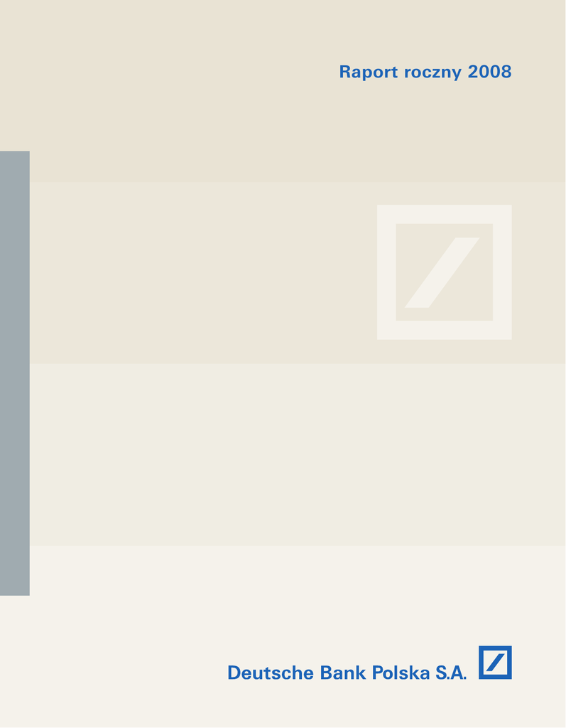 Raport roczny 2008 01 // Grupa deutsche bank Wyniki Grupy Deutsche Bank AG w ciągu minionych trzech lat Bilans (w mln EUR) Aktywa ogółem Kredyty i pożyczki Zobowiązania ogółem Kapitał własny ogółem Udziały mniejszości Kapitał kategorii I Kapitał regulacyjny ogółem Rachunek zysków i strat (w mln EUR) Wynik z tytułu odsetek Rezerwy celowe Przychody z tytułu opłat i prowizji Zysk (strata) netto na aktywach/zobowiązaniach finansowych wycenianych według wartości godziwej przez wynik finansowy Pozostałe przychody nieodsetkowe Przychody nieodsetkowe ogółem Wynagrodzenia i świadczenia Koszty ogólnego zarządu Wypłaty na rzecz posiadaczy polis i zgłoszone szkody Odpisy z tytułu utraty wartości dla wartości niematerialnych i prawnych Koszt działań restrukturyzacyjnych Koszty nieodsetkowe ogółem Zysk/(strata) brutto (przed opodatkowaniem podatkiem dochodowym) Podatek dochodowy zapłacony/(należny) Zysk/(strata) netto Zysk/(strata) netto przypadający na akcjonariuszy mniejszościowych Zysk/(strata) netto przypadający na akcjonariuszy Deutsche Bank Podstawowe dane Zysk na jedną akcję Rozwodniony zysk na jedną akcję Dywidenda na jedną akcję wypłacona w okresie sprawozdawczym Rentowność średniego kapitału własnego (po opodatkowaniu) Rentowność średniego kapitału własnego (przed opodatkowaniem) Wskaźnik kosztów do dochodów Wskaźnik kapitału kategorii I� Wskaźnik kapitału ogółem� Liczba pracowników (w przeliczeniu na pełne etaty) 2008 2007 2006 2 202 423 269 281 2 170 509 30 703 1 211 31 094 37 396 1 925 003 198 892 1 885 688 37 893 1 422 28 320 38 049 1 520 580 178 524 1 486 694 33 169 717 23 539 34 309 2008 2007 2006 12 453 1 076 9 749 8 849 612 12 289 7 008 298 11 195 (9 992) 1 280 1 037 9 606 8 216 (252) 585 - 18 155 (5 741) (1 845) (3 896) (61) (3 835) 7 175 2 432 21 896 13 122 7 954 193 128 (13) 21 384 8 749 2 239 6 510 36 6 474 8 892 1 399 21 486 12 498 7 069 67 31 192 19 857 8 339 2 260 6 079 9 6 070 2008 2007 2006 € (7,61) € (7,61) € 4,50 (11,10%) (16,50%) 134,6% 10,1% 12,2% 80 456 € 13,65 € 13,05 € 4,00 17,9% 24,1% 69,6% 8,6% 11,6% 78 291 € 12,96 € 11,48 € 2,50 20,3% 27,9% 69,7% 8,5% 12,5% 68 849 � Wskaźniki za rok 2008 prezentowane są zgodnie ze zmienionymi zasadami przedstawionymi przez Komitet Bazylejski w 2004 roku (”Nowa Umowa Kapitałowa”) wprowadzonymi do niemieckiego systemu prawnego na mocy niemieckiej Ustawy o bankach i Rozporządzenia o wypłacalności (”Solvabilitätsverordnung”). Wskaźniki za lata 2007 i 2006 prezentowane są zgodnie z zasadami Pierwszej Bazylejskiej Umowy Kapitałowej, w związku z czym nie są porównywalne. SPIS TREŚCI 01 // Grupa Deutsche Bank Wyniki Grupy Deutsche Bank AG w ciągu minionych trzech lat Władze Banku 2 5 02 // Sprawozdanie Zarządu Główne wydarzenia w 2008 roku 7 Zewnętrzne warunki działania Grupy Kapitałowej 8 Bankowość korporacyjna i inwestycyjna w Deutsche Bank Polska S.A. 10 Bankowość transakcyjna – zarządzanie środkami finansowymi przedsiębiorstw i finansowanie handlu w Deutsche Bank Polska S.A. 11 Obsługa instytucji finansowych w Deutsche Bank Polska S.A. 12 Działalność powiernicza w Deutsche Bank Polska S.A. 13 Operacje na rynku pieniężnym i walutowym w Deutsche Bank Polska S.A. 14 Działalność maklerska w DB Securities S.A. 14 Nowoczesne technologie informatyczne w Deutsche Bank Polska S.A. 14 Zarządzanie ryzykiem w Grupie Kapitałowej 16 Sytuacja organizacyjna i finansowa 21 Struktura przychodów z tytułu odsetek w 2008 roku 24 Struktura przychodów z tytułu prowizji w 2008 roku 24 Kierunki rozwoju 24 03 // Skonsolidowane sprawozdanie finansowe Skonsolidowany rachunek zysków i strat Skonsolidowany bilans Zestawienie zmian w skonsolidowanym kapitale własnym Skonsolidowany rachunek przepływów pieniężnych Noty do skonsolidowanego sprawozdania finansowego 28 28 29 30 31 04 // Pozostałe informacje Opinia niezależnego biegłego rewidenta 77 01 // Grupa deutsche bank Nasza tożsamość Względna stabilność w czasie kryzysu. Nasza tożsamość Jesteśmy czołowym bankiem inwestycyjnym o zasięgu światowym, posiadającym silną markę na rynku usług dla zamożnych Klientów prywatnych. Jesteśmy liderem w Niemczech i Europie, obecnie umacniamy pozycję w Ameryce Północnej, Azji oraz na kluczowych rynkach wschodzących. Nasza misja Rywalizując o pozycję światowego lidera w zakresie usług finansowych dla wymagających Klientów, tworzymy wyjątkową wartość dla akcjonariuszy i społeczeństwa. Nasza pasja Działamy z pasją, nieustannie dążąc do doskonałości. Wykorzystując specjalistyczną wiedzę, tworzymy innowacyjne rozwiązania i budujemy długofalowe relacje. Blisko naszych Klientów. 04 // 05 Władze Banku Rada Nadzorcza BANKU Peter Tils Przewodniczący (od 4 marca 2009) Deutsche Bank AG Frankfurt n. Menem dr Hubert A. Janiszewski Wiceprzewodniczący (od 4 marca 2009) Deutsche Bank AG Warszawa Michael Spiegel Deutsche Bank AG Londyn (od 6 lutego 2009) Ashok Aram Deutsche Bank AG Londyn (do 6 lutego 2009) Selim Basak Deutsche Bank AG Londyn Miklos Kormos Deutsche Bank AG Londyn (od 21 maja 2008) Ulrich Kissing Deutsche Bank PBC Frankfurt n. Menem (do 21 maja 2008) Guido Heuveldop Deutsche Bank PBC Frankfurt n. Menem (od 21 maja 2008) dr Tessen von Heydebreck Przewodniczący (do 6 lutego 2009) Deutsche Bank AG Frankfurt n. Menem ZARZĄD BANKU dr hab. Krzysztof Kalicki Prezes Zarządu Departament Obsługi Polskich Klientów Strategicznych Departament Powierniczy Departament Kredytowy Główny Ekonomista Departament Zarządzania Ryzykiem Rynkowym Departament Finansowy Departament Podatkowy Departament Prawny/ Compliance Audyt Wewnętrzny Departament Administracji Departament Personalny Departament Komunikacji Marcin Iwaszkiewicz Departament Obsługi Klientów Korporacyjnych Departament Zarządzania Rachunkami Klientów Korporacyjnych Departament Operacji Dokumentowych i Gwarancji Bankowość 