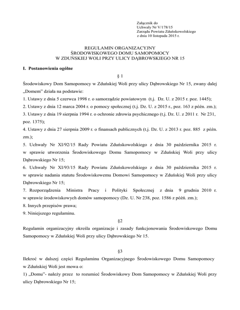 Załącznik do Uchwały Nr V/178/15 Zarządu Powiatu Zduńskowolskiego z dnia 10 listopada 2015 r. REGULAMIN ORGANIZACYJNY ŚRODOWISKOWEGO DOMU SAMOPOMOCY W ZDUŃSKIEJ WOLI PRZY ULICY DĄBROWSKIEGO NR 15 I. Postanowienia ogólne §1 Środowiskowy Dom Samopomocy w Zduńskiej Woli przy ulicy Dąbrowskiego Nr 15, zwany dalej „Domem” działa na podstawie: 1. Ustawy z dnia 5 czerwca 1998 r. o samorządzie powiatowym (t.j. Dz. U. z 2015 r. poz. 1445); 2. Ustawy z dnia 12 marca 2004 r. o pomocy społecznej (t.j. Dz. U. z 2015 r., poz. 163 z późn. zm.); 3. Ustawy z dnia 19 sierpnia 1994 r. o ochronie zdrowia psychicznego (t.j. Dz. U. z 2011 r. Nr 231, poz. 1375); 4. Ustawy z dnia 27 sierpnia 2009 r. o finansach publicznych (t.j. Dz. U. z 2013 r. poz. 885 z późn. zm.); 5. Uchwały Nr XI/92/15 Rady Powiatu Zduńskowolskiego z dnia 30 października 2015 r. w sprawie utworzenia Środowiskowego Domu Samopomocy w Zduńskiej Woli przy ulicy Dąbrowskiego Nr 15; 6. Uchwały Nr XI/93/15 Rady Powiatu Zduńskowolskiego z dnia 30 października 2015 r. w sprawie nadania statutu Środowiskowemu Domowi Samopomocy w Zduńskiej Woli przy ulicy Dąbrowskiego Nr 15; 7. Rozporządzenia Ministra Pracy i Polityki Społecznej z dnia 9 grudnia 2010 r. w sprawie środowiskowych domów samopomocy (Dz. U. Nr 238, poz. 1586 z późń. zm.); 8. Innych przepisów prawa; 9. Niniejszego regulaminu. §2 Regulamin organizacyjny określa organizacje i zasady funkcjonowania Środowiskowego Domu Samopomocy w Zduńskiej Woli przy ulicy Dąbrowskiego Nr 15. §3 Ilekroć w dalszej części Regulaminu Organizacyjnego Środowiskowego Domu Samopomocy w Zduńskiej Woli jest mowa o: 1) „Domu”- należy przez to rozumieć Środowiskowy Dom Samopomocy w Zduńskiej Woli przy ulicy Dąbrowskiego Nr 15; 2) „Dyrektorze”- należy przez to rozumieć Dyrektora Środowiskowego Domu Samopomocy w Zduńskiej Woli przy ulicy Dąbrowskiego Nr 15; 3) „Powiatowym Centrum” - należy przez to rozumieć Powiatowe Centrum Pomocy Rodzinie w Zduńskiej Woli; 4) „Dyrektorze Powiatowego Centrum”- należy przez to rozumieć Dyrektora Powiatowego Centrum Pomocy Rodzinie w Zduńskiej Woli; 5) „Staroście”- należy przez to rozumieć Starostę Zduńskowolskiego; 6) „Powiecie”- należy przez to rozumieć Powiat Zduńskowolski; 7) „Regulaminie”- należy przez to rozumieć Regulamin Organizacyjny Środowiskowego Domu Samopomocy w Zduńskiej Woli przy ulicy Dąbrowskiego Nr 15; 8) „Zespole wspierająco - aktywizującym” należy przez to rozumieć kierownika i pracowników świadczących usługi w Domu; 9) „Uczestnikach”- należy przez to rozumieć osoby przyjęte do Domu i korzystające z usług Środowiskowego Domu Samopomocy w Zduńskiej Woli przy ulicy Dąbrowskiego Nr 15; 10) „Indywidualnym planie postępowania wspierająco - aktywizującego” należy przez to rozumieć ustalony, odpowiednio do potrzeb i możliwości psychofizycznych każdego uczestnika, rodzaj i zakres usług świadczonych w Domu. §4 1. Dom jest jednostką organizacyjną Powiatu, działającą w formie jednostki budżetowej. 2. Siedzibą Domu jest miasto Zduńska Wola. 3. Terenem działania Domu jest Powiat. 4. Dom jest ośrodkiem wsparcia pobytu dziennego realizującym zadania pomocy społecznej z zakresu administracji rządowej. 5. Dom jest przeznaczony dla 40 uczestników przewlekle psychicznie chorych, niepełnosprawnych intelektualnie i dla osób wykazujących inne przewlekłe zaburzenia czynności psychicznych. II. Cele i zadnia Domu. §5 1. Celem działalności Domu jest zapewnienie osobom z zaburzeniami psychicznymi, niepełnosprawnym intelektualnie oraz osobom wykazującym inne przewlekłe zaburzenia czynności psychicznych, oparcia społecznego pozwalającego na zaspokojenie ich podstawowych potrzeb życiowych, usamodzielnienie i integrację społeczną. 2. Do zadań Domu należy świadczenie usług w ramach indywidualnych lub zespołowych treningów samoobsługowych i treningów umiejętności społecznych osobom z obniżoną lub zaburzoną sprawnością psychiczną i umysłową, polegających na nauce, rozwijaniu lub podtrzymywaniu umiejętności społecznych w zakresie czynności dnia codziennego i funkcjonowania w życiu społecznym. 3. Usługi, o których mowa w §5 pkt 2 obejmują w szczególności: 1) trening umiejętności samoobsługi, zaradności życiowej i funkcjonowania w codziennym życiu, w tym: trening higieny, kulinarny, umiejętności praktycznych, finansowy i inne; 2) trening umiejętności społecznych i interpersonalnych, w tym kształtowanie wobec uczestników właściwych postaw społecznych a zwłaszcza zrozumienia, tolerancji, życzliwości, przeciwdziałaniu ich dyskryminacji, ochrona godności osobistej i poczucia intymności; 3) trening umiejętności spędzania czasu wolnego, w tym: rozwijanie zainteresowań, udział w spotkaniach towarzyskich, kulturalnych i inne; 4) poradnictwo psychologiczne; 5) pomoc w załatwianiu spraw urzędowych; 6) pomoc w dostępie do niezbędnych świadczeń zdrowotnych, w tym uzgadnianie i pilnowanie terminów wizyt u lekarza, pomoc w wykupieniu leków, pomoc w dotarciu do placówek służby zdrowia i inne; 7) niezbędną opiekę; 8) terapię ruchową, w tym: zajęcia sportowe, turystykę i rekreację; 9) inne formy postępowania w zależności od indywidualnych potrzeb. 4. Uczestnikom korzystającym ze świadczeń Domu zapewnia się psychiatryczną opiekę zdrowotną, przysługującą im na podstawie odrębnych przepisów oraz rehabilitację społeczną. 5. Zakres usług o których mowa w § 5 pkt 3, ustala się uwzględniając indywidualne potrzeby i możliwości psychofizyczne każdego uczestnika, w indywidualnym planie postępowania wspierająco - aktywizującego, w porozumieniu i za zgodą uczestnika lub jego opiekuna prawnego, a także, w miarę możliwości przy współudziale najbliższej rodziny uczestnika. 7. Dom umożliwia spożywanie gorącego posiłku w czasie pobytu w ramac