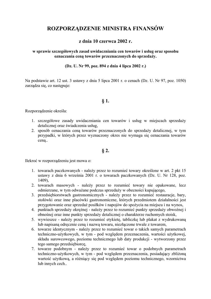 ROZPORZĄDZENIE MINISTRA FINANSÓW z dnia 10 czerwca 2002 r. w sprawie szczegółowych zasad uwidaczniania cen towarów i usług oraz sposobu oznaczania ceną towarów przeznaczonych do sprzedaży. (Dz. U. Nr 99, poz. 894 z dnia 4 lipca 2002 r.) Na podstawie art. 12 ust. 3 ustawy z dnia 5 lipca 2001 r. o cenach (Dz. U. Nr 97, poz. 1050) zarządza się, co następuje: § 1. Rozporządzenie określa: 1. szczegółowe zasady uwidaczniania cen towarów i usług w miejscach sprzedaży detalicznej oraz świadczenia usług, 2. sposób oznaczania ceną towarów przeznaczonych do sprzedaży detalicznej, w tym przypadki, w których przez wyznaczony okres nie wymaga się oznaczania towarów ceną.. § 2. Ilekroć w rozporządzeniu jest mowa o: 1. towarach paczkowanych - należy przez to rozumieć towary określone w art. 2 pkt 15 ustawy z dnia 6 września 2001 r. o towarach paczkowanych (Dz. U. Nr 128, poz. 1409), 2. towarach masowych - należy przez to rozumieć towary nie opakowane, lecz odmierzane, w tym odważane podczas sprzedaży w obecności kupującego, 3. przedsiębiorstwach gastronomicznych - należy przez to rozumieć restauracje, bary, stołówki oraz inne placówki gastronomiczne, których przedmiotem działalności jest przygotowanie oraz sprzedaż posiłków i napojów do spożycia na miejscu i na wynos, 4. punktach sprzedaży okrężnej - należy przez to rozumieć punkty sprzedaży obwoźnej i obnośnej oraz inne punkty sprzedaży detalicznej o charakterze ruchomych stoisk, 5. wywieszce - należy przez to rozumieć etykietę, tabliczkę lub plakat z wydrukowaną lub napisaną odręcznie ceną i nazwą towaru, niezłączone trwale z towarem, 6. towarze identycznym - należy przez to rozumieć towar o takich samych parametrach techniczno-użytkowych, w tym - pod względem przeznaczenia, wartości użytkowej, składu surowcowego, poziomu technicznego lub daty produkcji - wytworzony przez tego samego przedsiębiorcę, 7. towarze podobnym - należy przez to rozumieć towar o podobnych parametrach techniczno-użytkowych, w tym - pod względem przeznaczenia, posiadający zbliżoną wartość użytkową, a różniący się pod względem poziomu technicznego, wzornictwa lub innych cech.. § 3. 1. Towary oferowane kupującym w miejscu sprzedaży opatruje się, z zastrzeżeniem § 5, wywieszkami zawierającymi informacje wskazujące ich nazwy handlowe, ceny oraz jednostki miar, do których odnoszą się uwidocznione ceny. W przypadku towarów podobnych na wywieszkach umieszcza się ponadto nazwę producenta i inne informacje umożliwiające niebudzącą wątpliwości identyfikację ceny z towarem.. 2. Na wywieszkach podaje się ceny aktualne w momencie oferowania towarów. 3. Przy towarach wystawionych w miejscu ekspozycji handlowej, takim jak: okno (witryna), gablota i innym podobnym miejscu wystawowym, wewnątrz lub na zewnątrz przestrzeni związanej z miejscem sprzedaży, powinny być uwidocznione ceny. Jeżeli zamiast towarów oryginalnych przedsiębiorca wystawia ich atrapy, imitacje lub wzory, powinien uwidocznić ceny w taki sam sposób i taką samą czcionką, jak ceny towarów oryginalnych. 4. Przy wystawianiu na sprzedaż większej ilości określonego towaru cenę uważa się za uwidocznioną, jeżeli wywieszkę umieści się tylko przy jednej sztuce identycznego towaru. § 4. Wywieszki umieszcza się w miejscu ogólnodostępnym i widocznym dla każdego kupującego, bezpośrednio przy towarach lub w bliskości towarów, których dotyczą, w taki sposób, aby nie można było pomylić ceny określonego towaru z ceną innego, a w szczególności podobnego towaru. Napisy na wywieszkach powinny być wyraźne i czytelne, tak aby nie budziły wątpliwości kupujących. § 5. 1. Ceny towarów przeznaczonych do sprzedaży, lecz umieszczonych w miejscu niedostępnym i niewidocznym dla kupujących, a w szczególności na zapleczu, uwidacznia się w zestawieniach cen, zwanych dalej "cennikami". 2. Cenniki wywiesza się, wykłada lub w inny sposób udostępnia w miejscu sprzedaży towarów tak, aby były one czytelne dla kupujących. 3. Ceny towarów oferowanych w punktach sprzedaży okrężnej uwidacznia się w cenniku wywieszonym w miejscu dostępnym dla kupujących. 4. Ceny potraw lub wyrobów oferowanych w przedsiębiorstwach gastronomicznych uwidacznia się w sposób czytelny w cenniku, wywieszonym w miejscu ogólnodostępnym dla kupujących wewnątrz lub na zewnątrz lokalu, w pobliżu drzwi wejściowych. Cennik powinien ponadto zawierać aktualne informacje dodatkowe umożliwiające łatwą identyfikację ceny z towarem, w szczególności: datę wystawienia, pełną nazwę potrawy lub wyrobu, określenie ilości nominalnej potrawy lub wyrobu, wyrażonej w legalnej jednostce miary, zawartej w jednej porcji, w tym zwłaszcza ilości głównego składnika (mięsa, drobiu, ryb), dodatków uzupełniających (przystawek, deserów) i napojów. W przypadku towarów, które ze swej natury mogą być sprzedawane na sztuki, dopuszcza się określenie ilości nominalnej oferowanej porcji w sztukach. § 6. 1. Ceny porcji wyrobów garmażeryjnych uwidacznia się na wywieszkach przy poszczególnych towarach, wraz z pełną ich nazwą, określeniem ilości nominalnej oferowanej porcji każdego wyrobu, wyrażonej w legalnej jednostce miary. W przypadku towarów, które ze swej natury mogą być sprzedawane na sztuki, dopuszcza się określenie ilości nominalnej oferowanej porcji w sztukach. 2. Przedsiębiorcy prowadzący działalność usługową w zakresie gastronomii lub hotelarstwa: 1) zapewniają wystarczającą ilość cenników oferowanych potraw lub wyrobów i napojów, aby udostępniać je kupującym przed przyjęciem zamówienia i przy rozliczeniu końcowym, 2) wykładają w każdym pokoju noclegowym katalog zawierający ceny noclegu, wyżywienia lub innych oferowanych usług, 3) wywieszają lub wykładają w miejscu przeznaczonym do odbywania rozmów telefonicznych cennik, zawierający cenę