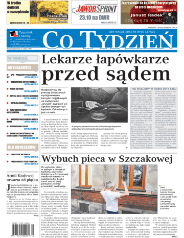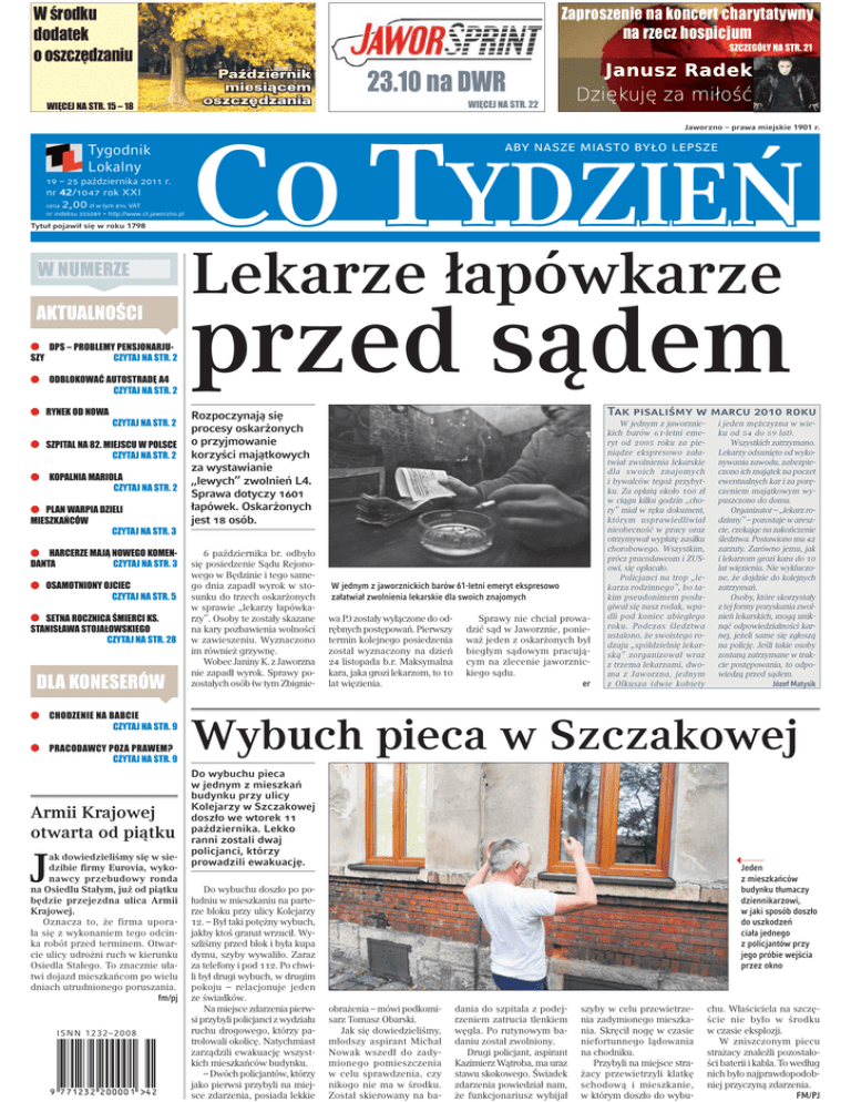 =DSURV]HQLHQDNRQFHUWFKDU\WDW\ZQ\ QDU]HF]KRVSLFMXP :œURGNX GRGDWHN RRV]F]ęG]DQLX :,Ę&(-1$675² 6=&=(*Ðâ<1$675 0A|D DZIE ERN NIK MIES SI CE EM OSZCZÇ ÇDZ ZAN NIA QD':5 :,Ę&(-1$675 Jaworzno – prawa miejskie 1901 r. Tygodnik Lokalny 19 – 25 października 2011 r. nr 42/1047 rok XXI 2,00 cena zł w tym 8% VAT nr indeksu 355089 • http://www.ct.jaworzno.pl Tytuł pojawił się w roku 1798 :180(5=( $.78$/12Œ&, E '36²352%/(0<3(16-21$5-8 &=<7$-1$675 6=< E 2'%/2.2:$ý$872675$'Ę$ &=<7$-1$675 E 5<1(.2'12:$ &=<7$-1$675 &=<7$-1$675 aby nasze miasto było lepsze CO TYDZIEŃ Lekarze łapówkarze przed sądem Tak pisaliśmy w marcu 2010 roku Rozpoczynają się procesy oskarżonych E 6=3,7$/1$0,(-6&8:32/6&( o przyjmowanie &=<7$-1$675 korzyści majątkowych za wystawianie E .23$/1,$0$5,2/$ „lewych” zwolnień L4. &=<7$-1$675 Sprawa dotyczy 1601 łapówek. Oskarżonych E 3/$1:$53,$'=,(/, 0,(6=.$Ľ&Ð: jest 18 osób. E +$5&(5=(0$-Ċ12:(*2.20(1 &=<7$-1$675 '$17$ E 26$0271,21<2-&,(& &=<7$-1$675 E 6(71$52&=1,&$Œ0,(5&,.6 67$1,6â$:$672-$â2:6.,(*2 &=<7$-1$675 '/$.21(6(5Ð: E &+2'=(1,(1$%$%&,( &=<7$-1$675 E 35$&2'$:&<32=$35$:(0" &=<7$-1$675 Armii Krajowej otwarta od piątku J ak dowiedzieliśmy się w siedzibie firmy Eurovia, wykonawcy przebudowy ronda na Osiedlu Stałym, już od piątku będzie przejezdna ulica Armii Krajowej. Oznacza to, że firma uporała się z wykonaniem tego odcinka robót przed terminem. Otwarcie ulicy udrożni ruch w kierunku Osiedla Stałego. To znacznie ułatwi dojazd mieszkańcom po wielu dniach utrudnionego poruszania. fm/pj ISNN 1232–2008 #-34 6 października br. odbyło się posiedzenie Sądu Rejonowego w Będzinie i tego samego dnia zapadł wyrok w stosunku do trzech oskarżonych w sprawie „lekarzy łapówkarzy”. Osoby te zostały skazane na kary pozbawienia wolności w zawieszeniu. Wyznaczono im również grzywnę. Wobec Janiny K. z Jaworzna nie zapadł wyrok. Sprawy pozostałych osób (w tym Zbignie- W jednym z jaworznickich barów 61-letni emeryt ekspresowo załatwiał zwolnienia lekarskie dla swoich znajomych wa P.) zostały wyłączone do odrębnych postępowań. Pierwszy termin kolejnego posiedzenia został wyznaczony na dzień 24 listopada b.r. Maksymalna kara, jaka grozi lekarzom, to 10 lat więzienia. Sprawy nie chciał prowadzić sąd w Jaworznie, ponieważ jeden z oskarżonych był biegłym sądowym pracującym na zlecenie jaworznickiego sądu. er W jednym z jaworznickich barów 61-letni emeryt od 2005 roku za pieniądze ekspresowo załatwiał zwolnienia lekarskie dla swoich znajomych i bywalców tegoż przybytku. Za opłatą około 100 zł w ciągu kilku godzin „chory” miał w ręku dokument, którym usprawiedliwiał nieobecność w pracy oraz otrzymywał wypłatę zasiłku chorobowego. Wszystkim, prócz pracodawcom i ZUSowi, się opłacało. Policjanci na trop „lekarza rodzinnego”, bo takim pseudonimem posługiwał się nasz rodak, wpadli pod koniec ubiegłego roku. Podczas śledztwa ustalono, że swoistego rodzaju „spółdzielnię lekarską” zorganizował wraz z trzema lekarzami, dwoma z Jaworzna, jednym z Olkusza (dwie kobiety i jeden mężczyzna w wieku od 54 do 59 lat). Wszystkich zatrzymano. Lekarzy odsunięto od wykonywania zawodu, zabezpieczono ich majątek na poczet ewentualnych kar i za poręczeniem majątkowym wypuszczono do domu. Organizator – „lekarz rodzinny” – pozostaje w areszcie, czekając na zakończenie śledztwa. Postawiono mu 42 zarzuty. Zarówno jemu, jak i lekarzom grozi kara do 10 lat więzienia. Nie wykluczone, że dojdzie do kolejnych zatrzymań. Osoby, które skorzystały z tej formy pozyskania zwolnień lekarskich, mogą uniknąć odpowiedzialności karnej, jeżeli same się zgłoszą na policję. Jeśli takie osoby zostaną zatrzymane w trakcie postępowania, to odpowiedzą przed sądem. Józef Matysik Wybuch pieca w Szczakowej Do wybuchu pieca w jednym z mieszkań budynku przy ulicy Kolejarzy w Szczakowej doszło we wtorek 11 października. Lekko ranni zostali dwaj policjanci, którzy prowadzili ewakuację. Do wybuchu doszło po południu w mieszkaniu na parterze bloku przy ulicy Kolejarzy 12. – Był taki potężny wybuch, jakby ktoś granat wrzucił. Wyszliśmy przed blok i była kupa dymu, szyby wywaliło. Zaraz za telefony i pod 112. Po chwili był drugi wybuch, w drugim pokoju – relacjonuje jeden ze świadków. Na miejsce zdarzenia pierwsi przybyli policjanci z wydziału ruchu drogowego, którzy patrolowali okolicę. Natychmiast zarządzili ewakuację wszystkich mieszkańców budynku. – Dwóch policjantów, którzy jako pierwsi przybyli na miejsce zdarzenia, posiada lekkie Jeden z mieszkańców budynku tłumaczy dziennikarzowi, w jaki sposób doszło do uszkodzeń ciała jednego z policjantów przy jego próbie wejścia przez okno obrażenia – mówi podkomisarz Tomasz Obarski. Jak się dowiedzieliśmy, młodszy aspirant Michał Nowak wszedł do zadymionego pomieszczenia w celu sprawdzenia, czy nikogo nie ma w środku. Został skierowany na ba- dania do szpitala z podejrzeniem zatrucia tlenkiem węgla. Po rutynowym badaniu został zwolniony. Drugi policjant, aspirant Kazimierz Wątroba, ma uraz stawu skokowego. Świadek zdarzenia powiedział nam, że funkcjonariusz wybijał szyby w celu przewietrzenia zadymionego mieszkania. Skręcił nogę w czasie niefortunnego lądowania na chodniku. Przybyli na miejsce strażacy przewietrzyli klatkę schodową i mieszkanie, w którym doszło do wybu- chu. Właściciela na szczęście nie było w środku w czasie eksplozji. W zniszczonym piecu strażacy znaleźli pozostałości baterii i kabla. To według nich było najprawdopodobniej przyczyną zdarzenia. FM/PJ 2 Aktualności 10 DPS – problemy pensjonariuszy Co Tydzień nr 42/1047 19 października 2011 roku Miasto Jaworzno miejsce zajął jaworznicki szpital wśród śląskich placówek w rankingu „Rzeczpospolitej” Mieszkańcy Domu Pomocy Społecznej skarżą się na personel. Dyrektorka ośr