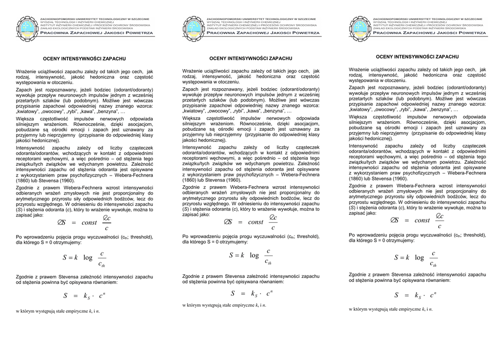 OCENY INTENSYWNOŚCI ZAPACHU OCENY INTENSYWNOŚCI ZAPACHU OCENY INTENSYWNOŚCI ZAPACHU WraŜenie uciąŜliwości zapachu zaleŜy od takich jego cech, jak rodzaj, intensywność, jakość hedoniczna oraz częstość występowania w otoczeniu. WraŜenie uciąŜliwości zapachu zaleŜy od takich jego cech, jak rodzaj, intensywność, jakość hedoniczna oraz częstość występowania w otoczeniu. WraŜenie uciąŜliwości zapachu zaleŜy od takich jego cech, jak rodzaj, intensywność, jakość hedoniczna oraz częstość występowania w otoczeniu. Zapach jest rozpoznawany, jeŜeli bodziec (odorant/odoranty) wywołuje przepływ neuronowych impulsów jednym z wcześniej przetartych szlaków (lub podobnym). MoŜliwe jest wówczas przypisanie zapachowi odpowiedniej nazwy znanego wzorca: „kwiatowy”, „owocowy”, „rybi”, „kawa”, „benzyna”, … Zapach jest rozpoznawany, jeŜeli bodziec (odorant/odoranty) wywołuje przepływ neuronowych impulsów jednym z wcześniej przetartych szlaków (lub podobnym). MoŜliwe jest wówczas przypisanie zapachowi odpowiedniej nazwy znanego wzorca: „kwiatowy”, „owocowy”, „rybi”, „kawa”, „benzyna”, … Zapach jest rozpoznawany, jeŜeli bodziec (odorant/odoranty) wywołuje przepływ neuronowych impulsów jednym z wcześniej przetartych szlaków (lub podobnym). MoŜliwe jest wówczas przypisanie zapachowi odpowiedniej nazwy znanego wzorca: „kwiatowy”, „owocowy”, „rybi”, „kawa”, „benzyna”, … Większa częstotliwość impulsów nerwowych odpowiada silniejszym wraŜeniom. Równocześnie, dzięki asocjacjom, pobudzane są ośrodki emocji i zapach jest uznawany za przyjemny lub nieprzyjemny (przypisanie do odpowiedniej klasy jakości hedonicznej). Większa częstotliwość impulsów nerwowych odpowiada silniejszym wraŜeniom. Równocześnie, dzięki asocjacjom, pobudzane są ośrodki emocji i zapach jest uznawany za przyjemny lub nieprzyjemny (przypisanie do odpowiedniej klasy jakości hedonicznej). Większa częstotliwość impulsów nerwowych odpowiada silniejszym wraŜeniom. Równocześnie, dzięki asocjacjom, pobudzane są ośrodki emocji i zapach jest uznawany za przyjemny lub nieprzyjemny (przypisanie do odpowiedniej klasy jakości hedonicznej). Intensywność zapachu zaleŜy od liczby cząsteczek odoranta/odorantów, wchodzących w kontakt z odpowiednimi receptorami węchowymi, a więc pośrednio – od stęŜenia tego związku/tych związków we wdychanym powietrzu. ZaleŜność intensywności zapachu od stęŜenia odoranta jest opisywane z wykorzystaniem praw psychofizycznych – Webera-Fechnera (1860) lub Stevensa (1960). Intensywność zapachu zaleŜy od liczby cząsteczek odoranta/odorantów, wchodzących w kontakt z odpowiednimi receptorami węchowymi, a więc pośrednio – od stęŜenia tego związku/tych związków we wdychanym powietrzu. ZaleŜność intensywności zapachu od stęŜenia odoranta jest opisywane z wykorzystaniem praw psychofizycznych – Webera-Fechnera (1860) lub Stevensa (1960). Intensywność zapachu zaleŜy od liczby cząsteczek odoranta/odorantów, wchodzących w kontakt z odpowiednimi receptorami węchowymi, a więc pośrednio – od stęŜenia tego związku/tych związków we wdychanym powietrzu. ZaleŜność intensywności zapachu od stęŜenia odoranta jest opisywane z wykorzystaniem praw psychofizycznych – Webera-Fechnera (1860) lub Stevensa (1960). Zgodnie z prawem Webera-Fechnera wzrost intensywności odbieranych wraŜeń zmysłowych nie jest proporcjonalny do arytmetycznego przyrostu siły odpowiednich bodźców, lecz do przyrostu względnego. W odniesieniu do intensywności zapachu (S) i stęŜenia odoranta (c), który to wraŜenie wywołuje, moŜna to zapisać jako: Zgodnie z prawem Webera-Fechnera wzrost intensywności odbieranych wraŜeń zmysłowych nie jest proporcjonalny do arytmetycznego przyrostu siły odpowiednich bodźców, lecz do przyrostu względnego. W odniesieniu do intensywności zapachu (S) i stęŜenia odoranta (c), który to wraŜenie wywołuje, moŜna to zapisać jako: Zgodnie z prawem Webera-Fechnera wzrost intensywności odbieranych wraŜeń zmysłowych nie jest proporcjonalny do arytmetycznego przyrostu siły odpowiednich bodźców, lecz do przyrostu względnego. W odniesieniu do intensywności zapachu (S) i stęŜenia odoranta (c), który to wraŜenie wywołuje, moŜna to zapisać jako: Po wprowadzeniu pojęcia progu wyczuwalności (cth; threshold), dla którego S = 0 otrzymujemy: Po wprowadzeniu pojęcia progu wyczuwalności (cth; threshold), dla którego S = 0 otrzymujemy: Po wprowadzeniu pojęcia progu wyczuwalności (cth; threshold), dla którego S = 0 otrzymujemy: ∆c c ∆S = const S = k log c cth ∆c c ∆S = const S = k log c cth Zgodnie z prawem Stevensa zaleŜność intensywności zapachu od stęŜenia powinna być opisywana równaniem: Zgodnie z prawem Stevensa zaleŜność intensywności zapachu od stęŜenia powinna być opisywana równaniem: S = kS ⋅ cn S = kS ⋅ cn w którym występują stałe empiryczne ks i n. w którym występują stałe empiryczne ks i n. ∆c c ∆S = const S = k log c cth Zgodnie z prawem Stevensa zaleŜność intensywności zapachu od stęŜenia powinna być opisywana równaniem: S = kS ⋅ cn w którym występują stałe empiryczne ks i n. Obie funkcje mają podobny przebieg w zakresie średnich intensywności zapachu (rozbieŜności występują w pobliŜu granicy wyczuwalności). Obie funkcje mają podobny przebieg w zakresie średnich intensywności zapachu (rozbieŜności występują w pobliŜu granicy wyczuwalności). Obie funkcje mają podobny przebieg w zakresie średnich intensywności zapachu (rozbieŜności występują w pobliŜu granicy wyczuwalności). Mimo braku ostatecznych rozstrzygnięć problemy odorymetrii często są rozwiązywane w oparciu o prawo Webera-Fechnera. Powszechną zasadą jest przygotowywanie „serii rozcieńczeń” (mieszanin próbki badanego gazu z powietrzem, wzor