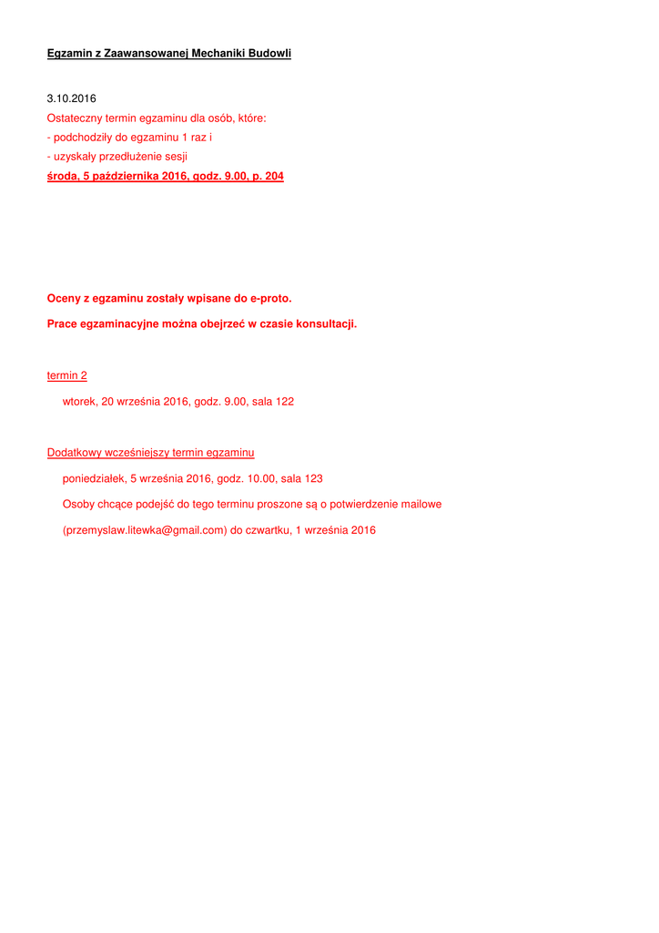 Egzamin z Zaawansowanej Mechaniki Budowli 3.10.2016 Ostateczny termin egzaminu dla osób, które: - podchodziły do egzaminu 1 raz i - uzyskały przedłużenie sesji środa, 5 października 2016, godz. 9.00, p. 204 Oceny z egzaminu zostały wpisane do e-proto. Prace egzaminacyjne można obejrzeć w czasie konsultacji. termin 2 wtorek, 20 września 2016, godz. 9.00, sala 122 Dodatkowy wcześniejszy termin egzaminu poniedziałek, 5 września 2016, godz. 10.00, sala 123 Osoby chcące podejść do tego terminu proszone są o potwierdzenie mailowe ([email protected]) do czwartku, 1 września 2016