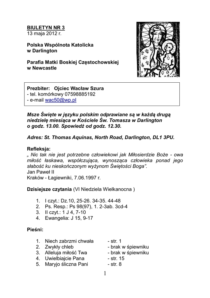 BIULETYN NR 3 13 maja 2012 r. Polska Wspólnota Katolicka w