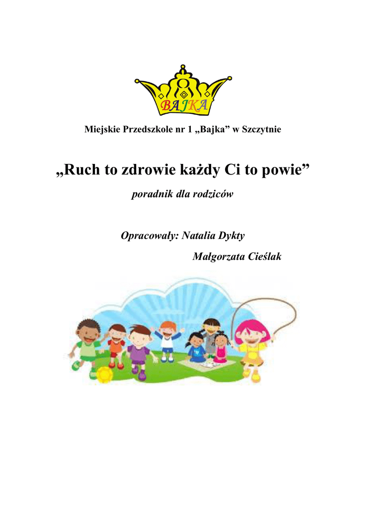 Miejskie Przedszkole nr 1 „Bajka” w Szczytnie „Ruch to zdrowie każdy Ci to powie” poradnik dla rodziców Opracowały: Natalia Dykty Małgorzata Cieślak Każdy rodzic pragnie, aby jego dziecko było zdrowe, prawidłowo się rozwijało pod względem fizycznym, psychicznym. Jednym z podstawowych czynników, aby to osiągnąć jest prawidłowe odżywianie, zbilansowana dieta dzieci, ale nie możemy zapomnieć o aktywności fizycznej. Aktywność fizyczna jest szczególnie ważna, w czasach epidemii otyłości i związanej z nią wszelkich chorób, jest ona ważniejsza niż kiedykolwiek wcześniej. ZDROWA RODZINA O CODZIENNYM RUCHU NIEZAPOMINA Rodzice wybierzcie ze swoim dzieckiem taki rodzaj aktywności, który będzie i Wam sprawiać przyjemność. Zróbcie z aktywności fizycznej normę poprzez uprawianie sportu codziennie o tej samej porze dnia. Starajcie się za każdym razem poświęcić 5 minut na poranną gimnastykę, lub każdego dnia wychodzić na poobiedni spacer. Wiele zajęć można zaliczyć do aktywności fizycznej, np. spacerowanie, prace w ogrodzie, taniec, chodzenie po górach, sprzątanie podwórka. Nie ograniczaj swojej aktywności i aktywności swojego dziecka tylko do pracy, zabawy i odpoczynku. Powinno się znaleźć zajęcie, któremu można będzie oddać się z pasją całą rodziną przez większość dni w roku, niezależnie od pory roku i pogody. Poprawi to jego budowę ciała zdrowie i sprawność. Dobrze jest uprawiać aktywność fizyczną wspólnie z pociechą (niedzielna gra w piłkę, spacer do lasu czy wybrany sport). Pomóż dziecku znaleźć to, co go aktywizuje i sprawi radość. Daj mu spróbować różnych aktywności, nie ograniczaj tylko do jednej dyscypliny. Pamiętaj, jeśli rodzice są aktywni, dzieci też to polubią. Zastanów się, jak możecie ćwiczyć wspólnie. Jeśli pogoda nie pozwala na aktywność na zewnątrz, włączcie muzykę i tańczcie! RODZICU Przy „zarażaniu” dziecka miłością do ruchu, nie zapominajmy o tym, że: małe dzieci mają zwykle mnóstwo energii, wykorzystajmy więc naturalną skłonność dziecka do aktywnej zabawy; nie wymagajmy od dziecka by siedziało cicho i spokojnie, to tylko tłumi naturalne pragnienie aktywności i wspiera siedzący tryb życia; pozwólmy maluchom biegać, pływać, wspinać się i po prostu się dobrze bawić; zwyczajnie się ruszać; nikt nie lubi przymusu i robienia czegoś, co nie sprawia mu przyjemności; promujmy aktywność dzieci a nie zmuszajmy do wykonywania ćwiczeń; szukajmy takiego rodzaju aktywności fizycznej, która zainteresuje głównie dziecko a nie nas; takiego, który będzie dla dziecka zabawą a nie obowiązkiem; aktywność powinna kojarzyć się dziecku bardziej z nagrodą niż karą; każdy lubi, jak inni liczą się z jego zdaniem; pozwól dziecku zadecydować nie tylko czy chce jeździć na rowerze, pływać, tańczyć czy grać w piłkę, ale także, kiedy chce wykonywać te ćwiczenia i przez ile czasu oraz w jakim tempie; każdy jest inny; podobnie jak dorośli również i dzieci różnią się pod względem cech charakteru i budowy anatomicznej predysponujących nas do wykonywania jednych czynności lepiej a innych gorzej; szukajmy dla dzieci zajęć, do których mają predyspozycję; zdrowie najważniejsze; dbajmy o zdrowie dziecka, regularnie odwiedzajmy lekarza i skonsultujmy z nim plan ćwiczeń dziecka; lekarz oceni czy dziecko jest zdrowe, jaki jest jego rozwój fizyczny, podpowie, które ćwiczenia są wskazane, a których nasze dziecko powinno unikać; odpowiedni strój to podstawa; musi być dostosowany nie tylko do rodzaju aktywności i wymagań konkretnej dyscypliny, ale także do warunków atmosferycznych; współzawodnictwo to klucz do sukcesu; organizujmy jak najczęściej rodzinne zawody, konkursy, wyścigi, itp.; nie zapominajmy o nagrodach dla zwycięzców; przy okazji uczmy dziecko nie tylko jak cieszyć się z wygranej, ale również jak pogodzić się z porażką i przyjąć ją, jako mobilizację do działania i większej pracy nad sobą; aktywność fizyczna to nie tylko ćwiczenia fizyczne, to także wykonywanie różnych czynności życia codziennego; nie wyręczajmy dziecka w tym, co może zrobić same; dopuszczając je do pomocy w sprzątaniu domu, pielęgnacji ogródka czy opieki nad wymagającym ruchu czworonogiem. regularność to złota zasada; by ruch wszedł dziecku w krew, aktywność fizyczna musi być regularna, co jednak nie wyklucza różnorodności ćwiczeń i dyscyplin; przesada w żadną stronę nie jest wskazana; zadbajmy, by dziecko nie tylko było aktywne, ale miało możliwość odpoczynku potrzebnego do regeneracji sił. jedzenie to paliwo; zadbajmy o zdrowy posiłek naszego aktywnego malucha, by mógł w prawidłowy sposób uzupełnić straconą energię. Wspólna zabawa dziecka i rodzica na świeżym powietrzu, czy sali gimnastycznej, wspólne wykonywanie domowych porządków, czy prac w ogrodzie, taniec, pływanie, jazda na rowerze czy bieganie pozytywnie wpływa nie tylko na zdrowie naszych dzieci, ale i nas samych. Wpływa też pozytywnie na wzmacnianie więzi rodzinnych. Promujmy aktywność fizyczną w naszych rodzinach. Żródło: Ewa Zofia Jarymowicz dietetyk, specjalista zdrowia publicznego, instruktor lekkiej atletyki