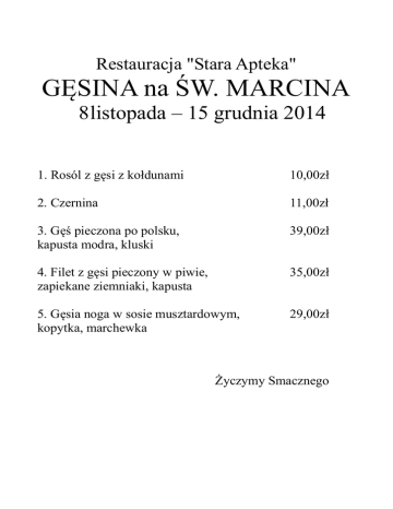 Restauracja "Stara Apteka" GĘSINA na ŚW. MARCINA 8 listopada – 15 grudnia 2014 1. Rosól z gęsi z kołdunami 10,00zł 2. Czernina 11,00zł 3. Gęś pieczona po polsku, kapusta modra, kluski 39,00zł 4. Filet z gęsi pieczony w piwie, zapiekane ziemniaki, kapusta 35,00zł 5. Gęsia noga w sosie musztardowym, kopytka, marchewka 29,00zł Życzymy Smacznego