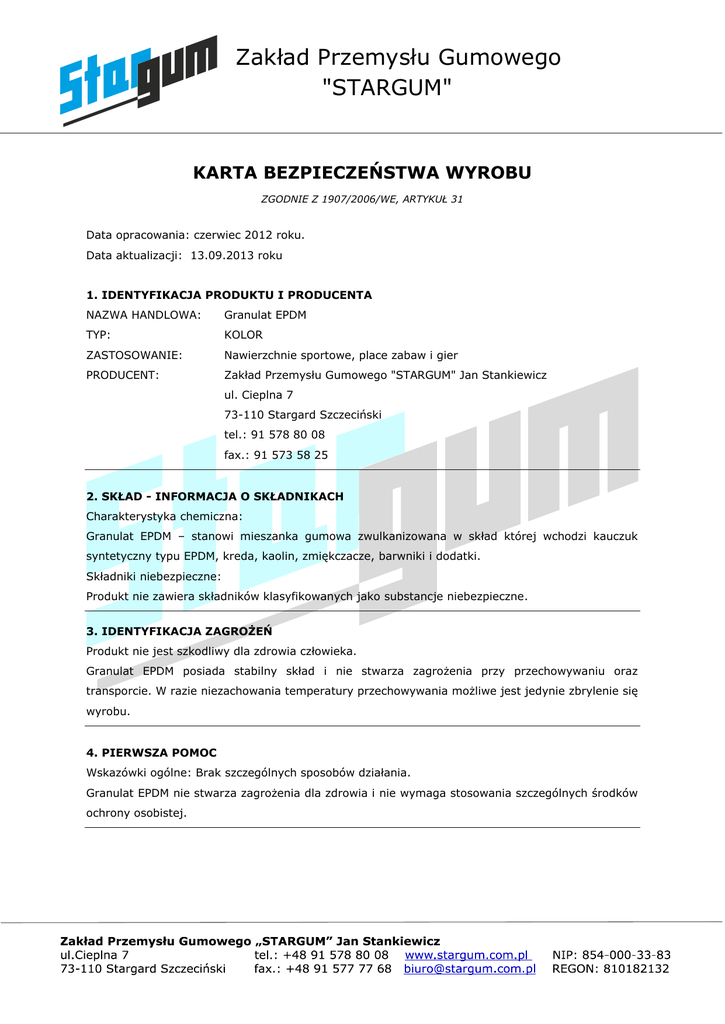 Zakład Przemysłu Gumowego "STARGUM" KARTA BEZPIECZEŃSTWA WYROBU ZGODNIE Z 1907/2006/WE, ARTYKUŁ 31 Data opracowania: czerwiec 2012 roku. Data aktualizacji: 13.09.2013 roku 1. IDENTYFIKACJA PRODUKTU I PRODUCENTA NAZWA HANDLOWA: Granulat EPDM TYP: KOLOR ZASTOSOWANIE: Nawierzchnie sportowe, place zabaw i gier PRODUCENT: Zakład Przemysłu Gumowego "STARGUM" Jan Stankiewicz ul. Cieplna 7 73-110 Stargard Szczeciński tel.: 91 578 80 08 fax.: 91 573 58 25 2. SKŁAD - INFORMACJA O SKŁADNIKACH Charakterystyka chemiczna: Granulat EPDM – stanowi mieszanka gumowa zwulkanizowana w skład której wchodzi kauczuk syntetyczny typu EPDM, kreda, kaolin, zmiękczacze, barwniki i dodatki. Składniki niebezpieczne: Produkt nie zawiera składników klasyfikowanych jako substancje niebezpieczne. 3. IDENTYFIKACJA ZAGROŻEŃ Produkt nie jest szkodliwy dla zdrowia człowieka. Granulat EPDM posiada stabilny skład i nie stwarza zagrożenia przy przechowywaniu oraz transporcie. W razie niezachowania temperatury przechowywania możliwe jest jedynie zbrylenie się wyrobu. 4. PIERWSZA POMOC Wskazówki ogólne: Brak szczególnych sposobów działania. Granulat EPDM nie stwarza zagrożenia dla zdrowia i nie wymaga stosowania szczególnych środków ochrony osobistej. Zakład Przemysłu Gumowego "STARGUM" 5. POSTĘPOWANIE W PRZYPADKU POŻARU Produkt nie jest łatwo zapalny. Przydatne środki gaśnicze: CO2, proszek gaśniczy lub strumień rozpylonej wody. Specjalne wyposażenie ochronne: środki specjalne nie są konieczne. 6. POSTĘPOWANIE W PRZYPADKU UWOLNIENIA W przypadku rozsypania należy zebrać, a po dokładnym oddzieleniu zanieczyszczeń możliwe jest ponowne użycie do produkcji. 7. OBCHODZENIE SIĘ Z SUBSTANCJĄ I MAGAZYNOWANIE Zapobieganie Magazynowanie: pożarom i wybuchom: Przechowywać w Trzymać krytych z dala od pomieszczeniach otwartych płomieni. zabezpieczających przed zawilgoceniem. Wymóg ten ma jedynie na celu zachowanie własności umożliwiających dalsze stosowanie. 8. KONTROLA NARAŻENIA / ŚRODKI OCHRONY OSOBISTEJ Granice dopuszczalnych stężeń: Nie posiada Wyposażenie ochronne: Nie jest konieczne Granulat EPDM posiada atest higieniczny 9. WŁAŚCIWOŚCI FIZYKOCHEMICZNE Forma: ciało stałe , granulki Barwa: kolor zbliżony do RAL z próbnika Zapach: charakterystyczny Ciężar właściwy [g/cm3]: 1,6 +/-0,03 Twardość wg Shore’a A: 60 +/-5 Wytrzymałość na rozciąganie [MPa]: >5 Wydłużenie przy zerwaniu [%]: > 500 Zawartość polimeru [%]: >22 Rozpuszczalność w wodzie: nie rozpuszcza się pH roztworu wodnego: - 10. STABILNOŚĆ I REAKTYWNOŚĆ Granulat EPDM w normalnych warunkach jest stabilny i nie reaktywny. Zakład Przemysłu Gumowego "STARGUM" 11. INFORMACJE TOKSYKOLOGICZNE Brak 12. INFORMACJE EKOLOGICZNE Brak 13. POSTĘPOWANIE Z ODPADAMI Klasyfikacja odpadów: Produkt, który utracił swoje własności eksploatacyjne a także powstałe podczas montażu, należy utylizować zgodnie z ustawodawstwem lokalnym i krajowym. Opróżnione opakowania jednorazowego użytku (150102 – odpady opakowaniowe z tworzyw sztucznych) należy przekazywać do upoważnionego odbiorcy odpadów opakowaniowych. Dz.U. Nr 62, poz. 628 – z dnia 27 kwietnia 2001 r. – Ustawa o odpadach. Dz.U. Nr 112, poz. 1206 – z dnia 27 września 2001 r. – Rozporządzenie Ministra Środowiska w sprawie katalogu odpadów. 14. INFORMACJE O TRANSPORCIE Numer UN (numer ONZ): Nie dotyczy Prawidłowa nazwa przewozowa UN: nie dotyczy Klasa(-y) zagrożenia w transporcie ADR: Niezaklasyfikowane IMDG: Niezaklasyfikowane ICAO/IATA: Niezaklasyfikowane RID: Niezaklasyfikowane Grupa pakowania: Nie dotyczy Zagrożenia dla środowiska: Nie dotyczy Szczególne środki ostrożności dla użytkowników: Brak szczególnych środków ostrożności Transport luzem zgodnie z załącznikiem II do konwencji MARPOL 73/78 i kodeksem IBC: Nie dotyczy 15. UREGULOWANIA PRAWNE Klasyfikacja produktu: Produkt nie jest klasyfikowany jako niebezpieczny. Należy przestrzegać zwyczajowych środków ostrożności. Dz.U. Nr 11, poz. 84 – z dnia 11 styczeń 2001 r. – Ustawa o substancjach i preparatach chemicznych z późniejszymi zmianami. Dz.U. Nr 140, poz. 1171 – z dnia 3 lipca 2002 r. – Rozporządzenie Ministra Zdrowia w sprawie karty charakterystyki substancji niebezpiecznej i preparatu niebezpiecznego. Zakład Przemysłu Gumowego "STARGUM" Dz.U. Nr 2, poz. 8 – z dnia 14 grudnia 2004 r. rozporządzenie w sprawie kart Rozporządzenie Ministra Zdrowia zmieniające charakterystyki substancji niebezpiecznej i preparatu niebezpiecznego. Dz.U. Nr 171, poz. 1666 – z dnia 2 września 2003 r. – Rozporządzenie Ministra Zdrowia w sprawie kryteriów i sposobu klasyfikacji substancji i preparatów chemicznych. Dz.U. Nr 2440 – z dnia 29 październik 2004 r. - Rozporządzenie Ministra Zdrowia zmieniające rozporządzenie w sprawie kryteriów i sposobu klasyfikacji substancji i preparatów chemicznych. Dz.U. Nr 201, poz. 1674 – z dnia 28 września 2005 r. – Rozporządzenie Ministra Zdrowia w sprawie wykazu substancji niebezpiecznych wraz z ich klasyfikacją i oznakowaniem. Dz.U. Nr 169, poz. 1650 – z dnia 28 sierpień 2003 r. – Obwieszczenie Ministra Gospodarki, Pracy i Polityki Społecznej w sprawie ogłoszenia jednolitego tekstu rozporządzenia Ministra Pracy i Polityki Socjalnej w sprawie ogólnych przepisów bezpieczeństwa i higieny pracy. 16. INNE INFORMACJE Karta została opracowana na podstawie najlepszej naszej wiedzy i zebranych aktualnych informacji. Informacje te jednak są przekazywane bez gwarancji za wiążące (pośrednich lub bez pośrednich). Poza możliwością naszej kontroli znajduje się magazynowanie, stosowanie, likwidacja a także warunki i sposoby obchodzenia się z tym materiałem u użytkownika. Z tych przyczyn, nie możemy ponosić odpowiedzialności za straty, zniszczenia i koszty, które wynikają lub są w inny sposób związane z magazynowaniem, stosowaniem czy sposobem obchodzenia się z materia