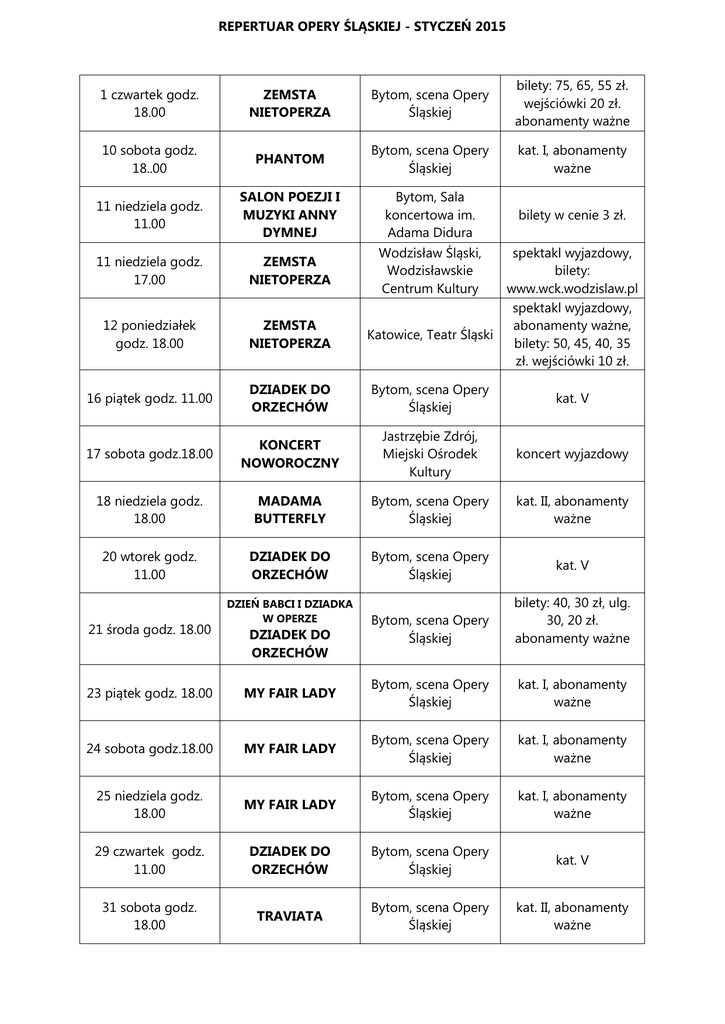 REPERTUAR OPERY ŚLĄSKIEJ - STYCZEŃ 2015 1 czwartek godz