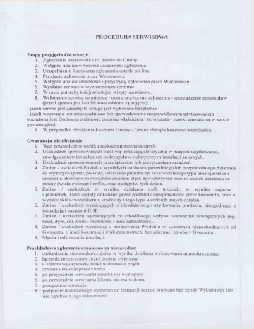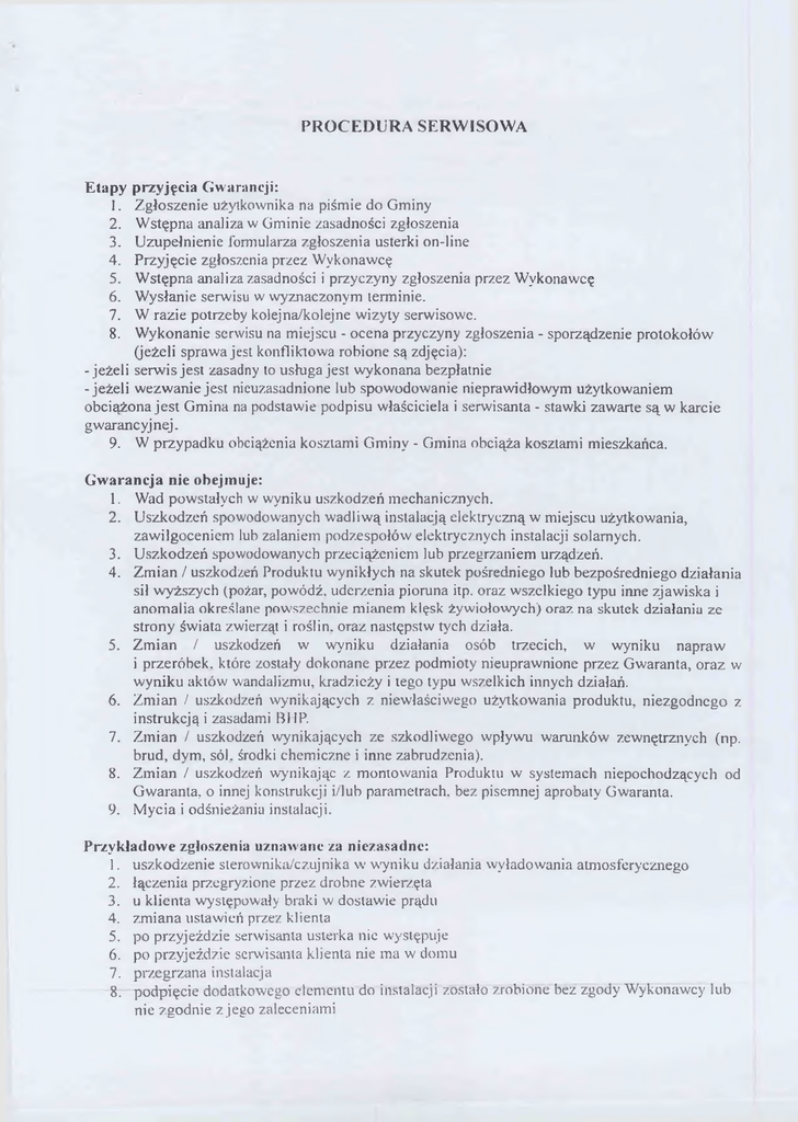 PROCEDURA SERWISOWA Etapy przyjęcia Gwarancji: 1. 2. 3. 4. 5. 6. 7. 8. Zgłoszenie użytkownika na piśmie do Gminy W stępna analiza w Gminie zasadności zgłoszenia Uzupełnienie formularza zgłoszenia usterki on-line Przyjęcie zgłoszenia przez Wykonawcę W stępna analiza zasadności i przyczyny zgłoszenia przez Wykonawcę W ysłanie serwisu w wyznaczonym terminie. W razie potrzeby kolejna/kolejne wizyty serwisowe. W ykonanie serwisu na miejscu - ocena przyczyny zgłoszenia - sporządzenie protokołów (jeżeli sprawa jest konfliktowa robione są zdjęcia): - jeżeli serwis jest zasadny to usługa jest wykonana bezpłatnie -jeżeli wezwanie jest nieuzasadnione lub spowodowanie nieprawidłowym użytkowaniem obciążona je st Gmina na podstawie podpisu właściciela i serwisanta - stawki zawarte są w karcie gwarancyjnej. 9. W przypadku obciążenia kosztami Gminy - Gmina obciąża kosztami mieszkańca. Gwarancja nie obejmuje: 1. Wad powstałych w wyniku uszkodzeń mechanicznych. 2. Uszkodzeń spowodowanych wadliwy instalacją elektryczną w miejscu użytkowania, zawilgoceniem lub zalaniem podzespołów elektrycznych instalacji solarnych. 3. Uszkodzeń spowodowanych przeciążeniem lub przegrzaniem urządzeń. 4. Zm ian / uszkodzeń Produktu wynikłych na skutek pośredniego lub bezpośredniego działania sił wyższych (pożar, powódź, uderzenia pioruna itp. oraz wszelkiego typu inne zjawiska i anom alia określane powszechnie mianem klęsk żywiołowych) oraz. na skutek działania ze strony świata zwierząt i roślin, oraz następstw tych działa. 5. Zm ian / uszkodzeń w wyniku działania osób trzecich, w wyniku napraw i przeróbek, które zostały dokonane przez podmioty nieuprawnione przez Gwaranta, oraz w wyniku aktów wandalizmu, kradzieży i tego typu wszelkich innych działań. 6. Zm ian / uszkodzeń wynikających z. niewłaściwego użytkowania produktu, niezgodnego z instrukcją i zasadami BI 1P. 7. Zm ian / uszkodzeń wynikających ze szkodliwego wpływu warunków zewnętrznych (np. brud, dym, sól. środki chemiczne i inne zabrudzenia). 8. Zm ian / uszkodzeń wynikając /. montowania Produktu w systemach niepochodzących od Gwaranta, o innej konstrukcji i/lub parametrach, bez pisemnej aprobaty Gwaranta. 9. M ycia i odśnieżaniu instalacji. Przykładowe zgłoszenia uznawane za niezasadne: 1. 2. 3. 4. 5. 6. 7. 8. uszkodzenie sterownika/czujnika w wyniku działania wyładowania atmosferycznego łączenia przegryzione przez drobne zwierzęta u klienta występowały braki w dostawie prądu zm iana ustawień przez klienta po przyjeździe serwisanta usterka nic występuje po przyjeździe serwisanta klienta nie ma w domu przegrzana instalacja podpięcie dodatkowego elementu do instalacji zostało zrobione bez zgody Wykonawcy lub nic zgodnie z jego zaleceniami Uwagi: 1. Za nieuzasadnione wezwanie serwisu Zgłaszający usterkę tj. Gmina <iub zostanie obciążony następująca kwotą wynikającą z poniższego cennika usług lecz nie mniejszą niż 500 zł/netto: - 60.00 zł/netto za każdą rozpoczętą roboczogod/inę serwisanta. - 0.84 zł/netto za każdy 1 kilometr dojazdu i odjazdu. 2. Podpięcie centralnego ogrzewania niezgodnie z naszym standardem będzie powodowało utratę gwarancji. ZGŁOSZENIE SERWISOWE 1. Data zgłoszenia serwisu 2. Imię mieszkańca 3. Nazw isko mieszkańca 4. M iejscowość 5. Ulica, nr. domu 6. Kod pocztowy, poczta 7. Telefon do mieszkańca 8. Dokładny opis zgłaszanego problemu 9. Typ/model reklamowanego urządzenia 10. N um er fabryczny reklamowanego urządzenia 1]. Czy instalacja obecnie działa 12. Informacje na temat dostępności mieszkańca Oświadczenie mieszkańca Jednocześnie oświadczam, że za nieuzasadnione wezwanie serwisu usunięcia awarii wyrażam zgodę na obciążenie mnie następującą kwotą wynikającą z poniższego cennika usług lecz nie mniejszą niż 500zl/netto: - 60,00 zł/netto za każdą rozpoczętą roboczogodzinę serwisanta. - 0,84 zł/netto za każdy 1 kilometr dojazdu i odjazdu. Przykładowe zgłoszenia uznawane za niezasadne: 1. Uszkodzenie sterownika/czujnika w wyniku działania wyładowania atmosferycznego 2. Łączenia przegryzione przez drobne zwierzęta 3. U mieszkańca występowały braki w dostawie prądu 4. Zmiana ustawień przez mieszkańca 5. Po przyjeżdzie serwisanta usterka nie występuje oraz brak udokumentowania, że wcześniej występowała* 6. Po przyjeżdzie serwisanta mieszkańca nie ma w domu. a był umówiony z Serwisem 7. Przegrzana instalacja z powodu braku odbioru wody 8. Podpięcie dodatkowego elementu do instalacji zostało zrobione bez zgody Wykonawcy lub nie zgodnie z jego zaleceniami. Załącza się dowody istnienia awarii* PODPIS MIESZKAŃCA ^podkreślić w przypadku załączenia dowodów (np. fotografii lub innych)