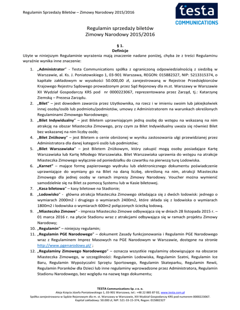 Regulamin Sprzedaży Biletów – Zimowy Narodowy 2015/2016 Regulamin sprzedaży biletów Zimowy Narodowy 2015/2016 § 1. Definicje Użyte w niniejszym Regulaminie wyrażenia mają znaczenie nadane poniżej, chyba że z treści Regulaminu wyraźnie wynika inne znaczenie: 1. „Administrator” - Testa Communications spółka z ograniczoną odpowiedzialnością z siedzibą w Warszawie, al. Ks. J. Poniatowskiego 1, 03-901 Warszawa, REGON: 015882327, NIP: 5213315374, o kapitale zakładowym w wysokości 50.000,00 zł, zarejestrowaną w Rejestrze Przedsiębiorców Krajowego Rejestru Sądowego prowadzonym przez Sąd Rejonowy dla m.st. Warszawy w Warszawie XII Wydział Gospodarczy KRS pod nr 0000223067, reprezentowana przez Zarząd, tj.: Katarzynę Ziemską – Prezesa Zarządu. 2. „Bilet” – jest dowodem zawarcia przez Użytkownika, na rzecz i w imieniu swoim lub jakiejkolwiek innej osoby/osób lub podmiotu/podmiotów, umowy z Administratorem na warunkach określonych Regulaminami Zimowego Narodowego; 3. „Bilet Indywidualny” – jest Biletem uprawniającym jedną osobę do wstępu na wskazaną na nim atrakcję na obszar Miasteczka Zimowego, przy czym za Bilet Indywidualny uważa się również Bilet bez wskazanej na nim liczby osób; 4. „Bilet Zniżkowy” – jest Biletem o cenie obniżonej w wyniku zastosowania ulgi przewidzianej przez Administratora dla danej kategorii osób lub podmiotów; 5. „Bilet Warszawiaka” – jest Biletem Zniżkowym, który zakupić mogą osoby posiadające Kartę Warszawiaka lub Kartę Młodego Warszawiaka. Bilet Warszawiaka uprawnia do wstępu na atrakcje Miasteczka Zimowego wyłącznie od poniedziałku do czwartku na pierwszą turę Lodowiska. 6. „Karnet” – mające formę papierowego wydruku lub elektronicznego dokumentu poświadczenie uprawniające do wymiany go na Bilet na daną liczbę, określoną na nim, atrakcji Miasteczka Zimowego dla jednej osoby w ramach imprezy Zimowy Narodowy. Voucher można wymienić samodzielnie się na Bilet za pomocą Systemu lub w Kasie biletowej. 7. „Kasa biletowa” – kasy biletowe na Stadionie; 8. „Lodowisko” - główna atrakcja Miasteczka Zimowego składająca się z dwóch lodowisk: jednego o wymiarach 2000m2 i drugiego o wymiarach 2400m2, które składa się z lodowiska o wymiarach 1800m2 i lodowiska o wymiarach 600m2 połączonych ścieżką lodową. 9. „Miasteczko Zimowe” - impreza Miasteczko Zimowe odbywająca się w dniach 28 listopada 2015 r. – 01 marca 2016 r. na płycie Stadionu wraz z atrakcjami odbywająca się w ramach projektu Zimowy Narodowy; 10. „Regulamin” – niniejszy regulamin; 11. „Regulamin PGE Narodowego” – dokument Zasady funkcjonowania i Regulamin PGE Narodowego wraz z Regulaminem Imprez Masowych na PGE Narodowym w Warszawie, dostępne na stronie http://www.pgenarodowy.pl/ ; 12. „Regulaminy Zimowego Narodowego” – oznacza wszystkie regulaminy obowiązujące na obszarze Miasteczka Zimowego, w szczególności: Regulamin Lodowiska, Regulamin Szatni, Regulamin Ice Baru, Regulamin Wypożyczalni Sprzętu Sportowego, Regulamin Skateparku, Regulamin Rewii, Regulamin Poranków dla Dzieci lub inne regulaminy wprowadzone przez Administratora, Regulamin Stadionu Narodowego, bez względu na nazwę tego dokumentu; TESTA Communications Sp. z o. o. Aleja Księcia Józefa Poniatowskiego 1, 03-901 Warszawa, tel.: +48 22 885 87 02, www.testa.com.pl Spółka zarejestrowana w Sądzie Rejonowym dla m. st. Warszawy w Warszawie, XIII Wydział Gospodarczy KRS pod numerem 0000223067. Kapitał zakładowy: 50.000 zł, NIP: 521-33-15-374, Regon: 015882327 Regulamin Sprzedaży Biletów – Zimowy Narodowy 2015/2016 13. „Skatepark”- jedna z atrakcji Zimowego Narodowego, mająca charakter ogólnodostępny, przeznaczony do indywidualnej bądź grupowej rekreacji na: deskorolkach, łyżworolkach, rolkach, hulajnogach, rowerach typu bmx lub longboard. 14. „Stadion” – PGE Narodowy w Warszawie; 15. „System” – System Sprzedaży Internetowej na stronie internetowej: www.bilety.zimowynarodowy.pl; 16. „Użytkownik” – każda osoba korzystająca z Systemu lub kupująca bilet na atrakcje Zimowego Narodowego; 17. „Voucher” – mające formę papierowego wydruku lub elektronicznego dokumentu poświadczenie uprawniające do wymiany go na Bilet na jedną, określoną na nim, atrakcję Miasteczka Zimowego dla jednej osoby w ramach imprezy Zimowy Narodowy. Voucher można wymienić samodzielnie się na Bilet za pomocą Systemu lub w Kasie biletowej. Voucher nie uprawnia do wymiany na Bilety Zniżkowe, Warszawiaka, Imienny, Indywidulany. Voucher nie gwarantuje dostępności Biletu na dowolnie wybrany w Systemie termin. 18. "Zimowy Narodowy" - projekt, którego organizatorem jest Administrator, odbywający się w dniach 28 listopada 2015 r. – 01 marca 2016 r. na Stadionie, w ramach, którego funkcjonuje Miasteczko Zimowe z atrakcjami. § 2. Postanowienia ogólne 1. Niniejszy Regulamin dotyczy sprzedaży i dystrybucji Biletów na atrakcje Zimowego Narodowego z wykorzystaniem Systemu w zakresie, w jakim prowadzi ją Administrator oraz sprzedaży Biletów w Kasie biletowej. 2. Przystępując do korzystania z Systemu lub zakupując Bilet w Kasie Biletowej Użytkownik akceptuje warunki niniejszego Regulaminu oraz Regulaminów Zimowego Narodowego. 3. Zakup Biletu przy wykorzystaniu Systemu możliwy jest wyłącznie po zaakceptowaniu Regulaminu, Regulaminu Stadionu i Regulaminów Zimowego Narodowego. Przy dokonywaniu zakupu w Kasie Biletowej Użytkownik akceptuje niniejszy Regulamin, Regulamin Stadionu i Regulaminy Zimowego Narodowego. 4. Kupno Biletu oznacza, że Użytkownik zapoznał się z treścią Regulaminu, Regulaminu Stadionu i Regulaminów Zimowego Narodowego. 5. Szczegóły dotyczące zasad korzystania z atrakcji Miasteczka Zimowego znajdują się w poszczególnych Regulaminach Zimowego Narodowego i mogą ulegać zmianie decyzją Administratora. Regulaminy Zimowego Narodowego