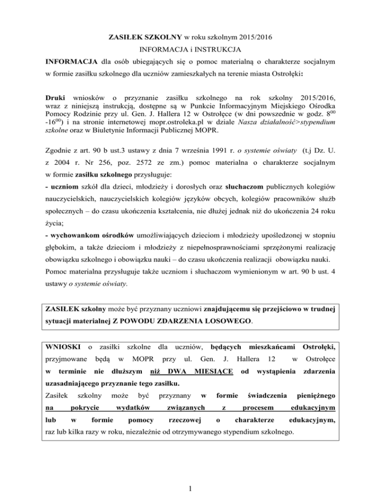 ZASIŁEK SZKOLNY w roku szkolnym 2015/2016 INFORMACJA i INSTRUKCJA INFORMACJA dla osób ubiegających się o pomoc materialną o charakterze socjalnym w formie zasiłku szkolnego dla uczniów zamieszkałych na terenie miasta Ostrołęki: Druki wniosków o przyznanie zasiłku szkolnego na rok szkolny 2015/2016, wraz z niniejszą instrukcją, dostępne są w Punkcie Informacyjnym Miejskiego Ośrodka Pomocy Rodzinie przy ul. Gen. J. Hallera 12 w Ostrołęce (w dni powszednie w godz. 800 -1600) i na stronie internetowej mopr.ostroleka.pl w dziale Nasza działalność>stypendium szkolne oraz w Biuletynie Informacji Publicznej MOPR. Zgodnie z art. 90 b ust.3 ustawy z dnia 7 września 1991 r. o systemie oświaty (t.j Dz. U. z 2004 r. Nr 256, poz. 2572 ze zm.) pomoc materialna o charakterze socjalnym w formie zasiłku szkolnego przysługuje: - uczniom szkół dla dzieci, młodzieży i dorosłych oraz słuchaczom publicznych kolegiów nauczycielskich, nauczycielskich kolegiów języków obcych, kolegiów pracowników służb społecznych – do czasu ukończenia kształcenia, nie dłużej jednak niż do ukończenia 24 roku życia; - wychowankom ośrodków umożliwiających dzieciom i młodzieży upośledzonej w stopniu głębokim, a także dzieciom i młodzieży z niepełnosprawnościami sprzężonymi realizację obowiązku szkolnego i obowiązku nauki – do czasu ukończenia realizacji obowiązku nauki. Pomoc materialna przysługuje także uczniom i słuchaczom wymienionym w art. 90 b ust. 4 ustawy o systemie oświaty. ZASIŁEK szkolny może być przyznany uczniowi znajdującemu się przejściowo w trudnej sytuacji materialnej Z POWODU ZDARZENIA LOSOWEGO. WNIOSKI o zasiłki szkolne dla uczniów, będących mieszkańcami Ostrołęki, przyjmowane będą w nie terminie w MOPR dłuższym przy niż ul. DWA Gen. J. Hallera MIESIĄCE od 12 w Ostrołęce wystąpienia zdarzenia uzasadniającego przyznanie tego zasiłku. Zasiłek szkolny na pokrycie lub w może formie być wydatków pomocy przyznany w formie związanych rzeczowej z o świadczenia pieniężnego procesem edukacyjnym charakterze edukacyjnym, raz lub kilka razy w roku, niezależnie od otrzymywanego stypendium szkolnego. 1 Wysokość zasiłku szkolnego nie może przekroczyć jednorazowo kwoty stanowiącej pięciokrotności kwoty, o której mowa w art. 6 ust. 2 ustawy z dnia 28 listopada 2003r. o świadczeniach rodzinnych (Dz. U. z 2006r. Nr 139, poz. 992 ze zm.) Uczeń/słuchacz musi być mieszkańcem Miasta Ostrołęki. W przypadku osób, które posiadają adres stałego zameldowania poza terenem Ostrołęki do wniosku należy dołączyć umowę najmu lokalu lub zaświadczenie o zameldowaniu na pobyt czasowy na terenie Ostrołęki (oświadczenie właściciela mieszkania o wynajmie lokalu). Świadczenia pomocy materialnej o charakterze socjalnym są przyznawane NA WNIOSEK rodziców albo pełnoletniego ucznia, wniosek odpowiednio dyrektora szkoły, kolegium nauczycielskiego, nauczycielskiego kolegium języków obcych, kolegium pracowników służb społecznych lub ośrodka, o którym mowa w art. 90b ust. 3 pkt 2 ustawy o systemie oświaty. Informacje w sprawie zasiłków szkolnych można uzyskać w Miejskim Ośrodku Pomocy Rodzinie w Ostrołęce, ul. Gen. J. Hallera 12, tel. (029) 769-33-68 lub (29)764-41-30. INSTRUKCJA wypełniania wniosku Przed rozpoczęciem wypełniania wniosku należy zapoznać się z instrukcją! W przypadku składania wniosków dla kilku uczniów, należy złożyć: wnioski ODDZIELNIE DLA KAŻDEGO ucznia, natomiast wymagane ZAŁĄCZNIKI do wniosku należy złożyć w jednym egzemplarzu przy dowolnym wniosku. Wysokość dochodu ustalana jest na zasadach określonych w art. 8 ust.3 –13 ustawy z dnia 12 marca 2004r. o pomocy społecznej (t.j. Dz.U. z 2013 r., poz 182 ze zm.) DOKUMENTY, jakie należy dołączyć do wniosku: kserokopia dowodu osobistego wnioskodawcy dokumenty potwierdzające dochody rodziny dokumenty potwierdzające zdarzenie losowe Uwaga! Składając kopie dokumentów należy okazać oryginały! 2