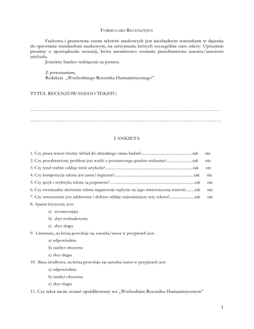FORMULARZ RECENZYJNY Fachowa i gruntowna ocena tekstów naukowych jest niezbędnym warunkiem w dążeniu do sprostania standardom naukowym, na utrzymaniu których szczególnie nam zależy. Uprzejmie prosimy o sporządzenie recenzji, która anonimowo zostanie przedstawiona autorce/autorowi artykułu. Jesteśmy bardzo wdzięczni za pomoc. Z poważaniem, Redakcja „Wschodniego Rocznika Humanistycznego” TYTUŁ RECENZOWANEGO TEKSTU: ………………………………………………………………………………………………… …………………………………………………………………………………………………. I ANKIETA 1. Czy praca wnosi istotny wkład do aktualnego stanu badań?..................................................tak nie 2. Czy przedstawiony problem jest ważki z poznawczego punktu widzenia?..........................tak nie 3. Czy tytuł trafnie oddaje treść artykułu?......................................................................................tak nie 4. Czy kompozycja tekstu jest jasna i logiczna?..............................................................................tak nie 5. Czy język i stylistyka tekstu są poprawne? ..................................................................................tak nie 6. Czy ewentualne skrócenie tekstu negatywnie wpłynie na jego merytoryczną wartość.........tak nie 7. Czy streszczenie jest adekwatne i dobrze oddaje najważniejsze tezy tekstu?.........................tak nie 8. Aparat krytyczny jest: a) wystarczający b) zbyt rozbudowany c) zbyt skąpy 9. Literatura, na którą powołuje się autorka/autor w przypisach jest: a) odpowiednia b) nazbyt obszerna c) zbyt skąpa 10. Baza źródłowa, na którą powołuje się autorka/autor w przypisach jest: a) odpowiednia b) nazbyt obszerna c) zbyt skąpa 11. Czy tekst może zostać opublikowany we „Wschodnim Roczniku Humanistycznym” 1 a) w obecnej formie b) po wprowadzeniu drobnych poprawek c) po wprowadzeniu zmian d) po wprowadzeniu gruntownych zmian e) nie nadaje się do publikacji II CZĘŚĆ OPISOWA (PROSIMY O KRÓTKĄ ODPOWIEDŹ NA PONIŻSZE PYTANIA) 1. CZY CELE TEKSTU SĄ TRAFNIE SFORMUŁOWANE I JASNE DLA CZYTELNIKA? 2. CZY CELE TEKSTU ZOSTAŁY ZREALIZOWANE W SPOSÓB ZADOWALAJĄCY? 3. CZY ZASTOSOWANA METODOLOGIA JEST ODPOWIEDNIA? 4. JAKI JEST STOSUNEK TREŚCI ARTYKUŁU DO DOTYCHCZASOWYCH USTALEŃ/OBECNEGO STANU BADAŃ? 5. CZY TEKST JEST WEWNĘTRZNIE SPÓJNY? ARGUMENTACJA PRZEKONUJĄCA? 6. UWAGI DOTYCZĄCE KOMPOZYCJI 2 7. UWAGI DOTYCZĄCE STYLISTYKI 8. INNE (EWENTUALNIE) 9. PODSUMOWANIE (ZWIĘZŁA OCENA TEKSTU) 10. ZALECANE POPRAWKI ............................................................................ IMIĘ, NAZWISKO I AFILIACJA RECENZENTA 3