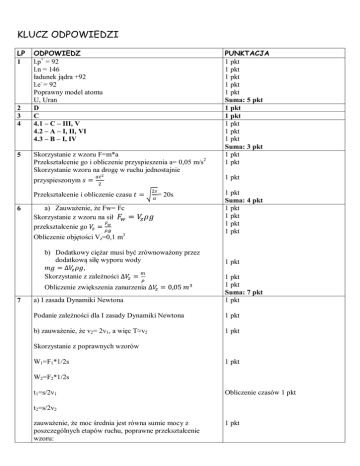 KLUCZ ODPOWIEDZI LP 1 2 3 4 5 ODPOWIEDZ l.p+ = 92 l.n = 146 ładunek jądra +92 l.e- = 92 Poprawny model atomu U, Uran D C 4.1 – C – III, V 4.2 – A – I, II, VI 4.3 – B – I, IV Skorzystanie z wzoru F=m*a Przekształcenie go i obliczenie przyspieszenia a= 0,05 m/s2 Skorzystanie wzoru na drogę w ruchu jednostajnie 1 pkt przyspieszonym Przekształcenie i obliczenie czasu 6 = 20s a) Zauważenie, że Fw= Fc Skorzystanie z wzoru na sił przekształcenie go Obliczenie objętości Vz=0,1 m3 b) Dodatkowy ciężar musi być zrównoważony przez dodatkową siłę wyporu wody , Skorzystanie z zależności 1 pkt Suma: 4 pkt 1 pkt 1 pkt 1 pkt 1 pkt 1 pkt a) I zasada Dynamiki Newtona 1 pkt 1 pkt Suma: 7 pkt 1 pkt Podanie zależności dla I zasady Dynamiki Newtona 1 pkt b) zauważenie, że v2= 2v1, a więc T≈v2 1 pkt Obliczenie zwiększenia zanurzenia 7 PUNKTACJA 1 pkt 1 pkt 1 pkt 1 pkt 1 pkt Suma: 5 pkt 1 pkt 1 pkt 1 pkt 1 pkt 1 pkt Suma: 3 pkt 1 pkt 1 pkt Skorzystanie z poprawnych wzorów W1=F1*1/2s 1 pkt W2=F2*1/2s t1=s/2v1 Obliczenie czasów 1 pkt t2=s/2v2 zauważenie, że moc średnia jest równa sumie mocy z poszczególnych etapów ruchu, poprawne przekształcenie wzoru: 1 pkt Poprawne obliczenie i podanie wyniku 8 9 10 Pśr W1 W2 t1 t 2 Pśr ( F1 F2 )v1v 2 v1 v 2 Pśr 20000W Poprawne uzasadnienie C Zastosowanie zasady zachowania energii Ek= Ep Przekształcenie wzoru Obliczenie v= 20 m/s Zauważenie, że prędkość uzyskana przy zderzeniu zmaleje o 25% , a więc wyniesie 15 m/s Ponowne zastosowanie zasady zachowania energii i wyprowadzenie wzoru na uzyskaną wysokość 1 pkt Suma: 7 pkt 1 pkt 1 pkt 1 pkt 1 pkt 1 pkt 1 pkt 1 pkt Obliczenie wysokości, na którą wzniesie się piłka po odbiciu od 1 pkt podłoża h= 11,25 m Suma: 6 pkt Maksymalna liczba punktów 36 Opracowane przez: mgr Wiesława Wiatrak mgr Ana Zając Bardzo proszę o nadesłanie prac uczniów którzy zdobyli 40% z maksymalnej ilości punktów oraz protokół z olimpiady (przyjmujemy prace od 14 punktów). Proszę o przesłanie protokołu w formie pisemnej wraz z pracami konkursowymi oraz w formie elektronicznej na adres [email protected] Wzór protokołu znajduje się na stronie gimnazjum www.gim1.rabawyzna.pl