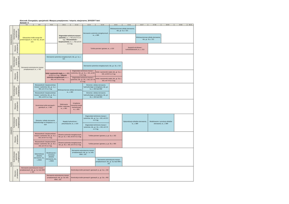 Kierunek: Energetyka, specjalność: Maszyny przepływowe, I stopnia, stacjonarne, 2016/2017 letni Semestr: 6 Automatyzacja systemów energetycznych 13-14 14-15 Diagnostyka techniczna maszyn i systemów, w., s. 702 od 27 II co 2 tyg. / Niezawodność i bezpieczeństwo, w., s. 702 od 6 III co 2 tyg. Odnawialne źródła energii dla powtarzających, w., Aud. Sip., do poł. sem. 16-17 17-18 18-19 Sterowanie systemów energetycznych, w., s. 809 Wielowymiarowe układy sterowania, lab., gr. 1b, s. 521 Turbiny parowe i gazowe, w., s. 619 Sprężarki wirnikowe i turbodoładowarki, w., s. 213 Sterowanie systemów energetycznych, lab., gr. 1a, s. 521 Sterowanie systemów energetycznych, lab., gr. 1b, s. 521 Sterowanie automatyczne maszyn przepływowych, w., s. 702 Diagnostyka techniczna maszyn i Kotły i wymienniki ciepła, lab., gr. 2a, s. Kotły i wymienniki ciepła, w., s. 802, systemów, lab., gr. 2a, s. 163, od 28 163, od 28 II co 2 tyg. II co 2 tyg. od 28 II co 2 tyg. / Siłownie systemów energetycznych, w., s. Diagnostyka techniczna maszyn i Kotły i wymienniki ciepła, lab., gr. 2b, s. 802, od 7 III co 2 tyg. systemów, lab., gr. 2b, s. 163, od 7 III 163, od 7 III co 2 tyg. co 2 tyg. Niezawodność i bezpieczeństwo maszyn i systemów, lab., gr. 1a, s. 902, od 1 III co 2 tyg Niezawodność i bezpieczeństwo maszyn i systemów, lab., gr. 1b, s. 902, od 8 III co 2 tyg Wielowymiarowe układy sterowania, w., s. 803 Elementy i układy sterowania hydraulicznego w energetyce, lab., gr. 1a, s. 106 hala WM Elementy i układy sterowania hydraulicznego w energetyce, lab., gr. 1b, s. 106 hala WM Napędy hydrauliczne i pneumatyczne, w., s. 619 Niezawodność i bezpieczeństwo maszyn i systemów, lab., gr. 2a, s. 163, od 23 II co 2 tyg. Siłownie systemów energetycznych, lab., gr. 2a, s. 163, od 23 II co 2 tyg. Turbiny parowe i gazowe, p., gr. 2a, s. 162 Niezawodność i bezpieczeństwo maszyn i systemów, lab., gr. 2b, s. 163, od 2 III co 2 tyg. Siłownie systemów energetycznych, lab., gr. 2b, s. 163, od 2 III co 2 tyg. Turbiny parowe i gazowe, p., gr. 2b, s. 903 Automatyzacja systemów energetycznych 15-16 Wielowymiarowe układy sterowania, lab., gr. 1a, s. 521 Maszyny przepływowe Automatyzacja systemów energetycznych 12-13 Automatyzacja systemów energetycznych ŚRODA 11-12 Elementy i układy sterowania hydraulicznego w energetyce, w., s. 619 Maszyny przepływowe CZWARTEK 10-11 Konstrukcja turbin parowych i gazowych, w., s. 802 Maszyny przepływowe PIĄTEK 9-10 Maszyny przepływowe Automatyzacja systemów energetycznych 8-9 Maszyny przepływowe WTOREK PONIEDZIAŁEK 7-8 Urządzenia Elektrownie transmisji energii wodne i wiatrowe, mechanicznej, w., s. 801 w., s. 801 Modelowanie i Optymalizacja symulacja układów układów sterowania, ćw., sterowania, ćw., s. 803A s. 803A Sterowanie automatyczne maszyn przepływowych, lab., gr. 2a, hala WM s. 101 Diagnostyka techniczna maszyn i systemów, lab., gr. 1a, s. 163, od 23 II co 2 tyg. Diagnostyka techniczna maszyn i systemów, lab., gr. 1b, s. 163, od 2 III co 2 tyg. Sterowanie automatyczne maszyn przepływowych, lab., gr. 1a, hala WM s. 101 Sterowanie automatyczne maszyn przepływowych, lab., gr. 1b, hala WM s. 101 Konstrukcja turbin parowych i gazowych, p., gr. 2a, s. 162 Sterowanie automatyczne maszyn przepływowych, lab., gr. 2b, hala WM s. 101 Konstrukcja turbin parowych i gazowych, p., gr. 2b, s. 902 Optymalizacja układów sterowania, w., s. 809 Modelowanie i symulacja układów sterowania, w., s. 809 19-20 20-21
