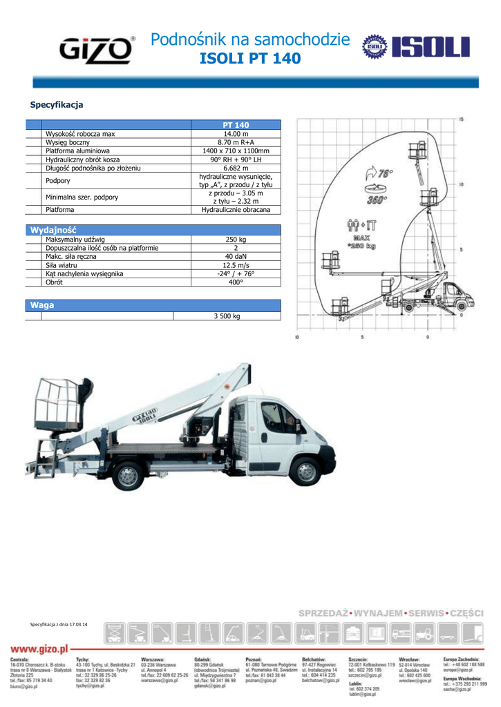 Podnośnik na samochodzie ISOLI PT 140 Specyfikacja PT 140 Wysokość robocza max Wysięg boczny Platforma aluminiowa Hydrauliczny obrót kosza Długość podnośnika po złożeniu Podpory Minimalna szer. podpory Platforma 14.00 m 8.70 m R+A 1400 x 710 x 1100mm 90° RH + 90° LH 6.682 m hydrauliczne wysunięcie, typ „A”, z przodu / z tyłu z przodu – 3.05 m z tyłu – 2.32 m Hydraulicznie obracana Wydajność Maksymalny udźwig Dopuszczalna ilość osób na platformie Makc. siła ręczna Siła wiatru Kąt nachylenia wysięgnika Obrót 250 kg 2 40 daN 12.5 m/s -24° / + 76° 400° Waga 3 500 kg Specyfikacja z dnia 17.03.14 Podnośnik na samochodzie ISOLI PT 140 Charakterystyka Standardowe wyposażenie - wysokość robocza – 13,5 m wysięg – 8,7 m / 200 kg w koszu udźwig – 250 kg /2 osoby Opcje dodatkowe - - Podnośnik zamontowany na podwoziu - NISSAN CABSTAR lub Renault Maxity Wyposażenie - podpory 300 x 300 mm podpory 400 x 400 mm - podpory 550 x 320 mm z aluminiowym profilem - automatyczna stabilizacja instalacja wodna / powietrza do kosza podnośnika znaki reklamowe niestandardowe malowanie burty na podstawie maszyny H=100 mm burty na podstawie maszyny H=200 mm pomocnicza pompa elektryczna zasilana z zewnętrznej sieci elektrycznej jednofazowej 220V Część podnośnika - podnośnik teleskopowy 2-sekcyjny automatyczne poziomowanie kosza kosz aluminiowy hydrauliczny obrót kosza +/-90 stopni sterowanie elektrozaworami malowanie w jednym kolorze RAL Kosz kosz aluminiowy dla 2 osób udźwig 250 kg wymiary 1400 x 710 x 1100mm Podpory - 4 podpory stabilizujące styl A + A– sterowane hydraulicznie zabezpieczenie wraz z światłem diagnostycznym (stabilizacja maszyny i podpór możliwa tylko podczas postoju) uniemożliwia jazdę jadą z nie w pełni złożonymi podporami Rama - pojemnik na narzędzia antypoślizgowa podłoga aluminiowa opuszczanie awaryjne –manualne z poziomu dolnego drabinka do kosza podnośnika błotniki na tylnych kołach gniazdo elektryczne z 220V w koszu podnośnika kolor czarny RAL Sterowanie - proporcjonalne sterowanie hydrauliczne, możliwość wykonywania wielu operacji jednocześnie górny i dolny panel sterowania start i stop z silnika z obu paneli sterowania magnetyczne światło ostrzegawcze tzw. kogut elektroniczne ograniczniki wysięgu z podwójnym zabezpieczeniem i światłami diagnostycznymi stacyjka z możliwością wyboru sposobu obsługi funkcji - jednej z 3:, pulpit górny, pulpit dolny, obsługa podpór stabilizacyjnych system anty kolizyjny (pomiędzy wysięgnikiem a kabina, wysięgnikiem a koszem, podporami a drzwiami kabiny ) lampka ostrzegawcza w kabinie informująca o nieprawidłowej pozycji podpór lub kosza podczas jazdy izolacja całej struktury maszyny wraz z koszem umożliwiająca bezpieczną pracę przy napięciu do 1000 V (wraz z certyfikatem) izolacja samego kosza maszyny umożliwiająca bezpieczna pracę przy napięciu do 1000 V (wraz z certyfikatem) -
