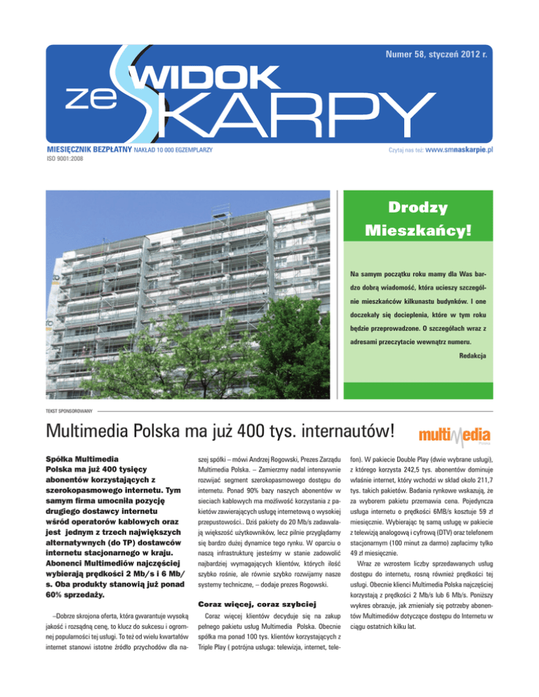 Magazyn mieszkańców SM „Na Skarpie” Numer 58, styczeń 2012 r. MIESIĘCZNIK BEZPŁATNY NAKŁAD 10 000 EGZEMPLARZY Czytaj nas też: www.smnaskarpie.pl ISO 9001:2008 Drodzy Mieszkańcy! Na samym początku roku mamy dla Was bardzo dobrą wiadomość, która ucieszy szczególnie mieszkańców kilkunastu budynków. I one doczekały się docieplenia, które w tym roku będzie przeprowadzone. O szczegółach wraz z adresami przeczytacie wewnątrz numeru. Redakcja TEKST SPONSOROWANY Multimedia Polska ma już 400 tys. internautów! Spółka Multimedia Polska ma już 400 tysięcy abonentów korzystających z szerokopasmowego internetu. Tym samym firma umocniła pozycję drugiego dostawcy internetu wśród operatorów kablowych oraz jest jednym z trzech największych alternatywnych (do TP) dostawców internetu stacjonarnego w kraju. Abonenci Multimediów najczęściej wybierają prędkości 2 Mb/s i 6 Mb/ s. Oba produkty stanowią już ponad 60% sprzedaży. szej spółki – mówi Andrzej Rogowski, Prezes Zarządu Multimedia Polska. – Zamierzmy nadal intensywnie rozwijać segment szerokopasmowego dostępu do internetu. Ponad 90% bazy naszych abonentów w sieciach kablowych ma możliwość korzystania z pakietów zawierających usługę internetową o wysokiej przepustowości.. Dziś pakiety do 20 Mb/s zadawalają większość użytkowników, lecz pilnie przyglądamy się bardzo dużej dynamice tego rynku. W oparciu o naszą infrastrukturę jesteśmy w stanie zadowolić najbardziej wymagających klientów, których ilość szybko rośnie, ale równie szybko rozwijamy nasze systemy techniczne, – dodaje prezes Rogowski. Coraz więcej, coraz szybciej –Dobrze skrojona oferta, która gwarantuje wysoką jakość i rozsądną cenę, to klucz do sukcesu i ogromnej popularności tej usługi. To też od wielu kwartałów internet stanowi istotne źródło przychodów dla na- Coraz więcej klientów decyduje się na zakup pełnego pakietu usług Multimedia Polska. Obecnie spółka ma ponad 100 tys. klientów korzystających z Triple Play ( potrójna usługa: telewizja, internet, tele- fon). W pakiecie Double Play (dwie wybrane usługi), z którego korzysta 242,5 tys. abonentów dominuje właśnie internet, który wchodzi w skład około 211,7 tys. takich pakietów. Badania rynkowe wskazują, że za wyborem pakietu przemawia cena. Pojedyncza usługa internetu o prędkości 6MB/s kosztuje 59 zł miesięcznie. Wybierając tę samą usługę w pakiecie z telewizją analogową i cyfrową (DTV) oraz telefonem stacjonarnym (100 minut za darmo) zapłacimy tylko 49 zł miesięcznie. Wraz ze wzrostem liczby sprzedawanych usług dostępu do internetu, rosną również prędkości tej usługi. Obecnie klienci Multimedia Polska najczęściej korzystają z prędkości 2 Mb/s lub 6 Mb/s. Poniższy wykres obrazuje, jak zmieniały się potrzeby abonentów Multimediów dotyczące dostępu do Internetu w ciągu ostatnich kilku lat.