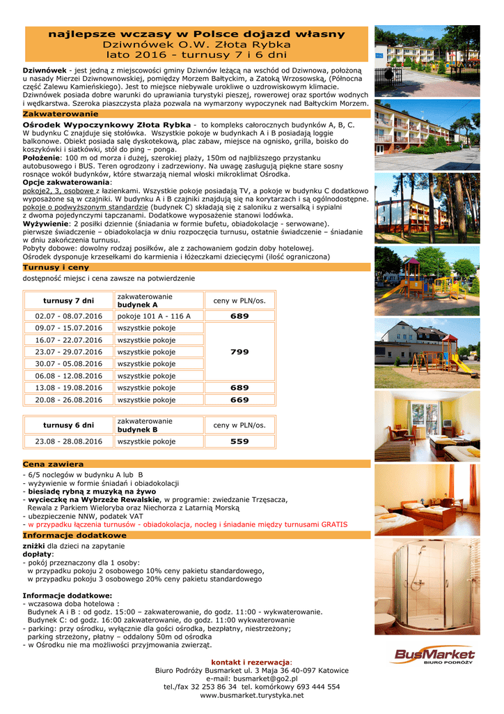 najlepsze wczasy w Polsce dojazd własny Dziwnówek O.W. Złota Rybka lato 2016 - turnusy 7 i 6 dni Dziwnówek - jest jedną z miejscowości gminy Dziwnów leżącą na wschód od Dziwnowa, położoną u nasady Mierzei Dziwnownowskiej, pomiędzy Morzem Bałtyckim, a Zatoką Wrzosowską, (Północna część Zalewu Kamieńskiego). Jest to miejsce niebywale urokliwe o uzdrowiskowym klimacie. Dziwnówek posiada dobre warunki do uprawiania turystyki pieszej, rowerowej oraz sportów wodnych i wędkarstwa. Szeroka piaszczysta plaża pozwala na wymarzony wypoczynek nad Bałtyckim Morzem. Zakwaterowanie Ośrodek Wypoczynkowy Złota Rybka - to kompleks całorocznych budynków A, B, C. W budynku C znajduje się stołówka. Wszystkie pokoje w budynkach A i B posiadają loggie balkonowe. Obiekt posiada salę dyskotekową, plac zabaw, miejsce na ognisko, grilla, boisko do koszykówki i siatkówki, stół do ping – ponga. Położenie: 100 m od morza i dużej, szerokiej plaży, 150m od najbliższego przystanku autobusowego i BUS. Teren ogrodzony i zadrzewiony. Na uwagę zasługują piękne stare sosny rosnące wokół budynków, które stwarzają niemal włoski mikroklimat Ośrodka. Opcje zakwaterowania: pokoje2, 3, osobowe z łazienkami. Wszystkie pokoje posiadają TV, a pokoje w budynku C dodatkowo wyposażone są w czajniki. W budynku A i B czajniki znajdują się na korytarzach i są ogólnodostępne. pokoje o podwyższonym standardzie (budynek C) składają się z saloniku z wersalką i sypialni z dwoma pojedynczymi tapczanami. Dodatkowe wyposażenie stanowi lodówka. Wyżywienie: 2 posiłki dziennie (śniadania w formie bufetu, obiadokolacje - serwowane). pierwsze świadczenie – obiadokolacja w dniu rozpoczęcia turnusu, ostatnie świadczenie – śniadanie w dniu zakończenia turnusu. Pobyty dobowe: dowolny rodzaj posiłków, ale z zachowaniem godzin doby hotelowej. Ośrodek dysponuje krzesełkami do karmienia i łóżeczkami dziecięcymi (ilość ograniczona) Turnusy i ceny dostępność miejsc i cena zawsze na potwierdzenie turnusy 7 dni zakwaterowanie budynek A 02.07 - 08.07.2016 pokoje 101 A - 116 A 09.07 - 15.07.2016 wszystkie pokoje ceny w PLN/os. 689 16.07 - 22.07.2016 wszystkie pokoje 23.07 - 29.07.2016 wszystkie pokoje 30.07 - 05.08.2016 wszystkie pokoje 06.08 - 12.08.2016 wszystkie pokoje 13.08 - 19.08.2016 wszystkie pokoje 689 20.08 - 26.08.2016 wszystkie pokoje 669 turnusy 6 dni zakwaterowanie budynek B ceny w PLN/os. 23.08 - 28.08.2016 wszystkie pokoje 559 799 a Cena zawiera - 6/5 noclegów w budynku A lub B wyżywienie w formie śniadań i obiadokolacji biesiadę rybną z muzyką na żywo wycieczkę na Wybrzeże Rewalskie, w programie: zwiedzanie Trzęsacza, Rewala z Parkiem Wieloryba oraz Niechorza z Latarnią Morską - ubezpieczenie NNW, podatek VAT - w przypadku łączenia turnusów - obiadokolacja, nocleg i śniadanie między turnusami GRATIS Informacje dodatkowe zniżki dla dzieci na zapytanie dopłaty: - pokój przeznaczony dla 1 osoby: w przypadku pokoju 2 osobowego 10% ceny pakietu standardowego, w przypadku pokoju 3 osobowego 20% ceny pakietu standardowego Informacje dodatkowe: - wczasowa doba hotelowa : Budynek A i B : od godz. 15:00 – zakwaterowanie, do godz. 11:00 - wykwaterowanie. Budynek C: od godz. 16:00 zakwaterowanie, do godz. 11:00 wykwaterowanie - parking: przy ośrodku, wyłącznie dla gości ośrodka, bezpłatny, niestrzeżony; parking strzeżony, płatny – oddalony 50m od ośrodka - w Ośrodku nie ma możliwości przyjmowania zwierząt. kontakt i rezerwacja: Biuro Podróży Busmarket ul. 3 Maja 36 40-097 Katowice e-mail: [email protected] tel./fax 32 253 86 34 tel. komórkowy 693 444 554 www.busmarket.turystyka.net - wycieczki fakultatywne : śladami średniowiecza (zwiedzanie Kamienia Pomorskiego, skansen Wikingów w Wolinie, Międzyzdroje), wycieczka Świnoujście w pigułce i rejs statkiem po Świnie, wycieczka do Kołobrzegu wraz z ogrodami świata w Dobrzycy. Opłata za imprezy fakultatywne płatna indywidualnie w ośrodku kontakt i rezerwacja: Biuro Podróży Busmarket ul. 3 Maja 36 40-097 Katowice e-mail: [email protected] tel./fax 32 253 86 34 tel. komórkowy 693 444 554 www.busmarket.turystyka.net