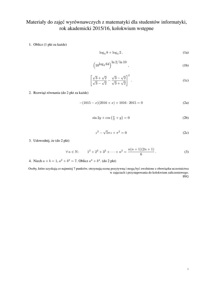 Materiały do zaj˛eć wyrównawczych z matematyki dla studentów informatyki, rok akademicki 2015/16, kolokwium wst˛epne 1. Oblicz (1 pkt za każde) log4 8 + log4 2 , 10log2 64 ln 2/ ln 10 (1a) , (1b) "√ √ √ √ #2 3+ 2 3− 2 √ √ −√ √ . 3− 2 3+ 2 (1c) 2. Rozwia˛ż równania (do 2 pkt za każde) −(1015 − x)(2016 + x) + 1016 · 2015 = 0 sin 2y + cos z2 − √ π 2 +y =0 5πz + π 2 = 0 (2a) (2b) (2c) 3. Udowodnij, że (do 2 pkt) ∀ n ∈ N: 1 2 + 2 2 + 3 2 + · · · + n2 = n(n + 1)(2n + 1) . 6 (3) 4. Niech a + b = 1, a2 + b2 = 7. Oblicz a4 + b4 . (do 2 pkt) Osoby, które uzyskaja˛ co najmniej 7 punktów, otrzymaja˛ ocen˛e pozytywna˛ i moga˛ być zwolnione z obowiazku ˛ uczestnictwa w zaj˛eciach i przyst˛epowania do kolokwium zaliczeniowego. PFG 1