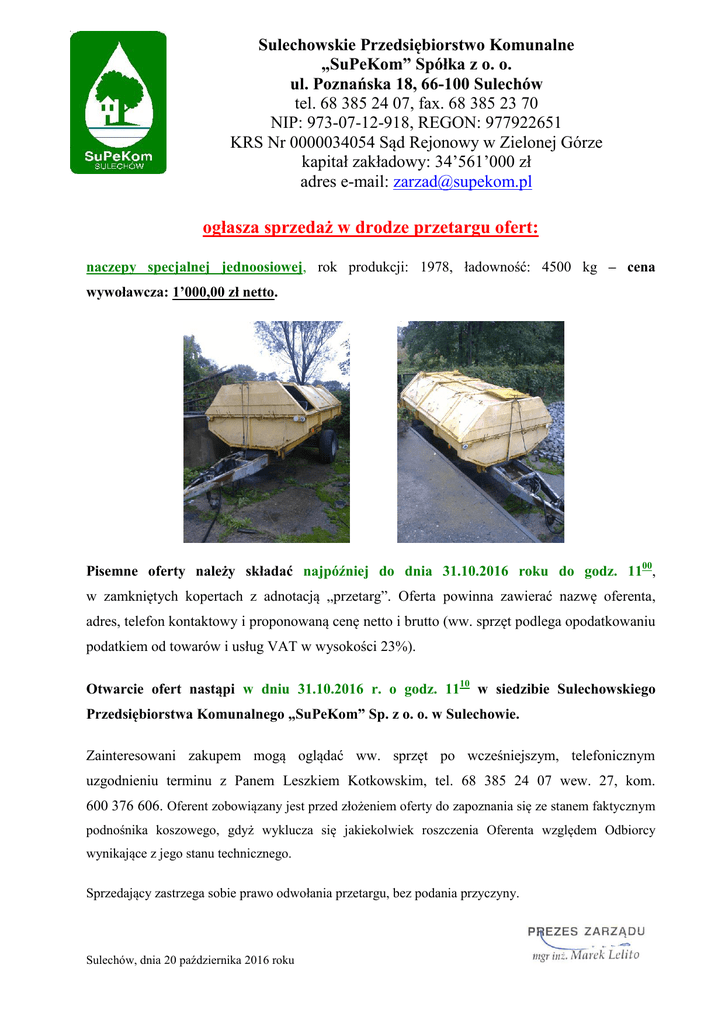 Sulechowskie Przedsiębiorstwo Komunalne „SuPeKom” Spółka z o. o. ul. Poznańska 18, 66-100 Sulechów tel. 68 385 24 07, fax. 68 385 23 70 NIP: 973-07-12-918, REGON: 977922651 KRS Nr 0000034054 Sąd Rejonowy w Zielonej Górze kapitał zakładowy: 34’561’000 zł adres e-mail: [email protected] ogłasza sprzedaż w drodze przetargu ofert: naczepy specjalnej jednoosiowej, rok produkcji: 1978, ładowność: 4500 kg – cena wywoławcza: 1’000,00 zł netto. Pisemne oferty należy składać najpóźniej do dnia 31.10.2016 roku do godz. 1100, w zamkniętych kopertach z adnotacją „przetarg”. Oferta powinna zawierać nazwę oferenta, adres, telefon kontaktowy i proponowaną cenę netto i brutto (ww. sprzęt podlega opodatkowaniu podatkiem od towarów i usług VAT w wysokości 23%). Otwarcie ofert nastąpi w dniu 31.10.2016 r. o godz. 1110 w siedzibie Sulechowskiego Przedsiębiorstwa Komunalnego „SuPeKom” Sp. z o. o. w Sulechowie. Zainteresowani zakupem mogą oglądać ww. sprzęt po wcześniejszym, telefonicznym uzgodnieniu terminu z Panem Leszkiem Kotkowskim, tel. 68 385 24 07 wew. 27, kom. 600 376 606. Oferent zobowiązany jest przed złożeniem oferty do zapoznania się ze stanem faktycznym podnośnika koszowego, gdyż wyklucza się jakiekolwiek roszczenia Oferenta względem Odbiorcy wynikające z jego stanu technicznego. Sprzedający zastrzega sobie prawo odwołania przetargu, bez podania przyczyny. Sulechów, dnia 20 października 2016 roku