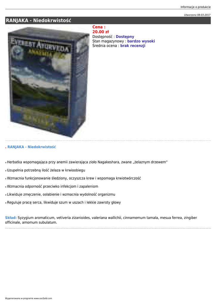Informacje o produkcie Utworzono 08-03-2017 RANJAKA - Niedokrwistość Cena : 20.00 zł Dostępność : Dostępny Stan magazynowy : bardzo wysoki Średnia ocena : brak recenzji . RANJAKA - Niedokrwistość ¤ Herbatka wspomagająca przy anemii zawierająca zioło Nagakeshara, zwane „żelaznym drzewem“ ¤ Uzupełnia potrzebną ilość żelaza w krwioobiegu ¤ Wzmacnia funkcjonowanie śledziony, oczyszcza krew i wspomaga krwiotwórczość ¤ Wzmacnia odporność przeciwko infekcjom i zapaleniom ¤ Likwiduje zmęczenie, osłabienie i wzmacnia wydolność organizmu ¤ Reguluje pracę serca, likwiduje szum w uszach i lekkie zawroty głowy Skład: Syzygium aromaticum, vetiveria zizanioides, valeriana wallichii, cinnamomum tamala, mesua ferrea, zingiber officinale, amomum subulatum. Wygenerowano w programie www.oscGold.com