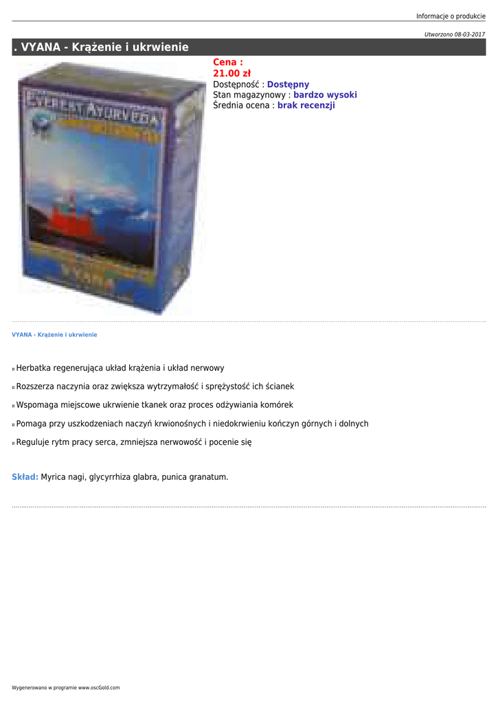 Informacje o produkcie Utworzono 08-03-2017 . VYANA - Krążenie i ukrwienie Cena : 21.00 zł Dostępność : Dostępny Stan magazynowy : bardzo wysoki Średnia ocena : brak recenzji VYANA - Krążenie i ukrwienie ¤ Herbatka regenerująca układ krążenia i układ nerwowy ¤ Rozszerza naczynia oraz zwiększa wytrzymałość i sprężystość ich ścianek ¤ Wspomaga miejscowe ukrwienie tkanek oraz proces odżywiania komórek ¤ Pomaga przy uszkodzeniach naczyń krwionośnych i niedokrwieniu kończyn górnych i dolnych ¤ Reguluje rytm pracy serca, zmniejsza nerwowość i pocenie się Skład: Myrica nagi, glycyrrhiza glabra, punica granatum. Wygenerowano w programie www.oscGold.com