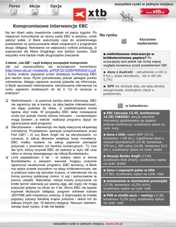 Forex Akcje Opcje wszystkie rynki w jednym miejscu xtb.pl www. Kompromisowe interwencje EBC Na ten dzień wielu inwestorów czekało od pięciu tygodni. Po niejasnym komunikacie ze strony szefa EBC w sierpniu, rynek założył sobie, iż Bank wykorzysta czas do wrześniowego posiedzenia na sprecyzowanie detali związanych z programem skupu obligacji. Notowania na większości rynków pokazują, iż poprzeczka dla Mario Draghiego wisi bardzo wysoko. Dziś wszystko inne będzie miało drugorzędne znaczenie 3-letnie „nie-QE”, czyli kolejny europejski kompromis Jak już zaznaczyliśmy we wczorajszym komentarzu (http://www.xtb.pl/~/media/xtb_pl/PDF/2012/09/PKR050912.pdf ) liczba znaków zapytania przed dzisiejszą konferencją EBC jest bardzo duża. Rynki potrzebowały jednak jakiegoś punktu odniesienia, dlatego zapewne wczoraj pojawiła się informacja, iż Bank wprowadzi nielimitowane, sterylizowane interwencje na rynku papierów skarbowych do lat 3. Co to oznacza w praktyce? Nielimitowane – to pozornie bardzo dobra informacja. EBC nie ograniczy się w kwocie, za jaką będzie interweniować, nie dając podstaw do obaw, iż zadeklarowana kwota będzie zbyt mała. W przypadku EBC takie rozwiązanie może być jednak równie dobrze minusem – konserwatyści mogą bowiem „w trakcie” realizacji programu dążyć do ograniczania skali programu Sterylizowane – interwencje nie będą klasyczną ekspansją monetarną. Przykładowo operacje przeprowadzane przez Fed (QE1 i 2) czy Bank Anglii nie są sterylizowane, co oznacza, iż zakup aktywów zwiększa bazę monetarną. EBC miałby wydane na zakup papierów pieniądze pożyczać z powrotem od banków komercyjnych. To cios dla tych, którzy wzywali EBC do operacji w stylu QE oraz ukłon w stronę obawiającego się inflacji Bundesbanku Limit zapadalności 3 lat – to kolejny ukłon w stronę Bundesbanku a zarazem warunek mogący znacznie ograniczyć skuteczność programu. EBC tłumaczy, iż Bank ma wpływ przede wszystkim na stopy krótkoterminowe, ale w praktyce stara się sprostać krytyce, iż interwencje nie są formą pomocy publicznej (mimo, iż są) i jednocześnie tę pomoc udzielić. Naturalnie, niższe koszty pożyczania na krótki termin stanowią już pewną ulgę, ale rządy nie mogą pożyczać jedynie na okres do 3 lat. Skoro EBC nie będzie kupował dłuższych obligacji, program odniesie sukces JEDYNIE jeśli inwestorzy uwierzą, iż doprowadzi do trwałej poprawy sytuacji fiskalnej krajów południa i skłoni ich do zakupu innych (np. 10 letnich) obligacji. Naszym zdaniem, istnieje duże ryzyko, iż tak nie będzie Na rynku kluczowe wydarzenia: ■ nielimitowane interwencje w krótkoterminowe papiery? Po wczorajszej serii plotek tak mniej więcej wygląda konsensus przed posiedzeniem EBC ■ dane z Australii – zatrudnienie w dół (o 8 tys.), stopa bezrobocia… też w dół (do 5,1%) ■ RPP nie obniżyła stóp, ale taką obniżkę zasugerowała, oczekujemy cięcia w październiku w kalendarzu: ■ EBC (decyzja 13.45, konferencja 14.30) UWAGA!: decyzji odnośnie interwencji spodziewamy się dopiero podczas konferencji; oczekiwany wpływ na rynki: duży ■ dane z USA: raport ADP (14.15, konsensus +140 tys.), tygodniowe dane o nowych bezrobotnych (14.30, konsensus 370 tys.), ISM usług (16.00, konsensus 52,5 pkt.); oczekiwany wpływ na rynki: średni ■ decyzja Banku Anglii (13.00, oczekiwany brak zmian); oczekiwany wpływ na rynki: średni ■ dane o zapasach paliw w USA (17.00); oczekiwany wpływ na rynki: niski ■ zamówienia w niemieckim przemyśle (12.00, konsensus +0,2% m/m); oczekiwany wpływ na rynki: niski ■ PKB w strefie euro – rewizja (11.00, konsensus -0,2% q/q); oczekiwany wpływ na rynki: niski wszystkie rynki w jednym miejscu. www.xtb.pl Forex Akcje Opcje wszystkie rynki w jednym miejscu xtb.pl www. Kryteria interwencji – tu nadal mamy niejasność, a ta kwestia może okazać się absolutnie kluczowa. Jeżeli droga do interwencji będzie zawiła, rynek może szybko się rozczarować. A przypomnijmy, iż na sierpniowym posiedzeniu Draghi dał do zrozumienia, iż aby EBC kupował jakikolwiek dług, dany kraj musi najpierw wnioskować o pomoc do EFSF i podporządkować się programowi reform. To sugerowałoby, iż to rządy będą inicjować program skupu obligacji a nie EBC (!). Jeżeli cena polityczna za interwencję EBC będzie wysoka, rynek może uznać, iż skala zakupów nie będzie odpowiednio duża Naturalnie werdykt EBC nie jest przesądzony. Wczoraj na rynek trafiła także wiadomość, iż kanclerz Niemiec jest przeciwko nielimitowanym interwencjom, a z drugiej strony nadeszła plotka, iż EBC jest gotów zrezygnować ze statusu uprzywilejowanego wierzyciela (tzn. gdyby doszło do restrukturyzacji długu Hiszpanii, Bank również poniósłby straty). Jeżeli chodzi o reakcję na decyzję Banku, należy podkreślić przede wszystkim bardzo wysoki poziom oczekiwań. Praktycznie nie mówi się o tym, iż EBC mógłby rozczarować. A to oznacza, że nawet jeśli padnie liberalna decyzja (zapowiadająca szybkie interwencje, nie obciążone wieloma warunkami) może dojść do realizacji zysków. Naszym zdaniem, w nieco dłuższej perspektywie reakcja rynku może być podobna do wcześniejszych reakcji na przyznawanie pakietów pomocowych – optymizm rósł głównie przed decyzją, czasem tuż po niej, zaś najpóźniej po kilku dniach nastroje znów się pogarszały. Bank Anglii, dane z USA w tle Czwartkowy kalendarz jest całkiem ciekawy. Poza EBC mamy dziś także decyzję Banku Anglii (13.00) oraz kilka publikacji danych makro z USA: raport ADP (14.15), tygodniowy raport o nowych bezrobotnych (14.30) oraz wskaźnik ISM dla sektora usług (16.00). Trudno jednak oczekiwać, aby którekolwiek z tych wydarzeń mogło mieć zauważalny wpływ na notowania, szczególnie, iż nie oczekuje się jakiegokolwiek ruchu ze strony Banku Anglii. Na wykresach: EURUSD, D1 – sytuacja techniczna na 