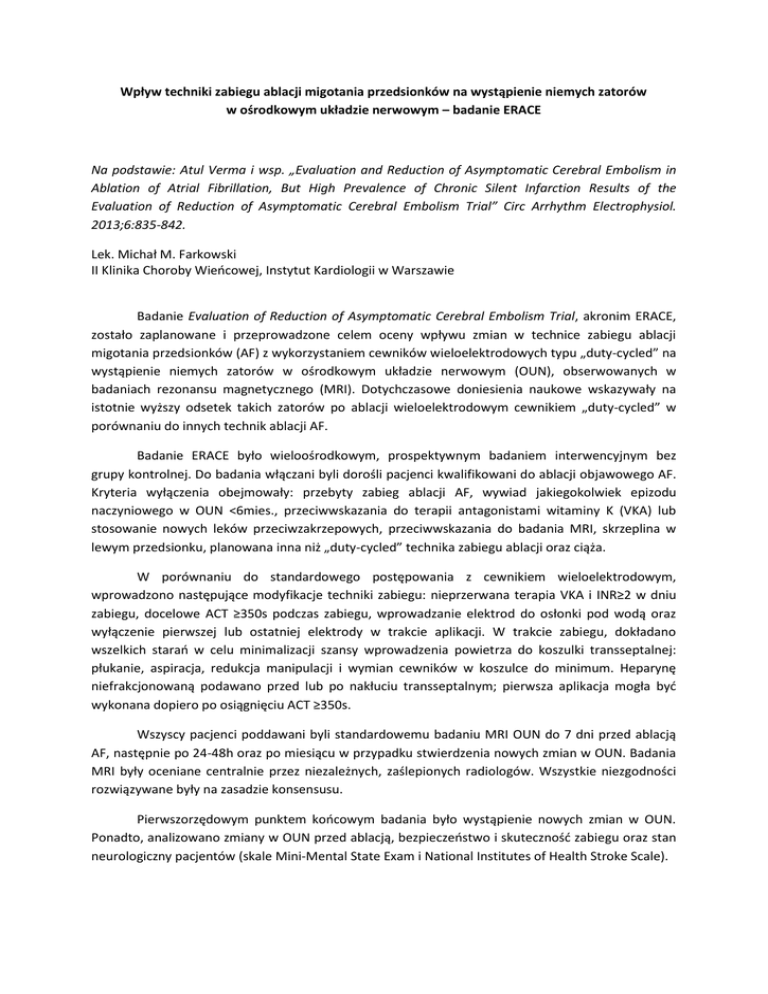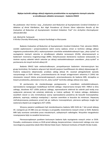 Wpływ techniki zabiegu ablacji migotania przedsionków na wystąpienie niemych zatorów w ośrodkowym układzie nerwowym – badanie ERACE Na podstawie: Atul Verma i wsp. „Evaluation and Reduction of Asymptomatic Cerebral Embolism in Ablation of Atrial Fibrillation, But High Prevalence of Chronic Silent Infarction Results of the Evaluation of Reduction of Asymptomatic Cerebral Embolism Trial” Circ Arrhythm Electrophysiol. 2013;6:835-842. Lek. Michał M. Farkowski II Klinika Choroby Wieńcowej, Instytut Kardiologii w Warszawie Badanie Evaluation of Reduction of Asymptomatic Cerebral Embolism Trial, akronim ERACE, zostało zaplanowane i przeprowadzone celem oceny wpływu zmian w technice zabiegu ablacji migotania przedsionków (AF) z wykorzystaniem cewników wieloelektrodowych typu „duty-cycled” na wystąpienie niemych zatorów w ośrodkowym układzie nerwowym (OUN), obserwowanych w badaniach rezonansu magnetycznego (MRI). Dotychczasowe doniesienia naukowe wskazywały na istotnie wyższy odsetek takich zatorów po ablacji wieloelektrodowym cewnikiem „duty-cycled” w porównaniu do innych technik ablacji AF. Badanie ERACE było wieloośrodkowym, prospektywnym badaniem interwencyjnym bez grupy kontrolnej. Do badania włączani byli dorośli pacjenci kwalifikowani do ablacji objawowego AF. Kryteria wyłączenia obejmowały: przebyty zabieg ablacji AF, wywiad jakiegokolwiek epizodu naczyniowego w OUN <6mies., przeciwwskazania do terapii antagonistami witaminy K (VKA) lub stosowanie nowych leków przeciwzakrzepowych, przeciwwskazania do badania MRI, skrzeplina w lewym przedsionku, planowana inna niż „duty-cycled” technika zabiegu ablacji oraz ciąża. W porównaniu do standardowego postępowania z cewnikiem wieloelektrodowym, wprowadzono następujące modyfikacje techniki zabiegu: nieprzerwana terapia VKA i INR≥2 w dniu zabiegu, docelowe ACT ≥350s podczas zabiegu, wprowadzanie elektrod do osłonki pod wodą oraz wyłączenie pierwszej lub ostatniej elektrody w trakcie aplikacji. W trakcie zabiegu, dokładano wszelkich starań w celu minimalizacji szansy wprowadzenia powietrza do koszulki transseptalnej: płukanie, aspiracja, redukcja manipulacji i wymian cewników w koszulce do minimum. Heparynę niefrakcjonowaną podawano przed lub po nakłuciu transseptalnym; pierwsza aplikacja mogła być wykonana dopiero po osiągnięciu ACT ≥350s. Wszyscy pacjenci poddawani byli standardowemu badaniu MRI OUN do 7 dni przed ablacją AF, następnie po 24-48h oraz po miesiącu w przypadku stwierdzenia nowych zmian w OUN. Badania MRI były oceniane centralnie przez niezależnych, zaślepionych radiologów. Wszystkie niezgodności rozwiązywane były na zasadzie konsensusu. Pierwszorzędowym punktem końcowym badania było wystąpienie nowych zmian w OUN. Ponadto, analizowano zmiany w OUN przed ablacją, bezpieczeństwo i skuteczność zabiegu oraz stan neurologiczny pacjentów (skale Mini-Mental State Exam i National Institutes of Health Stroke Scale). Pomiędzy marcem i październikiem 2012 roku, w siedmiu ośrodkach, do badania włączono 68 pacjentów, z czego 60 ukończyło okres obserwacji; głównym powodem wyłączenia z badania była wartość INR <2 w dniu zabiegu (n=3). Średni wiek pacjentów wyniósł 60.3±9.7 lat, ok. 70% było mężczyznami, u ok. połowy pacjentów stwierdzano nadciśnienie tętnicze. Średni poziom wskaźnika INR wyniósł 2.4±0.5; średni czas ACT w trakcie zabiegu wyniósł 405±116s. a przed pierwszą aplikacją 368±192s. W trakcie zabiegu wykonywano średnio 28.8±16.1 aplikacji a elektrodę 1 lub 10 wyłączono w 99.8±0.7% przypadków. U 55% pacjentów doszło do spontanicznego powrotu rytmu zatokowego w trakcie zabiegu, reszta wymagała średnio 2.3±1.8 kardiowersji. Średni czas zabiegu wyniósł 100±35 minut a średni czas obecności cewnika w lewym przedsionku wyniósł 64±27 min. U wszystkich pacjentów osiągnięto izolację elektryczną wszystkich żył płucnych. U 36 (60%) pacjentów wykryto zmiany w OUN jeszcze przed zabiegiem RF: pacjenci ci byli starsi (62.6 vs. 57 lat), częściej mieli choroby współistniejące, mieli wyższą punktację CHA2DS2-VASc (1.6±1.2 vs. 0.8±1.1) i mieli większy wymiar lewego przedsionka. Ilość zmian zwiększała się istotnie wraz z punktacją CHA2DS2-VASc: 0 (IQR, 0–2.5) dla punktacji 0; 3 (IQR, 0–6) dla punktacji 1; 2 (IQR, 1–17) dla punktacji 2; 23 (IQR, 0–37) dla punktacji 3 i 6.5 (IQR, 5–8) dla punktacji 4. Nie wykazano natomiast różnic pomiędzy grupami w zakresie stanu neurologicznego. Pierwszorzędowy punkt końcowy zaobserwowano jedynie u jednego pacjenta (1.7%; 95% CI, 0.04–8.9): było to jedno nowe ognisko o wymiarach 8x6mm w płacie ciemieniowym, nie widoczne w kontrolnym badaniu MRI. U pozostałych pacjentów nie obserwowano nowych zamian w OUN po ablacji AF. W trakcie miesięcznej obserwacji, u 88% pacjentów utrzymywał się rytm zatokowy, z czego 94% nadal przyjmowało leki antyarytmiczne. Nie zaobserwowano żadnych poważnych działań niepożądanych; u jednego pacjenta zanotowano tętniaka rzekomego w pachwinie. Autorzy wymieniają obserwacyjny charakter badania bez grupy kontrolnej oraz umiarkowaną liczebność grupy jako główne ograniczenia badania. Ponadto, ze względu na złożony charakter badanej interwencji, nie można wnioskować o skuteczności jej poszczególnych składowych. Podsumowując, badanie ERACE jest pierwszym badaniem prospektywnych opisującym efektywność i bezpieczeństwo zmodyfikowanej techniki ablacji AF za pomocą wieloelektrodowego cewnika „duty-cycled”, w efekcie której obserwowano bardzo niskie ryzyko wystąpienia poablacyjnych zmian w OUN. Badanie zostało sfinansowane przez firmę Medtronic.