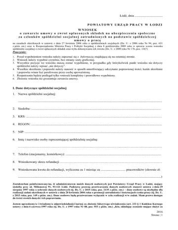 Łódź, dnia .................................. POWIATOWY URZĄD PRACY W ŁODZI WNIOSEK o zawarcie umowy o zwrot opłaconych składek na ubezpieczenia społeczne za członków spółdzielni socjalnej zatrudnionych na podstawie spółdzielczej umowy o pracę na zasadach określonych w ustawie z dnia 27 kwietnia 2006 roku o spółdzielniach socjalnych (Dz. U. z 2006 roku Nr 94, poz. 651 z późn. zm.) oraz w Rozporządzeniu Ministra Pracy i Polityki Socjalnej z dnia 8 października 2009 roku w sprawie wzoru wniosku spółdzielni socjalnej o zwrot opłaconych składek oraz trybu dokonywania ich zwrotu (Dz. U. z 2009 roku Nr 176, poz. 1367) Pouczenie: 1. Przed wypełnieniem wniosku należy zapoznać się z Informacją znajdującą się na ostatniej stronie. 2. Wniosek należy wypełnić czytelnie, bez zmiany szaty graficznej. 3. Wszystkie pozycje we wniosku muszą zostać wypełnione, w przypadku gdy którykolwiek punkt wniosku nie dotyczy spółdzielni należy wpisać „nie dotyczy”. 4. Wszelkie skreślenia i poprawki należy nanosić w sposób umożliwiający odczytanie poprawionej treści; każde skreślenie i poprawka winne być parafowane przez osobę upoważnioną. 5. Rozpatrzeniu będzie podlegał tylko wniosek kompletny i prawidłowo wypełniony. 6. Złożenie wniosku nie gwarantuje zawarcia umowy. I. Dane dotyczące spółdzielni socjalnej 1. Nazwa spółdzielni socjalnej: ............................................................................................................................................................................... 2. Siedziba: .............................................................................................................................................................. 3. KRS: ..………………………………………………………………………………………...………………… 4. REGON: ............................................................................................................................................................... 5. NIP: ...................................................................................................................................................................... 6. Imię i nazwisko osoby reprezentującej spółdzielnię socjalną: …………………………………………………………..……………………...…..……………….…..…….… 7. Telefon (stacjonarny, komórkowy): .................................................................................................................... 8. Wnioskowany okres refundacji ………………………………………………………………………………… 9. Wnioskowana kwota do refundacji, wyliczona za 1 miesiąc za .............................. pracowników (słownie zł: ..............................................................................................................................................................................) Zostałem/łam poinformowany/na, iż administratorem moich danych osobowych jest Powiatowy Urząd Pracy w Łodzi, mający siedzibę przy ul. Milionowej 91, 93-121 Łódź. Podstawę prawną przetwarzania danych osobowych stanowi ustawa z dnia 29 sierpnia 1997 roku o ochronie danych osobowych (tj. Dz. U. z 2015 roku, poz. 2135 z późn. zm.) – dane osobowe są niezbędne dla realizacji zadań określonych w ustawie z dnia 20 kwietnia 2004 roku o promocji zatrudnienia i instytucjach rynku pracy (tj. Dz. U. z 2015 roku, poz. 149 z późn. zm.). Dane osobowe będą przetwarzane wyłącznie w celu realizacji w/w zadań. Mam prawo dostępu do treści swoich danych i ich poprawiania. Jestem uprzedzony/a i świadomy/a odpowiedzialności karnej za złożenie fałszywego oświadczenia (art. 233 § 1 Kodeksu Karnego ustawy z dnia 6 czerwca 1997 roku (tj. Dz. U. z 1997 roku Nr 88, poz. 553 z późn. zm.) „Kto, składając zeznanie mające służyć za 2016 Strona | 1 dowód w postępowaniu sądowym lub w innym postępowaniu prowadzonym na podstawie ustawy, zeznaje nieprawdę lub zataja prawdę, podlega karze pozbawienia wolności do lat 3 .”) Załączniki: 1. Wykaz imienny pracowników, których dotyczy refundacja ze środków Funduszu Pracy (wraz z załączonymi kserokopiami zawartych umów) – Załącznik Nr 1* 2. Oświadczenie dotyczące otrzymanej pomocy de minimis* 3. Formularz informacji przedstawianych przy ubieganiu się o pomoc de minimis (Dz. U. z 2010 roku, Nr 53, poz. 311 z późn. zm.)* * druk dostępny na stronie Urzędu – www.pup-lodz.pl lub w siedzibie Urzędu …………………………………………………. pieczątka spółdzielni socjalnej …………………………………………………………… data i podpis osoby reprezentującej spółdzielnię socjalną Wykaz wszystkich załączników złożonych do wniosku: LP. Nazwa załącznika 1. 2. 3. 4. Informacja: Refundacja ze środków Funduszu Pracy dotyczy części wynagrodzenia odpowiadającej składce należnej od zatrudnionego pracownika na ubezpieczenia emerytalne, rentowe i chorobowe oraz części kosztów osobowych pracodawcy odpowiadających składce na ubezpieczenia emerytalne, rentowe i wypadkowe za zatrudnionego na zasadach stosunku pracy zawartego między spółdzielnią socjalną a jej członkiem nawiązanego na podstawie spółdzielczej umowy o pracę oraz w formach określonych w art. 201 ustawy z dnia 16 września 1982 roku - Prawo spółdzielcze. Zwrot opłaconych składek, dokonywany jest w okresach kwartalnych na podstawie zawartej umowy i udokumentowanego wniosku spółdzielni, złożonego na druku Urzędu, w terminie 30 dni od dnia jego złożenia, za zatrudnione: 1) osoby bezrobotne, w rozumieniu art. 2 ust. 1 pkt 2 ustawy z dnia 20 kwietnia 2004 roku o promocji zatrudnienia i instytucjach rynku pracy (tj. Dz. U. z 2015 roku, poz. 149 z późn. zm.), 2) osoby, o których mowa w art. 1 ust. 2 pkt 1-4, 6 i 7 ustawy z dnia 13 