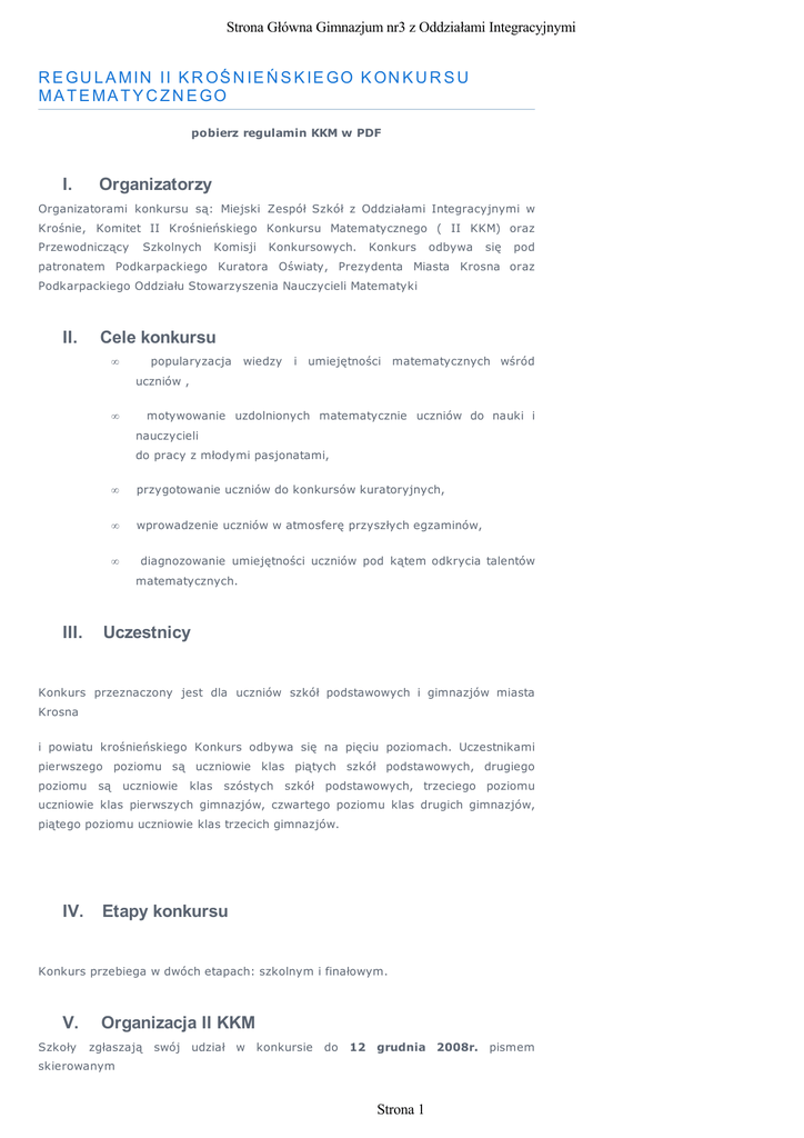 Strona Główna Gimnazjum nr3 z Oddziałami Integracyjnymi R E GU L A M IN I I K R OŚ N IE Ń S K IE GO K ON K U R S U MA T E MA T Y C Z N E GO pobierz regulamin KKM w PDF I. Organizatorzy Organizatorami konkursu są: Miejski Zespół Szkół z Oddziałami Integracyjnymi w Krośnie, Komitet II Krośnieńskiego Konkursu Matematycznego ( II KKM) oraz Przewodniczący Szkolnych Komisji Konkursowych. Konkurs odbywa się pod patronatem Podkarpackiego Kuratora Oświaty, Prezydenta Miasta Krosna oraz Podkarpackiego Oddziału Stowarzyszenia Nauczycieli Matematyki II. Cele konkursu • popularyzacja wiedzy i umiejętności matematycznych wśród uczniów , • motywowanie uzdolnionych matematycznie uczniów do nauki i nauczycieli do pracy z młodymi pasjonatami, • przygotowanie uczniów do konkursów kuratoryjnych, • wprowadzenie uczniów w atmosferę przyszłych egzaminów, • diagnozowanie umiejętności uczniów pod kątem odkrycia talentów matematycznych. III. Uczestnicy Konkurs przeznaczony jest dla uczniów szkół podstawowych i gimnazjów miasta Krosna i powiatu krośnieńskiego Konkurs odbywa się na pięciu poziomach. Uczestnikami pierwszego poziomu są uczniowie klas piątych szkół podstawowych, drugiego poziomu są uczniowie klas szóstych szkół podstawowych, trzeciego poziomu uczniowie klas pierwszych gimnazjów, czwartego poziomu klas drugich gimnazjów, piątego poziomu uczniowie klas trzecich gimnazjów. IV. Etapy konkursu Konkurs przebiega w dwóch etapach: szkolnym i finałowym. V. Szkoły Organizacja II KKM zgłaszają swój udział w konkursie do 12 grudnia 2008r. pismem skierowanym Strona 1 Strona Główna Gimnazjum nr3 z Oddziałami Integracyjnymi do Przewodniczącego Komitetu Organizacyjnego II KKM Agnieszki Oczoś na adres Miejski Zespół Szkół z Oddziałami Integracyjnymi w Krośnie, ul. Wojska Polskiego 45, 38-409 Krosno. Dyrektor szkoły powołuje Przewodniczącego Szkolnej Komisji Konkursowej, którego zgłasza w wyŜej wymienionym piśmie. NaleŜy podać e-mail Przewodniczącego Szkolnej Komisji Konkursowej. Etap szkolny konkursu odbędzie się 22 stycznia 2009r. o godzinie 1200 . Finał odbędzie się 27 marca 2009r. w Miejskim Zespole Szkół z Oddziałami Integracyjnymi w Krośnie. Prace uczniów na etapie finałowym są kodowane. Czas pracy uczniów w czasie etapu szkolnego wynosi 60 minut, zaś w czasie etapu finałowego 90 minut. Pytania obu etapów przygotowuje Komitet II KKM i są one poufne. Zestaw konkursowy etapu szkolnego Przewodniczący Komitetu Organizacyjnego II KKM przesyła pocztą elektroniczną 21 stycznia 2009r do Przewodniczących Szkolnych Komisji Konkursowych. Szkolną Komisję Konkursową ustala osoba powołana na jej przewodniczącego przez dyrektora szkoły. Zespół oceniający etap finałowy powołuje Komitet II KKM. Prace obu etapów powinny być poprawione w tym samym dniu, w którym odbywają się eliminacje. Prace etapu finałowego będą oceniać egzaminatorzy Okręgowej Komisji Egzaminacyjnej w Krakowie. Protokół etapu szkolnego wraz z pracami uczniów zakwalifikowanych do finału dostarcza Przewodniczący Szkolnej Komisji Konkursowej do Przewodniczącego Komitetu II KKM w nieprzekraczalnym terminie 2 dni od daty etapu szkolnego. Dokumentację tę moŜna pozostawić w sekretariacie Miejskiego Zespołu Szkół z Oddziałami Integracyjnymi w Krośnie (ul. Wojska Polskiego 45). Komitet II KKM ustala listę osób zakwalifikowanych do etapu finałowego w terminie do pięciu dni po otrzymaniu wszystkich protokołów od przewodniczących komisji szkolnych. Do etapu finałowego zostaną zakwalifikowani uczniowie, którzy zdobyli w eliminacjach szkolnych: pierwsze miejsce w przypadku jednego oddziału w szkole na danym poziomie, dwa pierwsze miejsca w przypadku gdy szkoła posiada dwa lub trzy oddziały na danym poziomie, trzy pierwsze miejsca przy większej niŜ trzy liczbie oddziałów na danym poziomie. Koszty dojazdu do szkoły, w której odbywa się etap finałowy pokrywają uczniowie lub delegująca ich szkoła. VI. Forma zadań Na etapie szkolnym arkusz zawierać będzie róŜne typy zadań zamkniętych i otwartych. Na etapie finałowym arkusz będzie zawierał zadania otwarte. VII. Zadania Przewodniczącego Szkolnej Komisji II KKM • udzielanie uczniom informacji o organizacji, terminach i zasadach udziału w konkursie, • powołanie Szkolnej Komisji Konkursowej, • zorganizowanie szkolnego etapu konkursu, Strona 2 Strona Główna Gimnazjum nr3 z Oddziałami Integracyjnymi • nadzorowanie poprawy zadań konkursowych, która musi się odbyć w dniu etapu szkolnego, • napisanie protokołu z etapu szkolnego i przekazanie go Przewodniczącemu Komitetu Organizacyjnego II KKM VIII. Zadania Komitetu Organizacyjnego II KKM • • opracowanie regulaminu konkursu, przygotowanie zadań na wszystkie etapy konkursu i kryteriów ich poprawy, • • przygotowanie wzoru protokołów poszczególnych etapów, dostarczenie zestawów zadań i wzoru protokołów do Przewodniczących Szkolnych Komisji Konkursowych, • kwalifikacja uczestników konkursu do etapu finałowego, • zorganizowanie etapu finałowego konkursu, • powołanie zespołu oceniającego zadania etapu finałowego, • nadzorowanie poprawy prac etapu finałowego, • wyłonienie laureatów i wyróŜnionych w konkursie, • pozyskanie ewentualnych sponsorów etapu finałowego, sporządzenie i rozdanie dyplomów, • zorganizowanie uroczystego ogłoszenia wyników dla laureatów i wyróŜnionych, • IX. prowadzenie dokumentacji konkursu. Tematyka II KKM Na kaŜdym poziomie obowiązuje tematyka danego poziomu oraz poziomów niŜszych. Klasa piąta szkoły podstawowej: • liczby naturalne i ich własności, dzielniki i wielokrotności liczb, liczby pierwsze i złoŜone, Strona 3 Strona Główna Gimnazjum nr3 z Oddziałami Integracyjnymi • • działania na liczbach naturalnych, ułamki zwykłe; ułamek jako część całości, ułamek jako iloraz, skracanie i rozsz