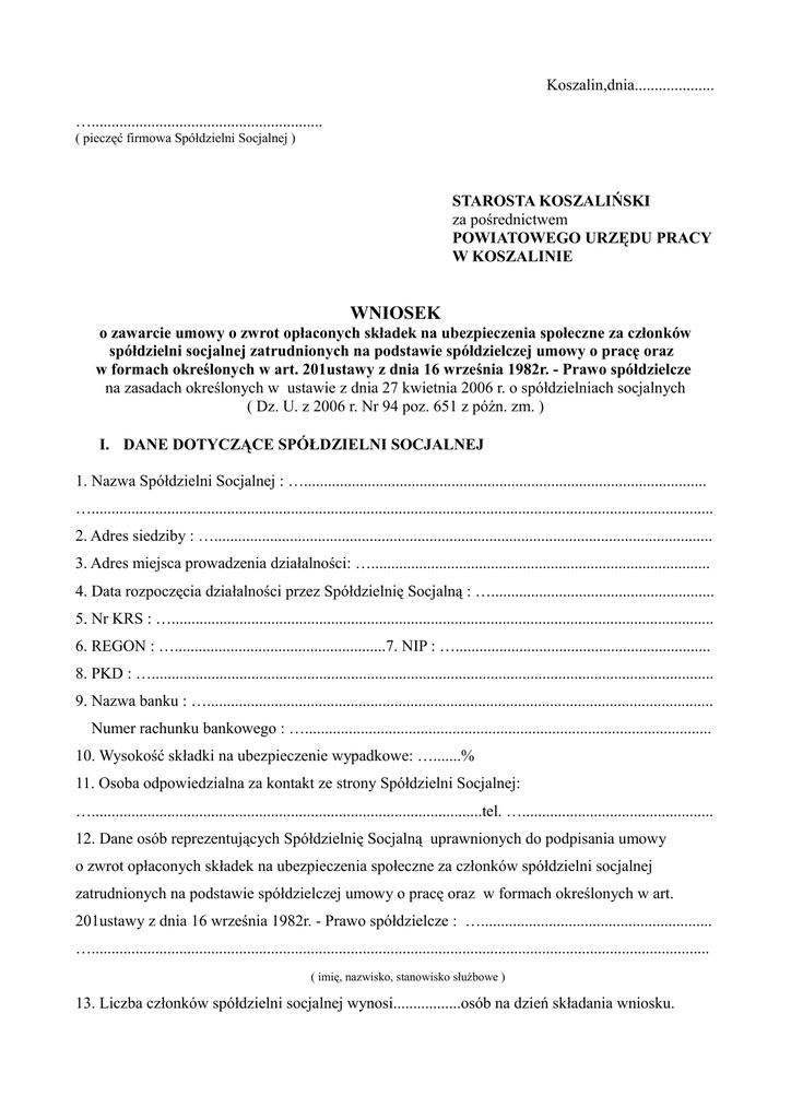 Koszalin,dnia.................... ….......................................................... ( pieczęć firmowa Spółdzielni Socjalnej ) STAROSTA KOSZALIŃSKI za pośrednictwem POWIATOWEGO URZĘDU PRACY W KOSZALINIE WNIOSEK o zawarcie umowy o zwrot opłaconych składek na ubezpieczenia społeczne za członków spółdzielni socjalnej zatrudnionych na podstawie spółdzielczej umowy o pracę oraz w formach określonych w art. 201ustawy z dnia 16 września 1982r. - Prawo spółdzielcze na zasadach określonych w ustawie z dnia 27 kwietnia 2006 r. o spółdzielniach socjalnych ( Dz. U. z 2006 r. Nr 94 poz. 651 z późn. zm. ) I. DANE DOTYCZĄCE SPÓŁDZIELNI SOCJALNEJ 1. Nazwa Spółdzielni Socjalnej : …..................................................................................................... …............................................................................................................................................................ 2. Adres siedziby : …............................................................................................................................. 3. Adres miejsca prowadzenia działalności: …..................................................................................... 4. Data rozpoczęcia działalności przez Spółdzielnię Socjalną : …........................................................ 5. Nr KRS : …........................................................................................................................................ 6. REGON : ….....................................................7. NIP : …................................................................ 8. PKD : …............................................................................................................................................. 9. Nazwa banku : …............................................................................................................................... Numer rachunku bankowego : …...................................................................................................... 10. Wysokość składki na ubezpieczenie wypadkowe: ….......% 11. Osoba odpowiedzialna za kontakt ze strony Spółdzielni Socjalnej: …..................................................................................................tel. …................................................ 12. Dane osób reprezentujących Spółdzielnię Socjalną uprawnionych do podpisania umowy o zwrot opłaconych składek na ubezpieczenia społeczne za członków spółdzielni socjalnej zatrudnionych na podstawie spółdzielczej umowy o pracę oraz w formach określonych w art. 201ustawy z dnia 16 września 1982r. - Prawo spółdzielcze : ….......................................................... …........................................................................................................................................................... ( imię, nazwisko, stanowisko służbowe ) 13. Liczba członków spółdzielni socjalnej wynosi.................osób na dzień składania wniosku. II. DANE DOTYCZĄCE CZŁONKÓW SPÓŁDZIELNI SOCJALNEJ, KTÓRYCH SKŁADKI BĘDĄ PODLEGAĆ ZWROTOWI lp. NAZWISKO I IMIĘ PESEL NIP OKRES, NA KTÓRY ZOSTAŁ ZAWARTY STOSUNEK PRACY MIĘDZY SPÓŁDZIELNIĄ SOCJALNĄ A JEJ CZŁONKIEM PRZYNALEŻNOŚĆ OSOBY PRZED PRZYSTĄPIENIEM DO SPÓŁDZIELNI SOCJALNEJ (wpisać A,B lub C) * 1 2 3 4 5 6 * Przynależność osoby przed przystąpieniem do spółdzielni socjalnej (wybrać właściwe): A osoby bezrobotne w rozumieniu art. 2 ust. 1 pkt 2 ustawy z dnia 20 kwietnia 2004 r. o promocji zatrudnienia i instytucjach rynku pracy ( t.j. Dz. U. z 2015 r. poz. 149z późn. zm.) B osoby, o których mowa w art. 1 ust. 2 pkt 1 – 4, 6, 7 ustawy z dnia 13 czerwca 2003 r. o zatrudnieniu socjalnym ( Dz. U. z 2011r. Nr 43 poz. 225 z późn. zm.) C osoby niepełnosprawne w rozumieniu ustawy z dnia 27 sierpnia 1997 r. o rehabilitacji zawodowej i społecznej oraz zatrudnianiu osób niepełnosprawnych ( Dz. U. Z 2011r. Nr 127 poz. 721 z późn. zm.) III. OŚWIADCZENIE Świadomy (a) odpowiedzialności karnej za składanie fałszywych zeznań wynikającej z art. 233 § 1 Kodeksu Karnego (Dz. U. nr 88 / 97), zgodnie z którym „kto składając zeznanie mające służyć w postępowaniu sądowym lub innym postępowaniu prowadzonym na podstawie ustawy, zeznaje nieprawdę lub zataja prawdę, podlega karze pozbawienia wolności do lat 3 (…)” Ja niżej podpisany (a) oświadczam, że: 1. Dane zawarte we wniosku są zgodne ze stanem faktycznym, 2. Spółdzielnia Socjalna, którą reprezentuję : 3. w dniu złożenia wniosku nie zalega z wypłacaniem wynagrodzeń pracownikom oraz opłacaniem składek na ubezpieczenia społeczne, zdrowotne, Fundusz Pracy oraz Fundusz Gwarantowanych Świadczeń Pracowniczych oraz innych danin publicznych, 4. jest beneficjentem pomocy w rozumieniu ustawy z dnia 30 kwietnia 2014r. o postępowaniu w sprawach dotyczących pomocy publicznej ( Dz.U. z 2007r. Nr 59, poz. 404, z późn.zm.) TAK / NIE * w przypadku zaznaczenia negatywnej odpowiedzi wnioskodawcy nie dotyczy punkt 5 niniejszego oświadczenia, 5. spełnia wszystkie przesłanki do udzielenia pomocy de minimis określone w rozporządzeniu Komisji (UE) nr 1407/2013 z dnia 18 grudnia 2013r. w sprawie stosowania art. 107 i 108 Traktatu o funkcjonowaniu Unii Europejskiej do pomocy de minimis ( Dz. Urz. UE L352 z 24.12.2013, str.1), rozporządzeniu Komisji (UE) nr 1408/2013 z dnia 18 grudnia 2013r. w sprawie stosowania art. 107 i 108 Traktatu o funkcjonowaniu Unii Europejskiej do pomocy de minimis w sektorze rolnym (Dz.Urz. UE L 352 z 24.12.2013, str. 9) lub we właściwych przepisach prawa Unii Europejskiej dotyczących pomocy de minimis w sektorze rybołówstwa i akwakultury a w szczególności: - nie jest / jest* powiązana z innymi jednostkami gospodarczymi, co najmniej jednym z następujących stosunków ( należy zaznaczy