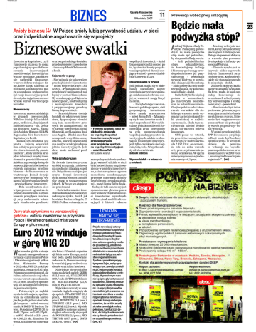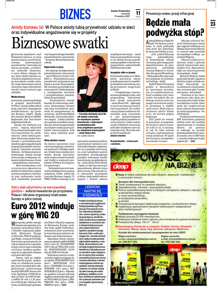 c MONTAŻ 280 MONTAŻ 280 x BIZNES Gazeta Krakowska czwartek 19 kwietnia 2007 11 Anioły biznesu (4) W Polsce anioły lubią prywatność udziału w sieci oraz indywidualne angażowanie się w projekty Biznesowe swatki nwestorzy kapitałowi, czyli aniołowie biznesu, to coraz popularniejszy sposób finansowania innowacyjnych przedsięwzięć. Inwestują oni własne pieniądze, a konkretnie nadwyżki finansowe, w nowe dobrze rokujące firmy, które dzięki takiemu zastrzykowi kapitałowemu mogą stosunkowo szybko wdrożyć swoje innowacyjne przedsięwzięcia, dając inwestorowi wysoki wzrost wartości jego udziałów. I Moderatorzy Inwestorzy zazwyczaj działają w grupach inwestorskich. W Polsce istnieje kilka takich grup, czyli sieci, skupiających aniołów biznesu – np. Lewiatan Business Angels, Śląska Sieć Aniołów Biznesu SilBAN, Regionalna Sieć Inwestorów Kapitałowych Resik. Zasada ich działania jest prosta – kojarzą właścicieli firm o dużym potencjale wzrostu z inwestorami. Są „moderatorem”, który ułatwia przepływ informacji między inwestorami a przedsiębiorcami. Aniołom zapewniają dostęp do propozycji projektów inwestycyjnych, natomiast przedsiębiorcom – do finansowania zewnętrznego. Jednak decyzje inwestycyjne podejmują wyłącznie zainteresowane strony – przedsiębiorcy i inwestorzy. – Rola koordynatora sieci w tym procesie ogranicza się jedynie do ułatwiania i organizowania przepływu informacji przy zachowaniu ustalonych standardów poufności oraz bezpośredniego kontaktu przedsiębiorców i inwestorów – tłumaczy Marek Zaborowski z Resik. – Sieć zajmuje się kojarzeniem przedsiębiorców i inwestorów – mówi Wojciech Grzyb z SilBAN–u. – Przedsiębiorca musi przedstawić swój pomysł, najlepiej w postaci biznesplanu. My oceniamy go pod kątem innowacyjności, konfrontujemy z wymaganiami inwestora i przygotowujemy przedsiębiorcę do prezentacji. – Przedsiębiorca dostaje kontakt do właściwego inwestora, dysponujemy również całą bazą menedżerów gotowych do zaangażowania się w start up – potwierdza Michał Olszewski, szef Lewiatan Business Angels. – Z kolei anioł biznesu przede wszystkim oszczędza czas, bowiem zapewniamy mu dopływ atrakcyjnych projektów inwestycyjnych. Jeśli chce, może zachować poufność. Wolą działać razem Na świecie inwestorzy coraz częściej rezygnują z zachowania poufności i działają wspólnie. Dzięki temu mniejsze jest ryzyko decyzji inwestycyjnych, można również kumulować środki w większych projektach. W Polsce ten etap jeszcze przed nami. – Doświadczenia sieci inwestorów działających na naszym rodzimym rynku, takich jak Lewiatan Business Angels, CI FIRE i PolBan wskazują, że na Ostry atak optymizmu na warszawskiej giełdzie – euforia inwestorów po przyznaniu Polsce i Ukrainie organizacji mistrzostw Europy w piłce nożnej Euro 2012 winduje w górę WIG 20 arszawska giełda entuzjastycznie zareagowała na informację o przyznaniu Polsce i Ukrainie organizacji piłkarskich Mistrzostw Europy w 2012 roku, WIG 20 zyskał ponad 30pkt., rosnąc do3.675 pkt. Potem nieco przystopował, ale i tak na zakończenie sesji odnotowano wzrost tego wskaźnika o 0,13 proc. Analitycy spodziewają się, że optymizm utrzyma się jeszcze dziś i jutro. – Potem, czyli po najbliższych dwóch sesjach, spodziewam się ochłodzenia nastrojów, bo jest to jednak dość odległy horyzont – mówił wczoraj analityk BM BPH Dariusz Nawrot. O godzinie 12 WIG 20 zyskał 1,27 proc. do 3.665,97 pkt., a mWIG 40 rósł o 2,34 proc. do 4.940,28 pkt. Zdaniem Nawrota, na fali decyzji o przyzna- W W niu Polsce i Ukrainie organizacji Mistrzostw Europy, zyskiwać będą spółki budowlane, zwłaszcza te, które uczestniczyły wcześniej przy budowie stadionów oraz sektor hotelowy. Największe obroty odnotowano na akcjach spółek: KGHM (332,2 mln zł), STALEXPORT (169,7 mln zł), TPSA (163,5 mln zł), MOSTOSTALEXP (23,97 mln zł), PKN (115 mln zł). Największe wzrosty w notowaniach ciągłych osiągnęły akcje spółek: STALEXPORT (23,9 proc.), MOSTALZAB (15,9 proc.), BUDIMEX (15,4 proc.), ZURAWIE (13,3 proc.), MOSTALWAR (12,8 proc.). Największe spadki w systemie notowań ciągłych odnotowały akcje spółek: PCGUARD (12,6 proc.), PROTEKTOR (10,7 proc.), SWISSMED (8,7 proc.). (PAP) Incognito albo w grupie – Formuła działania sieci Resik będzie zmierzała do wspólnych spotkań inwestorów z wybranymi przedsiębiorcami oraz projektów opartych na wspólnych inwestycjach – mówi Roma Toft Jeśli jednak znajdą się w Małopolsce inwestorzy, którzy przedłożą korzyści ze wspólnego działania nad ochronę swojej prywatności, mogą liczyć na Resik. – Uwzględniając uwarunkowania polskiego rynku, dziś proponujemy inwestorom dwie zasady uczestnictwa – mówi Roma Toft. – Zgłaszający się do nas inwestor może liczyć na poufność. Nie wykluczamy jednak możliwości formowania grup inwestorów w celu przeprowadzania wspólnej analizy projektów inwestycyjnych, a także realizowania wspólnych inwestycji, jeśli tylko członkowie sieci wyrażą taką wolę. Wszystko zależy od ich oczekiwań. FOT. LUDWIK KOSTUŚ BARBARA SOBAŃSKA razie polscy aniołowie preferują prywatność udziału w sieci oraz indywidualne angażowanie się w projekty inwestycyjne, a sieci zarządzane są przez menedżera koordynującego przepływ informacji między inwestorami a projektodawcami – mówi Roma Toft z Resik. – Sądzę, że taki stan rzeczy jest spowodowany głównie przez dość wczesny etap rozwoju sieci inwestorów prywatnych w Polsce, brak modeli referencyjnych i historii sukcesu W poniedziałek – o interesach z aniołami. LEWIATAN MARTWI SIĘ O RZEMIOSŁO Projekt nowelizacji ustawy o rzemiośle budzi wątpliwości Polskiej Konfederacji Pracodawców Prywatnych Lewiatan. Zdaniem przedsiębiorców, ustawa ograniczy swobodę gospodarczą, utrudni bowiem możliwość prowadzen