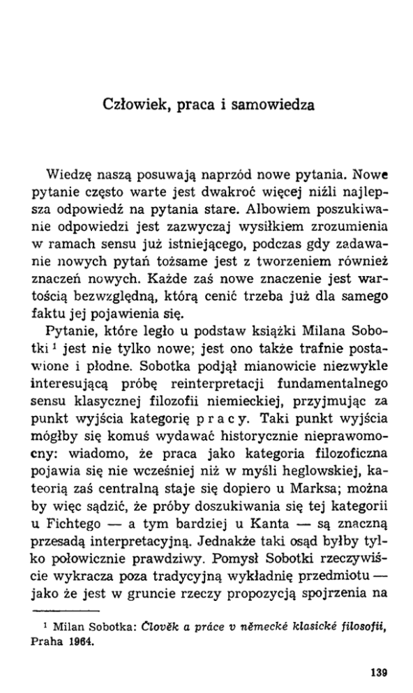 Człowiek, praca i samowiedza Wiedzę naszą posuwają naprzód nowe pytania. Nowe pytanie często w arte jest dwakroć więcej niźli najlep sza odpowiedź na pytania stare. Albowiem poszukiwa nie odpowiedzi jest zazwyczaj wysiłkiem zrozumienia w ram ach sensu już istniejącego, podczas gdy zadawa nie nowych pytań tożsame jest z tw orzeniem również znaczeń nowych. Każde zaś nowe znaczenie jest w ar tością bezwzględną, którą cenić trzeba już dla samego faktu jej pojawienia się. Pytanie, które legło u podstaw książki Milana Sobot k i 1 jest nie tylko nowe; jest ono także trafn ie posta wione i płodne. Sobotka podjął mianowicie niezwykle interesującą próbę reinterpretacji fundam entalnego sensu klasycznej filozofii niemieckiej, przyjm ując za punkt wyjścia kategorię p r a c y . Taki punkt wyjścia mógłby się komuś wydawać historycznie nieprawomo cny: wiadomo, że praca jako kategoria filozoficzna pojawia się nie wcześniej niż w myśli heglowskiej, kateorią zaś centralną staje się dopiero u M arksa; można by więc sądzić, że próby doszukiwania się tej kategorii u Fichtego — a tym bardziej u K anta — są znaczną przesadą interpretacyjną. Jednakże taki osąd byłby ty l ko połowicznie prawdziwy. Pomysł Sobotki rzeczywiś cie w ykracza poza tradycyjną wykładnię przedm iotu — jako że jest w gruncie rzeczy propozycją spojrzenia na 1 Milan Sobotka: Clov&k a prace v nSmecke klasicke filosofii, Praha 1964. 139 niemieckich klasyków z perspektyw y M arksa i m ark sizmu. Ale ta perspektyw a upraw niona jest przez histo rycznie rzeczywistą zależność: jeżeli praw dą jest, że fi lozofia niemiecka stanowi jedno z „trzech źródeł” m ark sizmu, to fakt ten jest znaczący nie tylko dla m arksiz mu, ale także dla niemieckiej filozofii. Lepiej i głębiej rozumiemy samo „źródło”, gdy konfrontujem y je z rze czywistymi rezultatam i jego historyczno-kulturow ych oddziaływań. Zasadniczy schemat in terpretacyjny autora można streścić następująco: klasyczna filozofia niemiecka okre śla się przez zasadniczą opozycję w stosunku do „noetycznej” filozofii XVII—XVIII stulecia. Przez tę ostatnią rozumie autor zespół najogólniejszych założeń, wspól nych m yśleniu europejskiem u od K artezjusza do H u m e ^ (u którego „noetyzm ” dochodzi do apogeum, ale zarazem odnajduje przesłanki własnej autodestrukcji). W myśl tych założeń człowiek, pojęty jako poznawcza świadomość, stoi naprzeciw świata przedmiotowego, któ ry dany jest mu jako byt — tj. jako rzeczywistość go towa, niezależna odeń i w stosunku doń obca. „Noetyzm” jest więc filozofią kontem placyjnej postawy człowieka wobec świata, filozofią poznawania; jednakże funda m entalny w arunek możliwości samego poznania nie jest tu w yjaśniony. W arunkiem tym jest tajem nicza zgod ność świadomości i bytu przedmiotowego — owych dwu sfer heterogenicznych przecież i wzajemnie obcych, a jednak współmiernych. „Noetyzm” nie w yjaśnia tej zgodności, lecz zakłada ją jako oczywistą, ugruntow aną bezpośrednio w ontologicznej stru k tu rze rzeczywistości. K rok naprzód, dokonany przez filozofię niemiecką, polega na w yjaśnieniu tej zgodności, na wypracowaniu koncepcji zasadniczej jednorodności świata i poznające go człowieka. P rzy tym jednorodność ta ugruntow ana jest tu nie „w bycie”, lecz w samym człowieku, w jego specyficznej relacji do owego bytu. Taki jest sens „ko140 pernikańskiego przew rotu” K anta, który stanowi po czątek owego ciągu refleksji, wiodącego od Fichtego, poprzez Schellinga, aż do Hegla. Za punkt wyjścia wszędzie jest tu przyjm owana „świadomość” (lub „sa mowiedza”) — ale nie jest to już „noetyczna” świado mość poznawcza. Niemiecki idealizm rozwija kategorię świadomości „transcendentalnej”, która jest najogólniej szą właściwością człowieka, umożliwiającą dopiero za równo świadomość poznawczą, jak i jej przedmiot. Zgodność poznawczej refleksji i jej przedm iotu ugrun tow ana jest więc w pierwotnym , „transcendentalnym ” sposobie istnienia człowieka jako istoty zarazem byto twórczej i wiedzotwórczej. I tutaj właśnie pomysł Sobotki okazuje się płodny. Już na pierwszy rzut oka widać, że ów pierw otny spo sób istnienia człowieka w tym ujęciu posiada wszystkie zasadnicze znamiona ludzkiej pracy, pojętej wprawdzie w swej zmistyfikowanej, idealistycznej form ie — jako praca świadomości czy ducha — ale zachowującej prze cież swe najistotniejsze właściwości. Tak więc przede wszystkim istotą transcendentalnego podmiotu w nie mieckiej filozofii jest zawsze aktywność; jest to zawsze podmiot spontaniczny i czynny, k tóry nieustannie two rzy swój św iat i przekształca go. W tej perspektyw ie byt przedmiotowy traci swą tajemniczość: jest tożsamy z podmiotem, gdyż jest od początku do końca jego wła snym wytworem. Po wtóre, ta fundam entalna aktywność człowieka jest zawsze aktywnością konstruktyw ną; jest przezwycięże niem oporu i walką z chaosem, w ytw arzaniem ładu i ra cjonalnego porządku. Człowiek uprzedmiotawia się i przysw aja sobie rezultaty tej swojej obiektywizacji, wzbogacając siebie i czyniąc bardziej przejrzystym swój świat. Tę doniosłą funkcję pracy odnajduje autor u K anta (w koncepcji transcendentalnej samowiedzy, wprowadzającej do doświadczenia ład i konieczność), 141 u Fichtego (w ujęciu Jaźni jako fundam entu wolności i prawa), u Hegla (w interpretacji rozwoju ducha jako procesu racjonalizacji stosunków społecznych). Po trzecie wreszcie, jest to aktywność, której początki tkw ią w stanie prerefleksyjnym . Świadomość transcen dentalna, o ile jest spontaniczna i twórcza, jest nieśw ia doma właśnie; dopiero w samowiedzy dochodzi ona do poznania siebie. Spontaniczność ta jest spontanicznością instynktu: zakorzeniona jest w najbardz