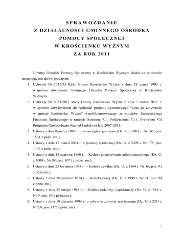 SPRAWOZDANIE Z D ZI AŁ AL NO Ś CI G M I N NE G O O Ś R O D K A P O M O C Y S P O Ł E C Z NE J W K R O Ś CI E NK U W Y ŻN YM ZA ROK 2011 Gminny Ośrodek Pomocy Społecznej w Krościenku Wyżnym działa na podstawie następujących aktów prawnych: 1. Uchwały Nr II/15/95 Rady Gminy Krościenko Wyżne z dnia 28 marca 1995 r. w sprawie utworzenia Gminnego Ośrodka Pomocy Społecznej w Krościenku Wyżnym, 2. Uchwały Nr V/33/2011 Rady Gminy Krościenko Wyżne z dnia 7 marca 2011 r. w sprawie zatwierdzenia do realizacji projektu systemowego "Czas na aktywność w gminie Krościenko Wyżne" współfinansowanego ze środków Europejskiego Funduszu Społecznego w ramach Działania 7.1. Poddziałania 7.1.1. Priorytetu VII Programu Operacyjnego Kapitał Ludzki na lata 2007-2013, 3. Ustawy z dnia 8 marca 1990 r. o samorządzie gminnym (Dz. U. z 2001 r. Nr 142, poz. 1591 z późn. zm.), 4. Ustawy z dnia 12 marca 2004 r. o pomocy społecznej (Dz. U. z 2009 r. Nr 175, poz. 1362 z późn. zm.), 5. Ustawy z dnia 14 czerwca 1960 r. – Kodeks postępowania administracyjnego (Dz. U. z 2000 r. Nr 98, poz. 1071 z późn. zm.), 6. Ustawy z dnia 23 kwietnia 1964 r. – Kodeks cywilny (Dz. U. z 1964 r. Nr 16, poz. 93 z późn.zm.), 7. Ustawy z dnia 26 czerwca 1974 r. – Kodeks pracy (Dz. U. z 1998 r. Nr 21, poz. 94 z późn. zm.), 8. Ustawy z dnia 25 lutego 1964 r. – Kodeks rodzinny i opiekuńczy (Dz. U. z 1964 r. Nr 9, poz. 59 z późn.zm.), 9. Ustawy z dnia 19 sierpnia 1994 r. o ochronie zdrowia psychicznego (Dz.. U. z 2011 r. Nr 231, poz. 1375 z późn. zm.), 1 10. Ustawy z dnia 20 kwietnia 2004 r. o promocji zatrudnienia i instytucjach rynku pracy (Dz. U. z 2008 r. Nr 69, poz. 415 z późn. zm.), 11. Ustawy z dnia 27 sierpnia 1997 r. o rehabilitacji zawodowej i społecznej oraz zatrudnieniu osób niepełnosprawnych (Dz. U. z 2008 r. Nr 14, poz. 92 z późn. zm.), 12. Ustawy z dnia 27 sierpnia 2004 r. o świadczeniach opieki zdrowotnej finansowanych ze środków publicznych (Dz. U. z 2008 r. Nr 164, poz. 1027 z późn. zm.), 13. Ustawy z dnia 13 października 1998 r. o systemie ubezpieczeń społecznych (Dz. U. z 2009 r. Nr 205, poz. 1585 z późn. zm.), 14. Ustawy z dnia 27 sierpnia 2009 r. o finansach publicznych (Dz. U. z 2009 r. Nr 157, poz. 1240 z późn. zm.), 15. Ustawy z dnia 24 kwietnia 2003 r. o działalności pożytku publicznego i o wolontariacie (Dz. U. z 2010 r. Nr 234 poz. 1536), 16. Ustawy z dnia 26 października 1982 r. o wychowaniu w trzeźwości i przeciwdziałaniu alkoholizmowi (Dz. U. z 2007 r. Nr 70, poz. 473 z późn. zm.), 17. Ustawy z dnia 29 lipca 2005 r. o przeciwdziałaniu przemocy w rodzinie (Dz. U. z 2010 r. Nr 125 poz. 842 ), 18. Ustawy z dnia 28 listopada 2003 r. o świadczeniach rodzinnych (Dz. U. z 2006 r. Nr 139, poz. 992 z późn.zm.), 19. Ustawa z dnia 7 września 2007 r. o pomocy osobom uprawnionym do alimentów (Dz. U. z 2009 r. Nr 1, poz. 7 z póź. zm.), 20. Ustawy z dnia 9 czerwca 2011 r. o wspieraniu rodziny i systemie pieczy zastępczej (Dz. U. z 2011 r. Nr 149, poz. 887), 21. Rozporządzenia Ministra Polityki Społecznej z dnia 2 czerwca 2005 r. w sprawie sposobu i trybu postępowania w sprawach o świadczenia rodzinne (Dz. U. z 2005 r. Nr 105, poz. 881 z późn. zm.), 22. Rozporządzenia Rady Ministrów z dnia 11 sierpnia 2009 r. w sprawie wysokości dochodu rodziny albo dochodu osoby uczącej się stanowiących podstawę ubiegania się o zasiłek rodzinny oraz wysokości świadczeń rodzinnych (Dz. U. z 2009 r. Nr 129, poz. 1058), 23. Rozporządzenia Ministra Pracy i Polityki Społecznej z dnia 7 lipca 2010 r. w sprawie sposobu i trybu postępowania, sposobu ustalania dochodu oraz wzorów wniosku, zaświadczeń i oświadczeń o ustalenie prawa do świadczeń z funduszu alimentacyjnego (Dz. U. z 2010 r. Nr 123, poz. 836), 2 24. Rozporządzenia Rady Ministrów z dnia 4 października 2011 r. w sprawie szczegółowych warunków realizacji rządowego programu wspierania osób pobierających świadczenie pielęgnacyjne.(Dz. U. z 2011 r. Nr 212, poz. 1262). 25. Uchwały Nr XI/70/2007 Rady Gminy Krościenko Wyżne z dnia 4 grudnia 2007 roku w sprawie zasad udzielania jednorazowej zapomogi z tytułu urodzenia się dziecka osobom zameldowanym na pobyt stały na terenie Gminy Krościenko Wyżne, 26. Zarządzenia Nr I/219/2004 Wójta Gminy Krościenko Wyżne z dnia 30 kwietnia 2004r. w sprawie udzielenia Kierownikowi Gminnego Ośrodka Pomocy Społecznej w Krościenku Wyżnym upoważnienia do wydawania decyzji administracyjnych w indywidualnych sprawach z zakresu pomocy społecznej należących do właściwości gminy, 27. Zarządzenia Nr I/220/2004 Wójta Gminy Krościenko Wyżne z dnia 30 kwietnia 2004 r. w sprawie udzielenia Kierownikowi Gminnego Ośrodka Pomocy Społecznej w Krościenku Wyżnym upoważnienia do prowadzenia postępowania i wydawania decyzji administracyjnych w sprawie świadczeń rodzinnych, 28. Zarządzenia Nr II/399/10 Wójta Gminy Krościenko Wyżne z dnia 11 stycznia 2010 r. w sprawie udzielenia upoważnienia Kierownikowi Gminnego Ośrodka Pomocy Społecznej w Krościenku Wyżnym do podpisywania upomnień, wystawiania tytułów wykonawczych w zakresie świadczeń rodzinnych, świadczeń z funduszu alimentacyjnego oraz świadczeń z pomocy społecznej, 29. Zarządzenia Nr III/66/2011 Wójta Gminy Krościenko Wyżne z dnia 12 sierpnia 2011 r. w sprawie upoważnienia do podejmowania działań w sprawach funduszu alimentacyjnego. 30. Zarządzeń Kierownika GOPS. W 2011 r. podjęto 30 Zarządzeń. Sprawozdanie składa się z trzech części tj.: I. POMOC SPOŁECZNA, II. REALIZACJA PROJEKTU SYSTEMOWEGO „CZAS NA AKTYWNOŚĆ W GMINIE KROŚCIENKO WYŻNE”, III. ŚWIADCZENIA RODZINNE I FUNDUSZ ALIMENTACYJNY. 3 I. POMOC SPOŁECZNA Pomoc społeczna jest instytucją polityki społecznej państwa, mającą na celu umożliwienie osobom i rodzinom przezwyciężenie trudnych sytuacji życiowych, których nie są one w stanie pokonać wykorzystując włas