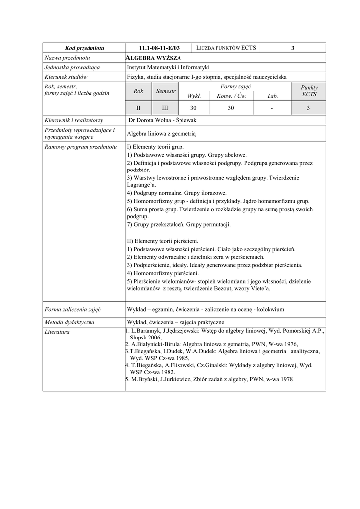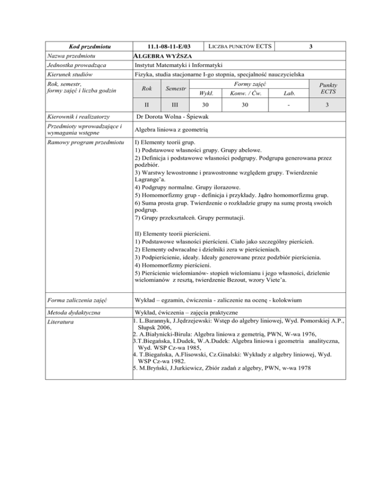Kod przedmiotu LICZBA PUNKTÓW ECTS 11.1-08-11-E/03 3 Nazwa przedmiotu ALGEBRA WYśSZA Jednostka prowadząca Instytut Matematyki i Informatyki Kierunek studiów Fizyka, studia stacjonarne I-go stopnia, specjalność nauczycielska Rok, semestr, formy zajęć i liczba godzin Rok Semestr II III Formy zajęć Wykł. Konw. / Ćw. Lab. Punkty ECTS 30 30 - 3 Kierownik i realizatorzy Dr Dorota Wolna - Śpiewak Przedmioty wprowadzające i wymagania wstępne Algebra liniowa z geometrią Ramowy program przedmiotu I) Elementy teorii grup. 1) Podstawowe własności grupy. Grupy abelowe. 2) Definicja i podstawowe własności podgrupy. Podgrupa generowana przez podzbiór. 3) Warstwy lewostronne i prawostronne względem grupy. Twierdzenie Lagrange’a. 4) Podgrupy normalne. Grupy ilorazowe. 5) Homomorfizmy grup - definicja i przykłady. Jądro homomorfizmu grup. 6) Suma prosta grup. Twierdzenie o rozkładzie grupy na sumę prostą swoich podgrup. 7) Grupy przekształceń. Grupy permutacji. II) Elementy teorii pierścieni. 1) Podstawowe własności pierścieni. Ciało jako szczególny pierścień. 2) Elementy odwracalne i dzielniki zera w pierścieniach. 3) Podpierścienie, ideały. Ideały generowane przez podzbiór pierścienia. 4) Homomorfizmy pierścieni. 5) Pierścienie wielomianów- stopień wielomianu i jego własności, dzielenie wielomianów z resztą, twierdzenie Bezout, wzory Viete’a. Forma zaliczenia zajęć Wykład – egzamin, ćwiczenia - zaliczenie na ocenę - kolokwium Metoda dydaktyczna Wykład, ćwiczenia – zajęcia praktyczne 1. L.Barannyk, J.Jędrzejewski: Wstęp do algebry liniowej, Wyd. Pomorskiej A.P., Słupsk 2006, 2. A.Białynicki-Birula: Algebra liniowa z gemetrią, PWN, W-wa 1976, 3.T.Biegańska, I.Dudek, W.A.Dudek: Algebra liniowa i geometria analityczna, Wyd. WSP Cz-wa 1985, 4. T.Biegańska, A.Flisowski, Cz.Ginalski: Wykłady z algebry liniowej, Wyd. WSP Cz-wa 1982. 5. M.Bryński, J.Jurkiewicz, Zbiór zadań z algebry, PWN, w-wa 1978 Literatura
