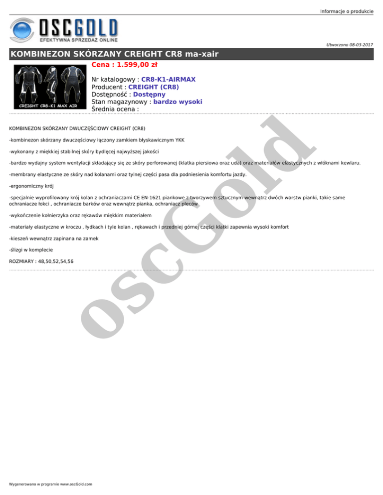 Informacje o produkcie Utworzono 08-03-2017 KOMBINEZON SKÓRZANY CREIGHT CR8 ma-xair Cena : 1.599,00 zł Nr katalogowy : CR8-K1-AIRMAX Producent : CREIGHT (CR8) Dostępność : Dostępny Stan magazynowy : bardzo wysoki Średnia ocena : KOMBINEZON SKÓRZANY DWUCZĘŚCIOWY CREIGHT (CR8) d -kombinezon skórzany dwuczęściowy łączony zamkiem błyskawicznym YKK -wykonany z miękkiej stabilnej skóry bydlęcej najwyższej jakości -bardzo wydajny system wentylacji składający się ze skóry perforowanej (klatka piersiowa oraz uda) oraz materiałów elastycznych z włóknami kewlaru. -ergonomiczny krój ol -membrany elastyczne ze skóry nad kolanami oraz tylnej części pasa dla podniesienia komfortu jazdy. -specjalnie wyprofilowany krój kolan z ochraniaczami CE EN-1621 piankowe z tworzywem sztucznym wewnątrz dwóch warstw pianki, takie same ochraniacze łokci , ochraniacze barków oraz wewnątrz pianka, ochraniacz pleców -wykończenie kołnierzyka oraz rękawów miękkim materiałem cG -materiały elastyczne w kroczu , łydkach i tyle kolan , rękawach i przedniej górnej części klatki zapewnia wysoki komfort -kieszeń wewnątrz zapinana na zamek -ślizgi w komplecie os ROZMIARY : 48,50,52,54,56 Wygenerowano w programie www.oscGold.com