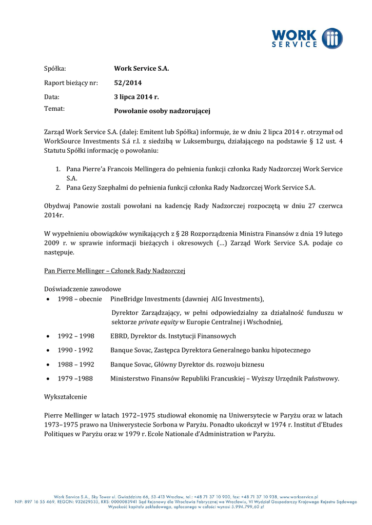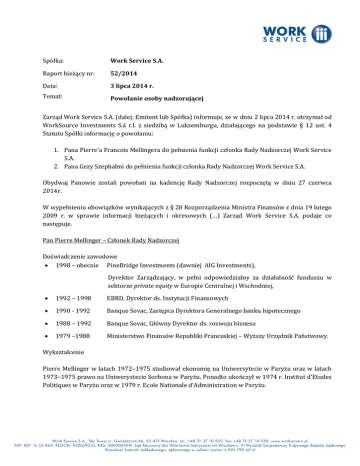 Spółka: Work Service S.A. Raport bieżący nr: 52/2014 Data: 3 lipca 2014 r. Temat: Powołanie osoby nadzorującej Zarząd Work Service S.A. (dalej: Emitent lub Spółka) informuje, że w dniu 2 lipca 2014 r. otrzymał od WorkSource Investments S.á r.l. z siedzibą w Luksemburgu, działającego na podstawie § 12 ust. 4 Statutu Spółki informację o powołaniu: 1. Pana Pierre’a Francois Mellingera do pełnienia funkcji członka Rady Nadzorczej Work Service S.A. 2. Pana Gezy Szephalmi do pełnienia funkcji członka Rady Nadzorczej Work Service S.A. Obydwaj Panowie zostali powołani na kadencję Rady Nadzorczej rozpoczętą w dniu 27 czerwca 2014r. W wypełnieniu obowiązków wynikających z § 28 Rozporządzenia Ministra Finansów z dnia 19 lutego 2009 r. w sprawie informacji bieżących i okresowych (…) Zarząd Work Service S.A. podaje co następuje. Pan Pierre Mellinger – Członek Rady Nadzorczej Doświadczenie zawodowe 1998 – obecnie PineBridge Investments (dawniej AIG Investments), Dyrektor Zarządzający, w pełni odpowiedzialny za działalność funduszu w sektorze private equity w Europie Centralnej i Wschodniej, 1992 – 1998 EBRD, Dyrektor ds. Instytucji Finansowych 1990 - 1992 Banque Sovac, Zastępca Dyrektora Generalnego banku hipotecznego 1988 – 1992 Banque Sovac, Główny Dyrektor ds. rozwoju biznesu 1979 –1988 Ministerstwo Finansów Republiki Francuskiej – Wyższy Urzędnik Państwowy. Wykształcenie Pierre Mellinger w latach 1972–1975 studiował ekonomię na Uniwersytecie w Paryżu oraz w latach 1973–1975 prawo na Uniwerystecie Sorbona w Paryżu. Ponadto ukończył w 1974 r. Institut d’Etudes Politiques w Paryżu oraz w 1979 r. Ecole Nationale d’Administration w Paryżu. Członek Rad Nadzorczych w następujących podmiotach: Nazwa UTI Group Digital Cable Systems S.A. Orzel Bialy S.A. Czerwona Torebka S.A. Promedica Care sp. z o.o. Care Investments sp. z o.o. EasyPack sp. z o.o. Kraj Romania Romania Poland Poland Poland Poland Poland Stanowisko Członek Rady Nadzorczej Członek Rady Nadzorczej Członek Rady Nadzorczej Członek Rady Nadzorczej Członek Rady Nadzorczej Członek Rady Nadzorczej Zastępca Przewodniczącego Rady Nadzorczej Data powołania 2006 2007 2008 2009 2010 2010 2012 Zgodnie z oświadczeniem złożonym przez powołanego członka Rady Nadzorczej, Pan Mellinger: 1. posiada pełną zdolność do czynności prawnych; 2. nie był karany za przestępstwa określone w przepisach rozdziałów XXXIII – XXXVII Kodeksu karnego oraz art. 585, 587, 590, 591 Kodeksu spółek handlowych; 3. nie prowadzi działalności konkurencyjnej wobec Spółki, jak również nie uczestniczy w spółce konkurencyjnej jako wspólnicy spółki cywilnej, spółki osobowej lub jako członek organu konkurencyjnej spółki kapitałowej lub członek organu jakiejkolwiek konkurencyjnej osoby prawnej; 4. nie jest wpisany do Rejestru Dłużników Niewypłacalnych prowadzonego na podstawie przepisów ustawy z dnia 20 sierpnia 1997 roku o Krajowym Rejestrze Sądowym (tekst jednolity: Dz. U. z 2007 roku Nr 168, poz. 1186 z późn. zm.); 5. nie pełni funkcji i nie zajmuje stanowisk określonych w art. 1 oraz art. 2 ustawy z dnia 21 sierpnia 1997 r. o ograniczeniu prowadzenia działalności gospodarczej przez osoby pełniące funkcje publiczne; 6. posiada powiązania z akcjonariuszem Spółki posiadającym akcje reprezentujące nie mniej niż 5 % głosów na walnym zgromadzeniu Spółki – jest członkiem organów WorkSource Investments S.a r. l. Pan Geza Szephalmi – członek Rady Nadzorczej Dr Geza Szephalmi jest absolwentem Prawa i Nauk Politycznych Uniwersytetu im. Loránd Eötvös w Budapeszcie (ELTE University). Ukończył studia podyplomowe w zakresie Międzynarodowych Transakcji Handlowych na Uniwersytecie w Innsbrucku (Austria) oraz Międzynarodowego Prawa Handlowego na Uniwersytecie w Bristolu (Wielka Brytania). Geza Szephalmi dołączył do PineBridge Investments w 1998 roku. Obecnie pełni funkcję Dyrektora Zarządzającego w PineBridge Investments (globalnym funduszu private equity), Alternatywne Inwestycje dla obszaru Europy Środkowej, a także jest Starszym Doradcą (Senior Advisor) PineBridge dla obszaru Rosji oraz Wspólnoty Niepodległych Państw. Od 2013 roku pełni również funkcję członka Rady Nadzorczej Orzeł Biały s.a. Czerwona Torebka s.a. W przeszłości Geza Szephalmi pełnił funkcję Przewodniczącego stowarzyszenia Hungarian Venture Capital and Private Equity Association (HVCA), a następnie Przewodniczącego Komisji ds. Etycznych i Zawodowych Standardów powołanej przy tym Stowarzyszeniu; ponadto był członkiem Rady ds. Biznesu przy Organizacji Współpracy Gospodarczej i Rozwoju (OECD), a także Wiceprzewodniczącym International Energy Charter Transit Group (organizacji o zasięgu międzynarodowym regulującej kwestie energetyczne). Geza Szphalmi zasiadał także w zarządzie TriGranit (największego dewelopera nieruchomości komercyjnych w Europie Środkowej) i Waberer's (wiodącej firmy spedycyjnej i grupy logistycznej w Europie Środkowej i Wschodniej), był także Prezesem Zarządu Magyar Hírlap (wydawcy węgierskiego dziennika politycznego). Przed rozpoczęciem współpracy z PineBridge pełnił funkcję Country Manager’a w przedsiębiorstwie Central Europe Trust i był odpowiedzialny za otwarcie przedstawicielstw tego podmiotu w Sofii, Bukareszcie oraz Istambule. Zgodnie z oświadczeniem złożonym przez powołanego członka Rady Nadzorczej, Pan Geza Szephalmi: 1. posiada pełną zdolność do czynności prawnych; 2. nie był karany za przestępstwa określone w przepisach rozdziałów XXXIII – XXXVII Kodeksu karnego oraz art. 585, 587, 590, 591 Kodeksu spółek handlowych; 3. nie prowadzi działalności konkurencyjnej wobec Spółki, jak również nie uczestniczy w spółce konkurencyjnej jako wspólnicy spółki cywilnej, spółki osobowej lub jako członek organu konkurencyjnej spółki kapitałowej lub członek org