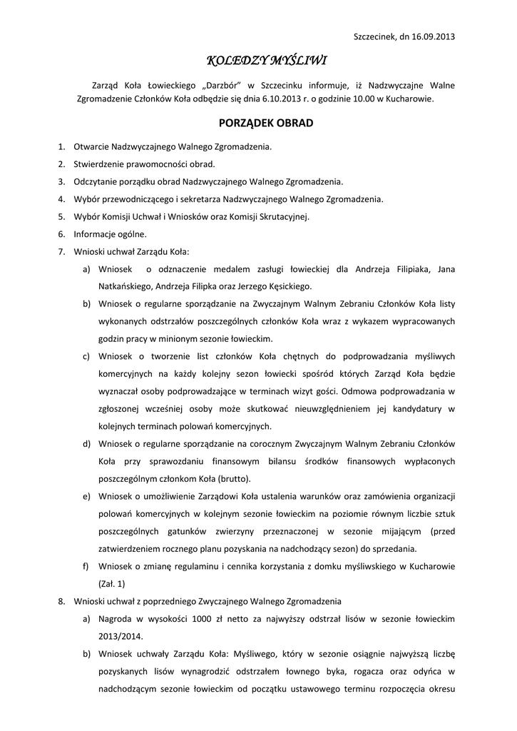 Szczecinek, dn 16.09.2013 KOLEDZY MYŚLIWI Zarząd Koła Łowieckiego „Darzbór” w Szczecinku informuje, iż Nadzwyczajne Walne Zgromadzenie Członków Koła odbędzie się dnia 6.10.2013 r. o godzinie 10.00 w Kucharowie. PORZĄDEK OBRAD 1. Otwarcie Nadzwyczajnego Walnego Zgromadzenia. 2. Stwierdzenie prawomocności obrad. 3. Odczytanie porządku obrad Nadzwyczajnego Walnego Zgromadzenia. 4. Wybór przewodniczącego i sekretarza Nadzwyczajnego Walnego Zgromadzenia. 5. Wybór Komisji Uchwał i Wniosków oraz Komisji Skrutacyjnej. 6. Informacje ogólne. 7. Wnioski uchwał Zarządu Koła: a) Wniosek o odznaczenie medalem zasługi łowieckiej dla Andrzeja Filipiaka, Jana Natkańskiego, Andrzeja Filipka oraz Jerzego Kęsickiego. b) Wniosek o regularne sporządzanie na Zwyczajnym Walnym Zebraniu Członków Koła listy wykonanych odstrzałów poszczególnych członków Koła wraz z wykazem wypracowanych godzin pracy w minionym sezonie łowieckim. c) Wniosek o tworzenie list członków Koła chętnych do podprowadzania myśliwych komercyjnych na każdy kolejny sezon łowiecki spośród których Zarząd Koła będzie wyznaczał osoby podprowadzające w terminach wizyt gości. Odmowa podprowadzania w zgłoszonej wcześniej osoby może skutkować nieuwzględnieniem jej kandydatury w kolejnych terminach polowań komercyjnych. d) Wniosek o regularne sporządzanie na corocznym Zwyczajnym Walnym Zebraniu Członków Koła przy sprawozdaniu finansowym bilansu środków finansowych wypłaconych poszczególnym członkom Koła (brutto). e) Wniosek o umożliwienie Zarządowi Koła ustalenia warunków oraz zamówienia organizacji polowań komercyjnych w kolejnym sezonie łowieckim na poziomie równym liczbie sztuk poszczególnych gatunków zwierzyny przeznaczonej w sezonie mijającym (przed zatwierdzeniem rocznego planu pozyskania na nadchodzący sezon) do sprzedania. f) Wniosek o zmianę regulaminu i cennika korzystania z domku myśliwskiego w Kucharowie (Zał. 1) 8. Wnioski uchwał z poprzedniego Zwyczajnego Walnego Zgromadzenia a) Nagroda w wysokości 1000 zł netto za najwyższy odstrzał lisów w sezonie łowieckim 2013/2014. b) Wniosek uchwały Zarządu Koła: Myśliwego, który w sezonie osiągnie najwyższą liczbę pozyskanych lisów wynagrodzić odstrzałem łownego byka, rogacza oraz odyńca w nadchodzącym sezonie łowieckim od początku ustawowego terminu rozpoczęcia okresu polowań na wymienione gatunki oraz zwolnieniem z obowiązku wykonywania prac gospodarczych. c) Wnioski uchwał dot. „rewirów” I. Polujemy wyłącznie na 2-3 osobowych rewirach, dopuszcza się polowanie na innych rewirach za zgodą gospodarza rewiru. W razie szkód łowieckich lub braku aktywności myśliwych na danym rewirze łowczy kieruje do danego rewiru innych myśliwych. II. Podzielenie obwodów na rewiry, nazwanie ich. Wszyscy myśliwi mają prawo zapisywania się na wolny rewir. Kolejny myśliwy chcący polować na zajętym już rewirze danego dnia musi skontaktować się z kolegą zapisanym jako pierwszy i uzyskać jego zgodę. III. Uchwała o sprecyzowaniu granic rewirów przez Zarząd Koła i wydrukowanie mapki. IV. O terminie otwierania rewirów każdorazowo decyduje Zarząd Koła w zależności od stopnia realizacji planu łowieckiego. V. Propozycja uchwały zarządu Koła: - Zarząd Koła dzieli dzierżawione przez Koło obwody łowieckie na rewiry gospodarcze o porównywalnej wielkości. - Do każdego rewiru przydzielani są poszczególni członkowie Koła wg podziału w Zał. 2. - Spośród wybranych członków do danego rewiru gospodarczego Zarząd Koła wybiera kierownika rewiru, który zostaje wyznaczony do organizacji prac gospodarczych wszystkich członków na tym samym rewirze i utrzymania urządzeń łowieckich w dobrym stanie technicznym oraz budowy urządzeń w wyznaczonych lokalizacjach przez Zarząd Koła. - Uwzględniając zdanie kierowników rewirów zarząd Koła dokona podziału rewirów na oznaczone łowiska, które pełnić będą rolę precyzyjnego określenia miejsca polowania stosowanego w książce ewidencji wyjść w łowisko. - Zarząd wykona mapę podziału obwodów na rewiry i łowiska. Każdy członek Koła otrzyma po 2 egzemplarze podręcznej mapy. W Kucharowie przy domku zostanie umieszczona tablica informacyjna z widokiem mapy i jej podziału. Przy każdej książce ewidencji wyjść w łowisko zostanie umieszczona mapa danego obwodu. 9. Wniosek Kol. Eugeniusza Szarka o zwolnienie z wymogu wykonywania prac gospodarczych oraz karty pracy 10. Omówienie i zatwierdzenie propozycji budżetu organizacji jubileuszu 60-lecia Koła 11. Omówienie kalendarza polowań zbiorowych 12. Wolne wnioski 13. Odczytanie zatwierdzonych uchwał oraz propozycji uchwał do zatwierdzenia na najbliższym Walnym Zgromadzeniu 14. Zatwierdzenie protokołu z poprzedniego Walnego Zgromadzenia. 15. Zakończenie Zebrania Zał. 1 REGULAMIN i CENNIK KORZYSTANIA Z DOMKU MYŚŁIWSKIEGO W KUCHAROWIE 1. Regulamin a) b) c) d) każdy z członków Koła dba o mienie Koła jakim jest domek myśliwski w Kucharowie każdy z członków Koła dba o teren otaczający domek wraz z wszelkimi budynkami gospodarczymi gospodarza domku wybiera Zarząd Koła gospodarz prowadzi zeszyt z ewidencją wynajmu domku dla myśliwych – data wynajmu, ile osób wynajmowało z rozróżnieniem na kategorie + suma opłat, podpis wynajmującego i gospodarza e) zeszyt z ewidencją kontroluje Komisja Rewizyjna przed wiosennym Walnym Zgromadzeniem Członków Koła – Komisja przedstawia wyniki kontroli dla WZ f) wynajmujący ponosi koszty zużytej energii podczas gdy wynajmował domek wg wskazań licznika. g) za wszelkie wyrządzone straty/zniszczenia/kradzieże odpowiada myśliwy wynajmujący domek – gospodarz sprawdza stan, a w razie ewentualnych strat/zniszczeń/kradzieży zgłasza o fakcie Zarządowi Koła – Zarząd obciąża myśliwego, który wynajmował domek h) myśliwy wynajmujący domek ma obowiązek pozostawić porządek po s