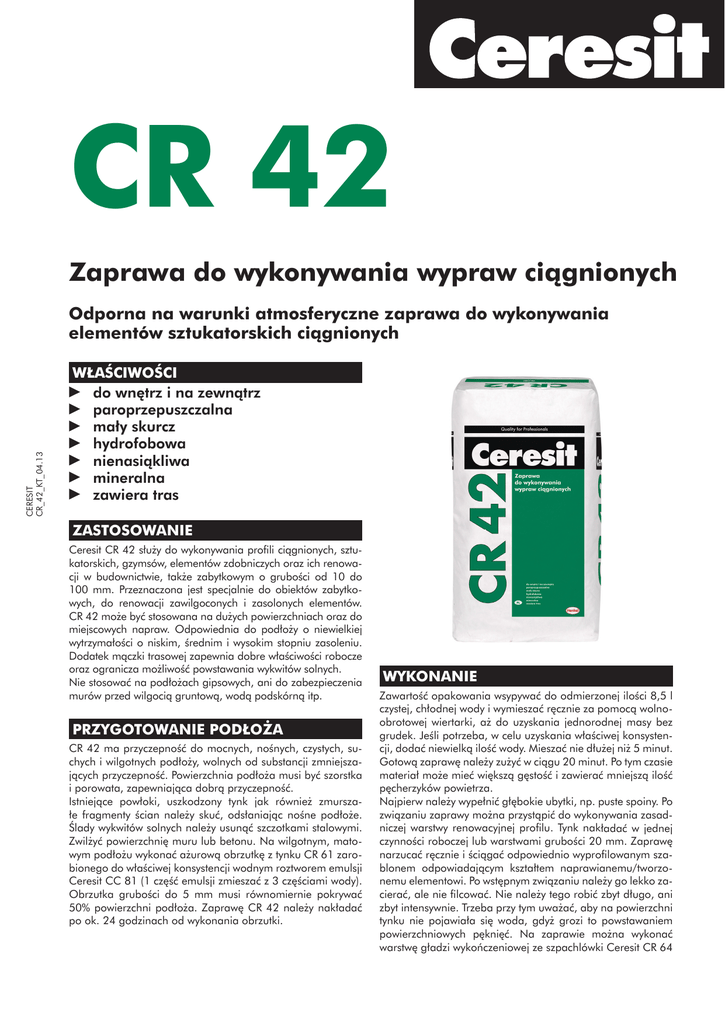 CR 42 Zaprawa do wykonywania wypraw ciągnionych CERESIT CR_42_KT_04.13 Odporna na warunki atmosferyczne zaprawa do wykonywania elementów sztukatorskich ciągnionych WŁAŚCIWOŚCI do wnętrz i na zewnątrz paroprzepuszczalna mały skurcz hydrofobowa nienasiąkliwa mineralna zawiera tras ZASTOSOWANIE Ceresit CR 42 służy do wykonywania profili ciągnionych, sztukatorskich, gzymsów, elementów zdobniczych oraz ich renowacji w budownictwie, także zabytkowym o grubości od 10 do 100 mm. Przeznaczona jest specjalnie do obiektów zabytkowych, do renowacji zawilgoconych i zasolonych elementów. CR 42 może być stosowana na dużych powierzchniach oraz do miejscowych napraw. Odpowiednia do podłoży o niewielkiej wytrzymałości o niskim, średnim i wysokim stopniu zasoleniu. Dodatek mączki trasowej zapewnia dobre właściwości robocze oraz ogranicza możliwość powstawania wykwitów solnych. Nie stosować na podłożach gipsowych, ani do zabezpieczenia murów przed wilgocią gruntową, wodą podskórną itp. PRZYGOTOWANIE PODŁOŻA CR 42 ma przyczepność do mocnych, nośnych, czystych, suchych i wilgotnych podłoży, wolnych od substancji zmniejszających przyczepność. Powierzchnia podłoża musi być szorstka i porowata, zapewniająca dobrą przyczepność. Istniejące powłoki, uszkodzony tynk jak również zmurszałe fragmenty ścian należy skuć, odsłaniając nośne podłoże. Ślady wykwitów solnych należy usunąć szczotkami stalowymi. Zwilżyć powierzchnię muru lub betonu. Na wilgotnym, matowym podłożu wykonać ażurową obrzutkę z tynku CR 61 zarobionego do właściwej konsystencji wodnym roztworem emulsji Ceresit CC 81 (1 część emulsji zmieszać z 3 częściami wody). Obrzutka grubości do 5 mm musi równomiernie pokrywać 50% powierzchni podłoża. Zaprawę CR 42 należy nakładać po ok. 24 godzinach od wykonania obrzutki. WYKONANIE Zawartość opakowania wsypywać do odmierzonej ilości 8,5 l czystej, chłodnej wody i wymieszać ręcznie za pomocą wolnoobrotowej wiertarki, aż do uzyskania jednorodnej masy bez grudek. Jeśli potrzeba, w celu uzyskania właściwej konsystencji, dodać niewielką ilość wody. Mieszać nie dłużej niż 5 minut. Gotową zaprawę należy zużyć w ciągu 20 minut. Po tym czasie materiał może mieć większą gęstość i zawierać mniejszą ilość pęcherzyków powietrza. Najpierw należy wypełnić głębokie ubytki, np. puste spoiny. Po związaniu zaprawy można przystąpić do wykonywania zasadniczej warstwy renowacyjnej profilu. Tynk nakładać w jednej czynności roboczej lub warstwami grubości 20 mm. Zaprawę narzucać ręcznie i ściągać odpowiednio wyprofilowanym szablonem odpowiadającym kształtem naprawianemu/tworzonemu elementowi. Po wstępnym związaniu należy go lekko zacierać, ale nie filcować. Nie należy tego robić zbyt długo, ani zbyt intensywnie. Trzeba przy tym uważać, aby na powierzchni tynku nie pojawiała się woda, gdyż grozi to powstawaniem powierzchniowych pęknięć. Na zaprawie można wykonać warstwę gładzi wykończeniowej ze szpachlówki Ceresit CR 64 UWAGA Prace należy wykonywać w suchych warunkach, w temperaturze powietrza i podłoża od +5°C do +25°C. Wszelkie dane odnoszą się do temperatury +23°C i wilgotności względnej powietrza 50%. W innych warunkach należy uwzględnić szybsze lub wolniejsze twardnienie materiału. Nie mieszać z innymi materiałami. Nie pokrywać materiałami zawierającymi gips. Maksymalna grubość pojedynczego elementu nie może przekraczać 100 mm. CR 42 zawiera cement i zmieszany z wodą ma odczyn alkaliczny. W związku z tym należy chronić naskórek i oczy. Zabrudzenia dokładnie myć wodą. W przypadku kontaktu z oczami płukać je obficie wodą i zasięgnąć porady lekarza. Zawartość chromu VI – poniżej 2 ppm w okresie ważności wyrobu. ZALECENIA Niniejsza karta techniczna określa zakres stosowania materiału i sposób prowadzenia robót, ale nie może zastąpić zawodowego przygotowania wykonawcy. Oprócz podanych informacji prace należy wykonywać zgodnie ze sztuką budowlaną i zasadami BHP. Producent gwarantuje jakość wyrobu, natomiast nie ma wpływu na warunki i sposób jego użycia. W przypadku wątpliwości należy wykonać własne próby stosowania. Wraz z ukazaniem się tej karty technicznej tracą ważność karty wcześniejsze. SKŁADOWANIE Do 12 miesięcy od daty produkcji, przy składowaniu na paletach, w suchych, chłodnych warunkach i w oryginalnych nieuszkodzonych opakowaniach. OPAKOWANIA DANE TECHNICZNE Baza: mieszanka mineralnych spoiw, wypełniaczy mineralnych i modyfikatorów Kolor: szaro-beżowy Gęstość nasypowa: ok. 0,85 ± 10% kg/dm3 Proporcje mieszania: ok. 8,5 l wody na 25 kg Temperatura stosowania: od +5°C do +25°C Czas zużycia: ok. 20 min Reakcja na ogień: Klasa A2 Gęstość wysuszonej, stwardniałej zaprawy (wg PN-EN 998-1): 1,30 kg/dm3 Wytrzymałość na ściskanie po 28 dniach (wg PN-EN 998-1): CS II Absorpcja wody (wg PN-EN 998-1): W2 Przyczepność (wg PN-EN 998-1): 0,4 N/mm2 – FP:B Współczynnik przepuszczalności pary wodnej μ (wg PN-EN 998-1): - μ (nasycony roztwór KNO3): 7 - μ (nasycony roztwór LiCl): 8 Współczynnik przewodzenia ciepła l10,dry (wg PN-EN 998-1): 0,47 W/mK (wartość tabelaryczna) Zawartość porów powietrza w świeżej zaprawie (wg PN-EN 998-1): ok. 50 % Zawartość porów powietrza w związanej zaprawie: powyżej 40% Trwałość (odporność na zamrażanie-odmrażanie) wg PN-85/B-04500: - ubytek masy: -0,5 % - zmiana wytrzymałości na zginanie: -8 % - zmiana wytrzymałości na ściskanie: -5 % Opór dyfuzyjny względny Sd: 0,2 m Orientacyjne zużycie: ok. 8,0 kg/m2 na każdy cm grubości zaprawy (z 1 kg CR 42 uzyskuje się ok. 1,25 dm3 świeżej zaprawy) Worki 25 kg. Zaprawa tynkarska PN-EN 998-1:2012. lekka (LW). Wyrób zgodny z normą CERESIT CR_42_KT_04.13 grubości do 5 mm. Wtedy jednak świeżą warstwę CR 42, w celu uzyskania dobrej przyczepności g