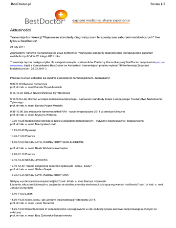 BestDoctor.pl Strona 1/2 Aktualności Transmisja konferencji "Najnowsze standardy diagnostyczne i terapeutyczne zaburzeń metabolicznych" live tylko w BestDoctor! 24 luty 2011 Zapraszamy Państwa na transmisję na żywo konferencji "Najnowsze standardy diagnostyczne i terapeutyczne zaburzeń metabolicznych" dnia 26 lutego 2011 roku. Transmisja będzie dostępna tylko dla zarejestrowanych użytkowników Platformy Komunikacyjnej BestDoctor bezpośrednio pod tym odnośnikiem, bądź z Komunikatora BestDoctor (w Kontaktach i transmisjach prosimy wybrać "III Konferencja Zaburzeń Metabolicznych - 26.02.2011"). Przekaz na żywo odbędzie się zgodnie z poniższym harmonogramem. Zapraszamy! 9.00-9.10 Otwarcie Konferencji prof. dr hab. n. med.Danuta Pupek-Musialik 9.10-10.40 SESJA NADCIŚNIENIA TĘTNICZEGO 9.10-9.35 Leki złożone w terapii nadciśnienia tętniczego - najnowsze standardy terapii Europejskiego Towarzystwa Nadciśnienia Tętniczego prof. dr hab. n. med. Danuta Pupek-Musialik 9.35-10.00 Jak skutecznie hamować układ RAA - opcje terapeutyczne 2011 w praktyce klinicznej prof. dr hab. n. med. Krystyna Widecka 10.00-10.25 Nadciśnienie tętnicze u dzieci z zespołem metabolicznym - wytyczne diagnostyczne i terapeutyczne prof. dr hab. n. med. Mieczysław Litwin 10.25-10.40 Dyskusja 10.40-11.00 Przerwa 11.00-12.00 SESJA SATELITARNA FIRMY BERLIN-CHEMIE prof. dr hab. n. med. Beata Wożakowska-Kapłon 12.00-12.10 Przerwa 12.10-13.40 SESJA LIPIDOWA 12.10-12.40 Terapia skojarzona zaburzeń lipidowych - komu i kiedy? prof. dr hab. n. med. Stefan Grajek 12.40-13.40 SESJA SATELITARNA FIRMY MSD Statyny w praktyce klinicznej-komu?jaka?-prof. drhab. n. med.Dariusz Kozłowski Leczenie zaburzeń lipidowych u pacjentów ze stabilną chorobą wieńcową i cukrzycą-wyzwania i możliwości"-prof. dr hab. n. med. Janusz Gumprecht 13.40-14.00 Lunch 14.00-14.25 Kiedy, komu i jak wdrożyć insulinoterapię? Standardy 2011. prof. dr hab. n. med. Jacek Sieradzki 14.25-14.50 Hipowitaminoza D: rozpoznawanie i postępowanie w celu redukcji ryzyka sercowo-naczyniowego u chorych na cukrzycę prof. dr hab. n. med. Ewa Żukowska-Szczechowska BestDoctor.pl Strona 2/2 14.50-15.15 Trombofilia cukrzycowa - problem wciąż aktualny. dr n. med. Leszek Markuszewski 15.15-15.30 Dyskusja 15.30- 16.00Dlaczego cele leczenia cukrzycy są wciąż trudne do osiągnięcia? prof. dr hab. n. med. Jacek Sieradzki - SESJA PATRONACKA FIRMY MERCK 16.00-16.20 Przerwa 16.20 - 18.00 Interaktywne warsztaty dla specjalistów Jak skutecznie i bezpiecznie zmniejszyć ryzyko sercowo-naczyniowe u otyłych pacjentów - zasady terapii zaburzeń lipidowych dr n. med. Katarzyna Musialik - prezentacja przypadku dr n. med. Paweł Bogdański - komentarz Nowe horyzonty terapii cukrzycy typu 2 skojarzonej z otyłością. dr n. med. Katarzyna Musialik - prezentacja przypadku dr n. med. Magdalena Kujawska-Łuczak - komentarz Skuteczne leczenie pacjentów problematycznie otyłych. Pogląd lekarza i psychologa. dr hab. n. med. Lucyna Ostrowska,dr n. hum. Monika Bąk-Sosnowska 18.00 Zakończenie Konferencji Lista aktualności [http://www.bestdoctor.pl/transmisja_konferencji_najnowsze_standardy_diagnostyczne_i_terapeutyczne_zaburzen_metabolicznych_live_tylko_w_bestdoctor_.xml]