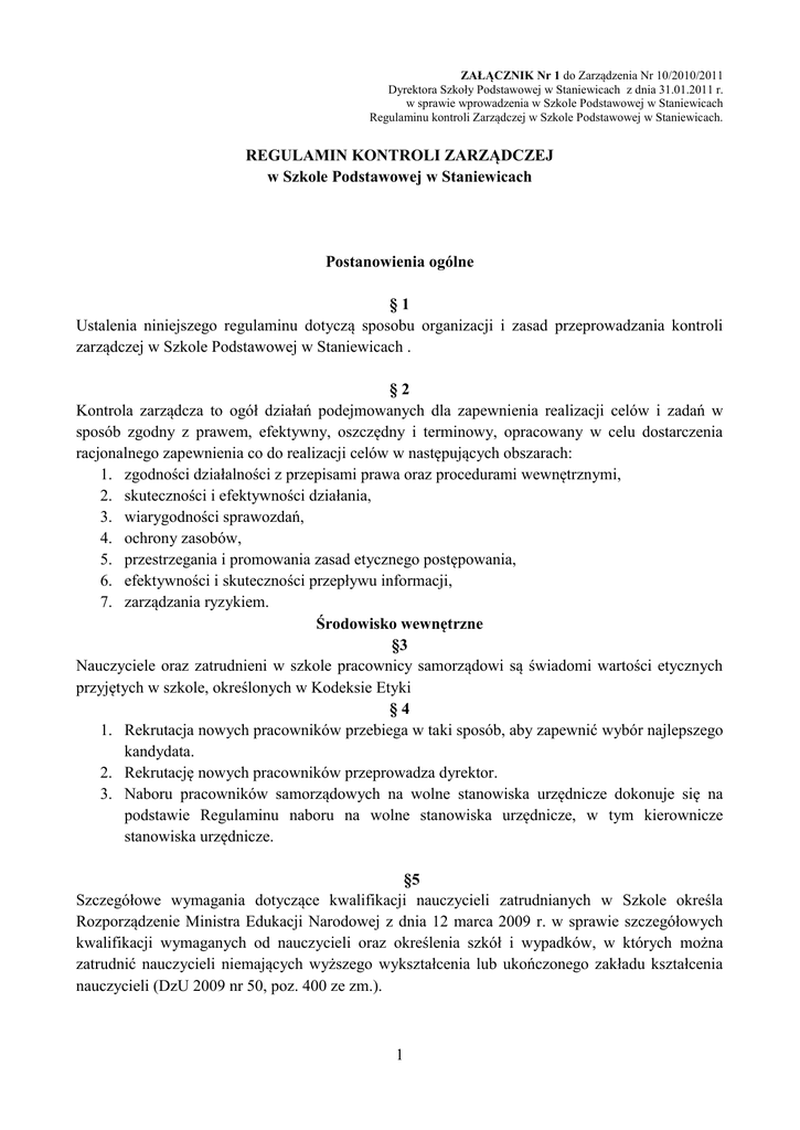 ZAŁĄCZNIK Nr 1 do Zarządzenia Nr 10/2010/2011 Dyrektora Szkoły Podstawowej w Staniewicach z dnia 31.01.2011 r. w sprawie wprowadzenia w Szkole Podstawowej w Staniewicach Regulaminu kontroli Zarządczej w Szkole Podstawowej w Staniewicach. REGULAMIN KONTROLI ZARZĄDCZEJ w Szkole Podstawowej w Staniewicach Postanowienia ogólne §1 Ustalenia niniejszego regulaminu dotyczą sposobu organizacji i zasad przeprowadzania kontroli zarządczej w Szkole Podstawowej w Staniewicach . §2 Kontrola zarządcza to ogół działań podejmowanych dla zapewnienia realizacji celów i zadań w sposób zgodny z prawem, efektywny, oszczędny i terminowy, opracowany w celu dostarczenia racjonalnego zapewnienia co do realizacji celów w następujących obszarach: 1. zgodności działalności z przepisami prawa oraz procedurami wewnętrznymi, 2. skuteczności i efektywności działania, 3. wiarygodności sprawozdań, 4. ochrony zasobów, 5. przestrzegania i promowania zasad etycznego postępowania, 6. efektywności i skuteczności przepływu informacji, 7. zarządzania ryzykiem. Środowisko wewnętrzne §3 Nauczyciele oraz zatrudnieni w szkole pracownicy samorządowi są świadomi wartości etycznych przyjętych w szkole, określonych w Kodeksie Etyki §4 1. Rekrutacja nowych pracowników przebiega w taki sposób, aby zapewnić wybór najlepszego kandydata. 2. Rekrutację nowych pracowników przeprowadza dyrektor. 3. Naboru pracowników samorządowych na wolne stanowiska urzędnicze dokonuje się na podstawie Regulaminu naboru na wolne stanowiska urzędnicze, w tym kierownicze stanowiska urzędnicze. §5 Szczegółowe wymagania dotyczące kwalifikacji nauczycieli zatrudnianych w Szkole określa Rozporządzenie Ministra Edukacji Narodowej z dnia 12 marca 2009 r. w sprawie szczegółowych kwalifikacji wymaganych od nauczycieli oraz określenia szkół i wypadków, w których można zatrudnić nauczycieli niemających wyższego wykształcenia lub ukończonego zakładu kształcenia nauczycieli (DzU 2009 nr 50, poz. 400 ze zm.). 1 Szczegółowe wymagania dotyczące awansu zawodowego nauczycieli są określone w Rozporządzeniu Ministra Edukacji Narodowej z dnia 1 grudnia 2004 r. w sprawie uzyskiwania stopni awansu zawodowego nauczycieli (DzU 2004 nr 260, poz. 2593 ze zm.). Kwalifikacje zatrudnionych w Szkole pracowników samorządowych określa Ustawa z dnia 21 listopada 2008 r. o pracownikach samorządowych (DzU 2008 nr 223, poz. 1458) oraz Rozporządzenie Rady Ministrów z dnia 18 marca 2009 r. w sprawie wynagradzania pracowników samorządowych (DzU 2009 nr 50, poz. 398 ze zm.). §6 Szczegółowe regulacje dotyczące oceny pracy nauczyciela zawiera Rozporządzenie Ministra Edukacji Narodowej z dnia 2 listopada 2000 r. w sprawie kryteriów i trybu dokonywania oceny pracy nauczyciela, trybu postępowania odwoławczego oraz składu i sposobu powoływania zespołu oceniającego (DzU 2000 nr 98, poz. 1066 ze zm.). Praca pracownika samorządowego Szkoły podlega ocenie na zasadach określonych w Regulaminie przeprowadzania oceny okresowej pracowników samorządowych. §7 Strukturę organizacyjną szkoły, szczegółowy zakres kompetencji dyrektora i pracowników pedagogicznych określa Statut Szkoły Podstawowej w Staniewicach. Każdy pracownik Szkoły posiada sformułowany na piśmie zakres obowiązków, uprawnień i odpowiedzialności, przyjęty potwierdzonym podpisem pracownika. §8 Delegowanie uprawnień w Szkole odbywa się na zasadach określonych w Regulaminie pracy Szkoły Podstawowej w Staniewicach. Upoważnienia i pełnomocnictwa nadawane są w sposób: 1. jednoznacznie wskazujący zakres uprawnienia; 2. uwzględniający odpowiedni poziom uprawnienia do wagi podejmowanych decyzji. Cele i zarządzanie ryzykiem Misja szkoły określona jest w Programie Wychowawczym Szkoły Podstawowej w Staniewicach. §9 1. Cele i zadania szkoły określane są w okresie nie krótszym niż rok 2. Realizację celów i zadań monitoruje się za pomocą wyznaczonych mierników. §10 1. Raz w roku dokonuje się identyfikacji ryzyka w odniesieniu do celów ustalonych w trybie określonym w § 9 regulaminu. 2. Zarządzanie ryzykiem odbywa się poprzez: identyfikację ryzyka monitorowanie realizacji zadań analizę ryzyka i podejmowanie działań zaradczych. 2 3. O terminie przeprowadzania identyfikacji ryzyka decyduje dyrektor szkoły. Zidentyfikowane ryzyka poddawane są analizie, mającej na celu określenie możliwych wystąpienia danego ryzyka. skutków § 11 1. Dyrektor szkoły na podstawie wyników analizy ryzyka i przewidywanych skutków wystąpienia danego ryzyka określa rodzaj możliwych reakcji na ryzyko ( tolerowanie, przeniesienie, wycofanie się, działanie) 2. Określane są działania, które należy podjąć w celu zmniejszenia danego ryzyka do akceptowanego poziomu. Mechanizmy kontroli § 12 Kontrolę finansową sprawuje dyrektor lub pracownicy, którzy przyjęli obowiązki w zakresie gospodarki finansowej na podstawie art. 53 ust.2 Ustawy o finansach publicznych. 1. Kontrola finansowa, jako część kontroli zarządczej, obejmuje: zapewnienie przestrzegania procedur kontroli oraz przeprowadzenie wstępnej oceny celowości zaciągania zobowiązań finansowych i dokonywania wydatków, badanie i porównywanie stanu faktycznego za stanem wymaganym, pobierania i gromadzenia środków publicznych, udzielania zamówień publicznych oraz zwrotu środków publicznych, prowadzenie gospodarki finansowej. 2. Do przeprowadzenia wstępnej oceny celowości zaciągania zobowiązań finansowych, których konsekwencją jest dokonanie wydatków ze środków publicznych, zobowiązani są: dyrektor szkoły, który przez kontrolę na etapie wstępnym i bieżącym, realizuje kontrolę zarządczą gospodarki finansowej, pracownicy odpowiedzialni za merytoryczne realizowanie zadań oraz inne upoważnione osoby. 3. Wstępna ocena celowości planowanych zobowiązań i wydatków inwestycyjnych dokonywana jest przez dyrektora szkoły już na