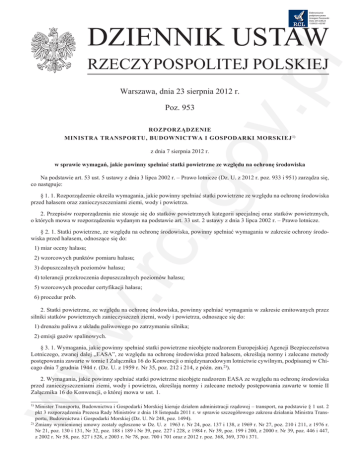 Elektronicznie podpisany przez Grzegorz Paczowski Data: 2012.08.23 15:09:55 +02'00' DZIENNIK USTAW v.p l RZECZYPOSPOLITEJ POLSKIEJ Warszawa, dnia 23 sierpnia 2012 r. Poz. 953 ROZPORZĄDZENIE MINISTRA TRANSPORTU, BUDOWNICTWA I GOSPODARKI MORSKIEJ 1) .go z dnia 7 sierpnia 2012 r. w sprawie wymagań, jakie powinny spełniać statki powietrzne ze względu na ochronę środowiska Na podstawie art. 53 ust. 5 ustawy z dnia 3 lipca 2002 r. – Prawo lotnicze (Dz. U. z 2012 r. poz. 933 i 951) zarządza się, co następuje: § 1. 1. Rozporządzenie określa wymagania, jakie powinny spełniać statki powietrzne ze względu na ochronę środowiska przed hałasem oraz zanieczyszczeniami ziemi, wody i powietrza. 2. Przepisów rozporządzenia nie stosuje się do statków powietrznych kategorii specjalnej oraz statków powietrznych, o których mowa w rozporządzeniu wydanym na podstawie art. 33 ust. 2 ustawy z dnia 3 lipca 2002 r. – Prawo lotnicze. w. rcl § 2. 1. Statki powietrzne, ze względu na ochronę środowiska, powinny spełniać wymagania w zakresie ochrony środowiska przed hałasem, odnoszące się do: 1) miar oceny hałasu; 2) wzorcowych punktów pomiaru hałasu; 3) dopuszczalnych poziomów hałasu; 4) tolerancji przekroczenia dopuszczalnych poziomów hałasu; 5) wzorcowych procedur certyfikacji hałasu; 6) procedur prób. 2. Statki powietrzne, ze względu na ochronę środowiska, powinny spełniać wymagania w zakresie emitowanych przez silniki statków powietrznych zanieczyszczeń ziemi, wody i powietrza, odnoszące się do: 1) drenażu paliwa z układu paliwowego po zatrzymaniu silnika; 2) emisji gazów spalinowych. ww § 3. 1. Wymagania, jakie powinny spełniać statki powietrzne nieobjęte nadzorem Europejskiej Agencji Bezpieczeństwa Lotniczego, zwanej dalej „EASA”, ze względu na ochronę środowiska przed hałasem, określają normy i zalecane metody postępowania zawarte w tomie I Załącznika 16 do Konwencji o międzynarodowym lotnictwie cywilnym, podpisanej w Chicago dnia 7 grudnia 1944 r. (Dz. U. z 1959 r. Nr 35, poz. 212 i 214, z późn. zm.2)). 2. Wymagania, jakie powinny spełniać statki powietrzne nieobjęte nadzorem EASA ze względu na ochronę środowiska przed zanieczyszczeniami ziemi, wody i powietrza, określają normy i zalecane metody postępowania zawarte w tomie II Załącznika 16 do Konwencji, o której mowa w ust. 1. inister Transportu, Budownictwa i Gospodarki Morskiej kieruje działem administracji rządowej – transport, na podstawie § 1 ust. 2 M pkt 3 rozporządzenia Prezesa Rady Ministrów z dnia 18 listopada 2011 r. w sprawie szczegółowego zakresu działania Ministra Transportu, Budownictwa i Gospodarki Morskiej (Dz. U. Nr 248, poz. 1494). 2) Zmiany wymienionej umowy zostały ogłoszone w Dz. U. z 1963 r. Nr 24, poz. 137 i 138, z 1969 r. Nr 27, poz. 210 i 211, z 1976 r. Nr 21, poz. 130 i 131, Nr 32, poz. 188 i 189 i Nr 39, poz. 227 i 228, z 1984 r. Nr 39, poz. 199 i 200, z 2000 r. Nr 39, poz. 446 i 447, z 2002 r. Nr 58, poz. 527 i 528, z 2003 r. Nr 78, poz. 700 i 701 oraz z 2012 r. poz. 368, 369, 370 i 371. 1) Dziennik Ustaw –2– Poz. 953 v.p l § 4. Do statków powietrznych objętych nadzorem EASA stosuje się wymagania określone w rozporządzeniu Komisji nr 1702/2003/WE z dnia 24 września 2003 r. ustanawiającym zasady wykonawcze dla certyfikacji statków powietrznych i związanych z nimi wyrobów, części i wyposażenia w zakresie zdatności do lotu i ochrony środowiska oraz dla certyfikacji organizacji projektujących i produkujących (Dz. Urz. UE L 243 z 27.09.2003, str. 6, z późn. zm.; Dz. Urz. UE Polskie wydanie specjalne, rozdz. 7, t. 7, str. 456). § 5. Rozporządzenie wchodzi w życie po upływie 14 dni od dnia ogłoszenia.3) ww w. rcl .go Minister Transportu, Budownictwa i Gospodarki Morskiej: S. Nowak 3) iniejsze rozporządzenie było poprzedzone rozporządzeniem Ministra Infrastruktury z dnia 22 kwietnia 2004 r. w sprawie wymagań, N jakie powinny spełniać statki powietrzne ze względu na ochronę środowiska (Dz. U. Nr 122, poz. 1271 oraz z 2005 r. Nr 189, poz. 1597), które zgodnie z art. 18 ustawy z dnia 30 czerwca 2011 r. o zmianie ustawy – Prawo lotnicze oraz niektórych innych ustaw (Dz. U. Nr 170, poz. 1015) traci moc z dniem wejścia w życie niniejszego rozporządzenia.