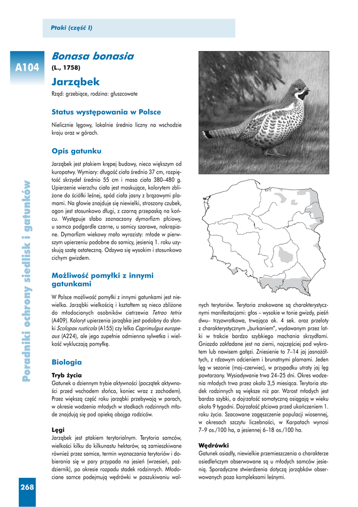 Ptaki (cz´Êç I) Bonasa bonasia A104 (L., 1758) Jarzàbek Rzàd: grzebiàce, rodzina: g∏uszcowate Status wyst´powania w Polsce Nielicznie l´gowy, lokalnie Êrednio liczny na wschodzie kraju oraz w górach. Poradniki ochrony siedlisk i gatunków Opis gatunku Jarzàbek jest ptakiem kr´pej budowy, nieco wi´kszym od kuropatwy. Wymiary: d∏ugoÊç cia∏a Êrednio 37 cm, rozpi´toÊç skrzyde∏ Êrednio 55 cm i masa cia∏a 380–480 g. Upierzenie wierzchu cia∏a jest maskujàce, kolorytem zbli˝one do Êció∏ki leÊnej, spód cia∏a jasny z bràzowymi plamami. Na g∏owie znajduje si´ niewielki, stroszony czubek, ogon jest stosunkowo d∏ugi, z czarnà przepaskà na koƒcu. Wyst´puje s∏abo zaznaczony dymorfizm p∏ciowy, u samca podgardle czarne, u samicy szarawe, nakrapiane. Dymorfizm wiekowy ma∏o wyrazisty: m∏ode w pierwszym upierzeniu podobne do samicy, jesienià 1. roku uzyskujà szat´ ostatecznà. Odzywa si´ wysokim i stosunkowo cichym gwizdem. Mo˝liwoÊç pomy∏ki z innymi gatunkami W Polsce mo˝liwoÊç pomy∏ki z innymi gatunkami jest niewielka. Jarzàbki wielkoÊcià i kszta∏tem sà nieco zbli˝one do m∏odocianych osobników cietrzewia Tetrao tetrix (A409). Koloryt upierzenia jarzàbka jest podobny do s∏onki Scolopax rusticola (A155) czy lelka Caprimulgus europeaus (A224), ale jego zupe∏nie odmienna sylwetka i wielkoÊç wykluczajà pomy∏k´. Biologia Tryb ˝ycia Gatunek o dziennym trybie aktywnoÊci (poczàtek aktywnoÊci przed wschodem s∏oƒca, koniec wraz z zachodem). Przez wi´kszà cz´Êç roku jarzàbki przebywajà w parach, w okresie wodzenia m∏odych w stadkach rodzinnych m∏ode znajdujà si´ pod opiekà obojga rodziców. L´gi Jarzàbek jest ptakiem terytorialnym. Terytoria samców, wielkoÊci kilku do kilkunastu hektarów, sà zamieszkiwane równie˝ przez samice, termin wyznaczania terytoriów i dobierania si´ w pary przypada na jesieƒ (wrzesieƒ, paêdziernik), po okresie rozpadu stadek rodzinnych. M∏odociane samce podejmujà w´drówki w poszukiwaniu wol- 268 jarzàbek nych terytoriów. Terytoria znakowane sà charakterystycznymi manifestacjami: g∏os – wysokie w tonie gwizdy, pieʃ dwu– trzyzwrotkowa, trwajàca ok. 4 sek. oraz przeloty z charakterystycznym „burkaniem”, wydawanym przez lotki w trakcie bardzo szybkiego machania skrzyd∏ami. Gniazdo zak∏adane jest na ziemi, najcz´Êciej pod wykrotem lub nawisem ga∏´zi. Zniesienie to 7–14 jaj jasno˝ó∏tych, z rdzawym odcieniem i brunatnymi plamami. Jeden l´g w sezonie (maj–czerwiec), w przypadku utraty jaj l´g powtarzany. Wysiadywanie trwa 24–25 dni. Okres wodzenia m∏odych trwa przez oko∏o 3,5 miesiàca. Terytoria stadek rodzinnych sà wi´ksze ni˝ par. Wzrost m∏odych jest bardzo szybki, a dojrza∏oÊç somatycznà osiàgajà w wieku oko∏o 9 tygodni. Dojrza∏oÊç p∏ciowa przed ukoƒczeniem 1. roku ˝ycia. Szacowane zag´szczenie populacji wiosennej, w okresach szczytu liczebnoÊci, w Karpatach wynosi 7–9 os./100 ha, a jesiennej 6–18 os./100 ha. W´drówki Gatunek osiad∏y, niewielkie przemieszczenia o charakterze osiedleƒczym obserwowane sà u m∏odych samców jesienià. Sporadyczne stwierdzenia dotyczà jarzàbków obserwowanych poza kompleksami leÊnymi. Bonasa bonasia (Jarzàbek) Zimowanie Jarzàbek zimuje na terytoriach l´gowych lub w ich najbli˝szym sàsiedztwie. Terytoria zimowiskowe sà ma∏e, wielkoÊci ok. 2 ha. Ze wzgl´du na minimalizowanie strat energetycznych, w trakcie mroênych i Ênie˝nych zim znacznà cz´Êç doby jarzàbki sp´dzajà w jamkach wygrzebanych pod Êniegiem. Wyst´powanie Siedlisko Ptak leÊny. Preferuje lasy iglaste i mieszane o zró˝nicowanym charakterze roÊlinnoÊci, z bogatym runem i podszytem. W górach si´ga górnej granicy lasów. Wi´kszoÊç populacji jarzàbka ˝yje w tajdze. Jako gatunek lasów borealnych, w Europie Ârodkowej i Zachodniej zamieszkuje lasy górskie oraz lasy nizinne o charakterze puszczaƒskim. Zasiedla te˝ niewielkie, izolowane kompleksy leÊne. Preferuje lasy o wysokim stopniu zró˝nicowania, zarówno pod wzgl´dem sk∏adu gatunkowego roÊlin, jak i zró˝nicowania wiekowego drzewostanów. Na niewielkich terytoriach, miejscach sta∏ego wyst´powania, znaleêç musi zarówno warunki do ukrycia, jak i mo˝liwoÊç zdobycia pokarmu. Funkcj´ os∏onowà w siedlisku pe∏nià najcz´Êciej m∏odsze klasy wiekowe drzewostanów iglastych, a pokarmowà – zró˝nicowane gatunkowo drzewostany liÊciaste, z silnie rozwini´tà pi´trowoÊcià. Siedliska z za∏àcznika I Dyrektywy Siedliskowej, które mogà byç istotne dla gatunku 9110 KwaÊne buczyny (Luzulo-Fagenion) 9130 ˚yzne buczyny (Dentario glandulose-Fagenion, Galio odorati-Fagenion) 9170 Gràd Êrodkowoeuropejski i subkontynentalny (Galio-Carpinetum, Tilio-Carpinetum) 9410 Górskie bory Êwierkowe (Piceion abietis cz´Êç – zbiorowiska górskie) Rozmieszczenie w Polsce Obecny area∏ jarzàbka w Polsce obejmuje trzy oddzielone od siebie regiony: region pó∏nocno-wschodni, w sk∏ad którego wchodzà: Puszcza Augustowska, Puszcza Bia∏owieska, Puszcza Piska, Puszcza Borecka, Puszcza Knyszyƒska i lasy województwa warmiƒsko-mazurskiego, region centralny – obejmujàcy Góry Âwi´tokrzyskie i ich okolice, oraz region po∏udniowy z dwoma podregionami: sudeckim i karpackim. Rozsiedlenie pionowe jarzàbka w Polsce si´ga od ni˝u, a˝ po górnà granic´ lasu (w Tatrach do 1555 m n.p.m.). Izolowane stanowiska jarzàbka spotykane sà i w innych cz´Êciach kraju, np. na Pomorzu Zachodnim, Pomorzu Ârodkowym, w Wielkopolsce i na Zamojszczyênie. Status ochronny Ochrona w Polsce: gatunek ∏owny (Dz U z 2001 r. Nr 43, poz. 488 z póên. zm.; Dz U z 2004 r. Nr 76, poz. 729) Status zagro˝enia w Europie: S gatunek niezagro˝ony, którego status ochronny jest prawdopodobnie odpowiedni BirdLife International: SPEC Dyrektywa Ptasia: Art. 4.1, za∏àcznik I Konwencja Berneƒska: za∏àcznik III A104 Poradn